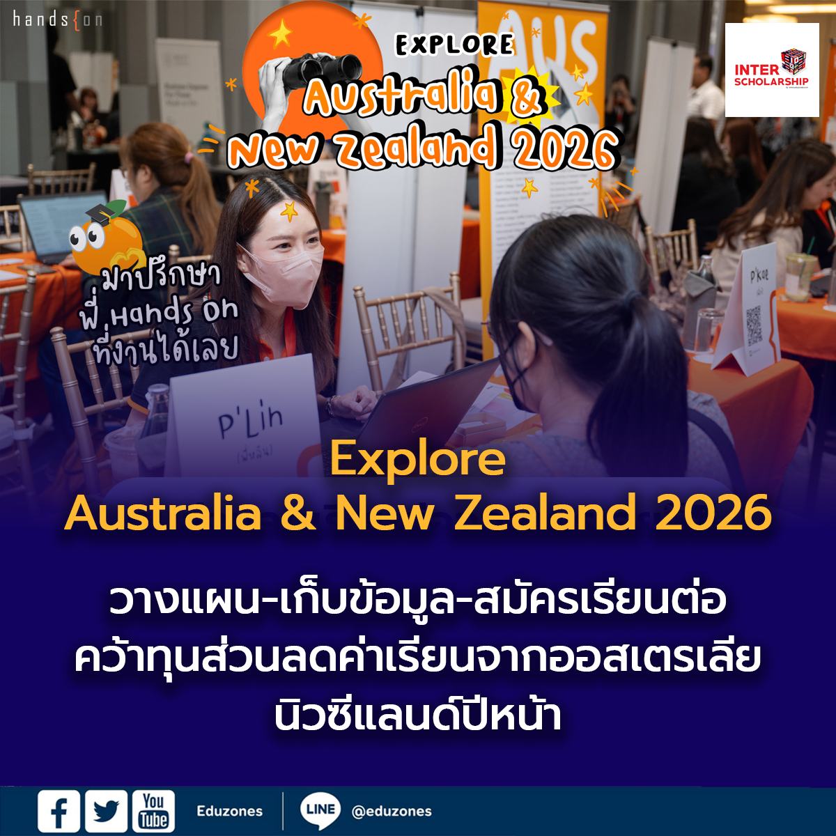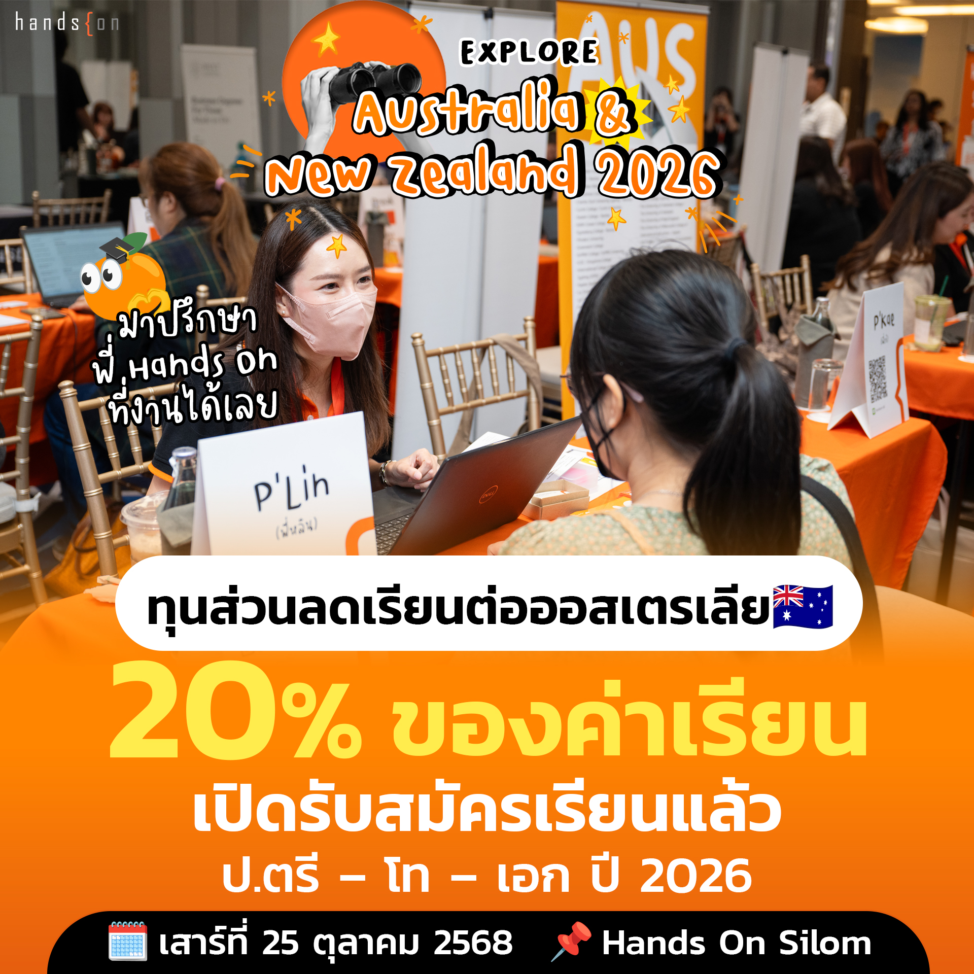 EZ Webmaster October 14, 2025 EZ Webmaster October 14, 2025 วางแผน-เก็บข้อมูล-สมัครเรียนต่อ และคว้าทุนส่วนลดค่าเรียนจากออสเตรเลียและนิวซีแลนด์ปีหน้า ที่งาน Explore Australia & New Zealand 2026 วางแผน-เก็บข้อมูล-สมัครเรียนต่อ และคว้าทุนส่วนลดค่าเรียนจากออสเตรเลียและนิวซีแลนด์ปีหน้า ที่งาน Explore Australia & New Zealand 2026 #อัปเดตข่าวเรียนต่อ ที่ Australia & New Zealand รับข้อมูลเรียนต่อของทั้งสองประเทศ เก็บ option มหา’ลัยน่าเรียนทั้งหมด ได้ลิสต์คอร์สเรียนที่ตรงกับความสนใจ เปรียบเทียบค่าใช้จ่ายในการไปเรียน สอบถามข้อมูลทุนส่วนลดจากแต่ละยู หาคำตอบจากพี่ Hands On ได้ฟรี เริ่มวางแผนเรียนต่อตัวต่อตัวกับผู้เชี่ยวชาญด้านการเรียนต่อ ของ Hands On ฟรีตลอดงาน! เสาร์ที่ 25 ตุลาคม 2568 | 13:00 – 15:00 Hands On สาขาสีลม (จอดรถฟรี 2 ชั่วโมง) BTS ศาลาแดง / MRT สีลม / จอดรถที่ตึกฟรี 2 ชม. ลงทะเบียน เข้างานฟรีที่นี่ https://handsonth.link/4n5IEzs