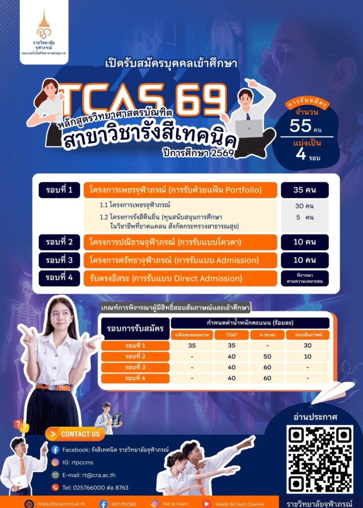EZ Webmaster October 17, 2025 EZ Webmaster October 17, 2025 ราชวิทยาลัยจุฬาภรณ์ เปิดรับสมัคร TCAS69! หลักสูตรวิทยาศาสตรบัณฑิต สาขาวิชารังสีเทคนิค ☢️ ราชวิทยาลัยจุฬาภรณ์ เปิดรับสมัคร TCAS69! หลักสูตรวิทยาศาสตรบัณฑิต สาขาวิชารังสีเทคนิคเปิดรับนักศึกษาใหม่ ประจำปีการศึกษา 2569 จำนวน 55 คน 🎓 📍 รอบที่ 1 : โครงการเพชรจุฬาภรณ์ (Portfolio) 🗓️ เปิดรับสมัคร: 1 – 26 ธันวาคม 2568รับรวม 35 คน โครงการเพชรจุฬาภรณ์ จำนวน 30 คน โครงการรังสีคืนถิ่น (ทุนกระทรวงสาธารณสุข) จำนวน 5 คน 📄 รายละเอียดเพิ่มเติม: คลิกที่นี่📘 อ่านประกาศเพิ่มเติมสำหรับโครงการรังสีคืนถิ่น: คลิกที่นี่ 📍 รอบที่ 2 : โครงการปณิธานจุฬาภรณ์ (Quota) 🗓️ เปิดรับสมัคร: 1 – 31 มีนาคม 2569รับจำนวน 10 คน 📍 รอบที่ 3 : โครงการศรัทธาจุฬาภรณ์ (Admission) 🗓️ เปิดรับสมัคร: 6 – 12 พฤษภาคม 2569รับจำนวน 10 คน 📍 รอบที่ 4 : รับตรงอิสระ (Direct Admission) 🗓️ เปิดรับสมัคร: พิจารณาตามความเหมาะสม 📞 สอบถามเพิ่มเติมได้ที่ 📱 Facebook: รังสีเทคนิค ราชวิทยาลัยจุฬาภรณ์📸 Instagram: @rtpccms📧 E-mail: rt@cra.ac.th☎ โทร. 02-576-6000 ต่อ 8763 (ในวันและเวลาราชการ)