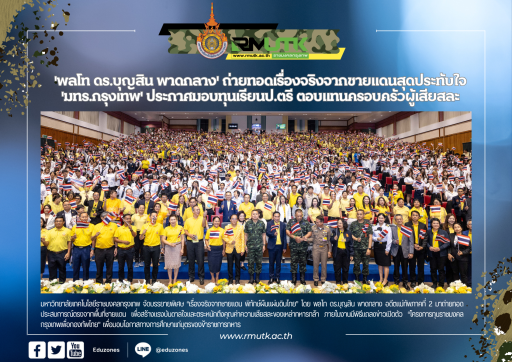 tui sakrapee October 21, 2025 tui sakrapee October 21, 2025 ราชมงคลกรุงเทพผนึกกำลังกองทัพไทย เปิด “ทุนราชมงคลกรุงเทพเพื่อกองทัพไทย” ยกย่องผู้เสียสละ สร้างโอกาสทางการศึกษาแก่บุตรข้าราชการทหาร มหาวิทยาลัยเทคโนโลยีราชมงคลกรุงเทพ จัดการบรรยายพิเศษหัวข้อ “เรื่องจริงจากชายแดน พิทักษ์ผืนแผ่นดินไทย” โดยได้รับเกียรติจาก พลโท ดร.บุญสิน พาดกลาง อดีตแม่ทัพภาคที่ 2 และที่ปรึกษาแม่ทัพภาคที่ 2 มาถ่ายทอดประสบการณ์ตรงจากพื้นที่ชายแดน เพื่อสร้างแรงบันดาลใจและตระหนักถึงคุณค่าความเสียสละของเหล่าทหารกล้า ผู้ปกป้องอธิปไตยและผืนแผ่นดินไทย ภายในงานมีพิธีแถลงข่าวเปิดตัว “โครงการทุนราชมงคลกรุงเทพเพื่อกองทัพไทย” โดย รองศาสตราจารย์ ดร.พิชัย จันทร์มณี อธิการบดีมหาวิทยาลัยเทคโนโลยีราชมงคลกรุงเทพ และ ผู้ช่วยศาสตราจารย์ชัยศักดิ์ คล้ายแดง รองอธิการบดี พร้อมด้วยคณะผู้บริหาร คณาจารย์ บุคลากร และนักศึกษาร่วมให้การต้อนรับอย่างอบอุ่น ณ หอประชุมใหญ่ พื้นที่บพิตรพิมุข มหาเมฆ เมื่อวันที่ 20 ตุลาคม 2568 ความเสียสละไม่ใช่แค่การออกรบ พลโท ดร.บุญสิน พาดกลาง ได้ขึ้นบรรยายด้วยน้ำเสียงหนักแน่นและจริงใจ ถ่ายทอดเรื่องราวจากประสบการณ์จริงในพื้นที่ชายแดนของประเทศไทย ทั้งภาคตะวันออกเฉียงเหนือและภาคใต้ ซึ่งเป็นพื้นที่ที่มีกำลังพลจำนวนมากต้องเสียสละทั้งแรงกายและชีวิตเพื่อพิทักษ์ผืนแผ่นดินไทย ท่านเล่าถึงภาพชีวิตของทหารที่ปฏิบัติหน้าที่ในพื้นที่เสี่ยงภัย ท่ามกลางความกดดัน ความโดดเดี่ยว และสภาพแวดล้อมที่ยากลำบาก แต่ทุกคนยังคงยึดมั่นในคำว่า “หน้าที่” และ “เกียรติของความเป็นทหาร” ที่ต้องปกป้องเอกราชและความสงบสุขของประชาชนไทย แม้ในบางครั้งจะต้องห่างครอบครัวหรือสูญเสียเพื่อนร่วมรบไปต่อหน้า “ชายแดนไทยไม่ใช่เพียงเส้นแบ่งเขตประเทศ แต่คือแนวชีวิตของผู้คนที่รักแผ่นดินนี้” พลโท ดร.บุญสิน กล่าวเน้น พร้อมสะท้อนว่าความมั่นคงของชาติไม่ได้ขึ้นอยู่กับกองทัพเพียงฝ่ายเดียว หากแต่ขึ้นอยู่กับความสามัคคีของคนไทยทุกคน ท่านยังได้กล่าวถึงบทเรียนจากการปฏิบัติภารกิจจริง เช่น การลาดตระเวนพื้นที่กันชน การช่วยเหลือประชาชนในหมู่บ้านชายแดน และการประสานความร่วมมือกับประเทศเพื่อนบ้าน เพื่อรักษาความสงบเรียบร้อยอย่างยั่งยืน พร้อมเล่าถึงเหตุการณ์เฉียดตายหลายครั้งที่เกิดจากการปะทะกับผู้ก่อความไม่สงบ แต่ทุกครั้ง ท่านย้ำว่าทหารไทยไม่เคยยอมถอย เพราะการรักษาแผ่นดินนี้ไว้คือเกียรติสูงสุดของชีวิต พลโท ดร.บุญสิน ยังได้ฝากข้อคิดแก่เยาวชนและนักศึกษาว่า “ความเสียสละไม่