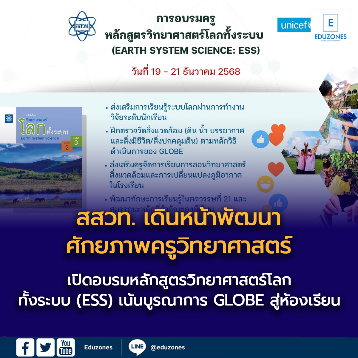 EZ Webmaster October 24, 2025 EZ Webmaster October 24, 2025 สสวท. เดินหน้าพัฒนาศักยภาพครูวิทยาศาสตร์ เปิดอบรมหลักสูตร วิทยาศาสตร์โลกทั้งระบบ (ESS) เน้นบูรณาการ GLOBE สู่ห้องเรียน สสวท. เดินหน้าพัฒนาศักยภาพครูวิทยาศาสตร์ เปิดอบรมหลักสูตร วิทยาศาสตร์โลกทั้งระบบ (ESS) เน้นบูรณาการ GLOBE สู่ห้องเรียน สถาบันส่งเสริมการสอนวิทยาศาสตร์และเทคโนโลยี (สสวท.) โดยโครงการ GLOBE รับสมัครครูเข้าร่วมอบรม “หลักสูตรวิทยาศาสตร์โลกทั้งระบบ (Earth System Science: ESS)” ระหว่างวันที่ 19 – 21 ธันวาคม 2568 ณ บ้านอัมพวา รีสอร์ท แอนด์ สปา จังหวัดสมุทรสงคราม จำนวนจำกัดเพียง 50 คน การอบรมครั้งนี้มุ่งเน้นการส่งเสริมการเรียนรู้โลกผ่านการทำงานวิจัยระดับนักเรียน การฝึกตรวจวัดสิ่งแวดล้อมตามหลักวิธีของ GLOBE และการพัฒนาสมรรถนะของผู้เรียน ดูรายละเอียดได้ที่เว็บไซต์โครงการ GLOBE https://globethailand.ipst.ac.th/news.php หรือ เพจ Globe Thailand https://www.facebook.com/globethailand2015 สมัครได้ตั้งแต่วันนี้จนถึงวันที่ 7 พฤศจิกายน 2568