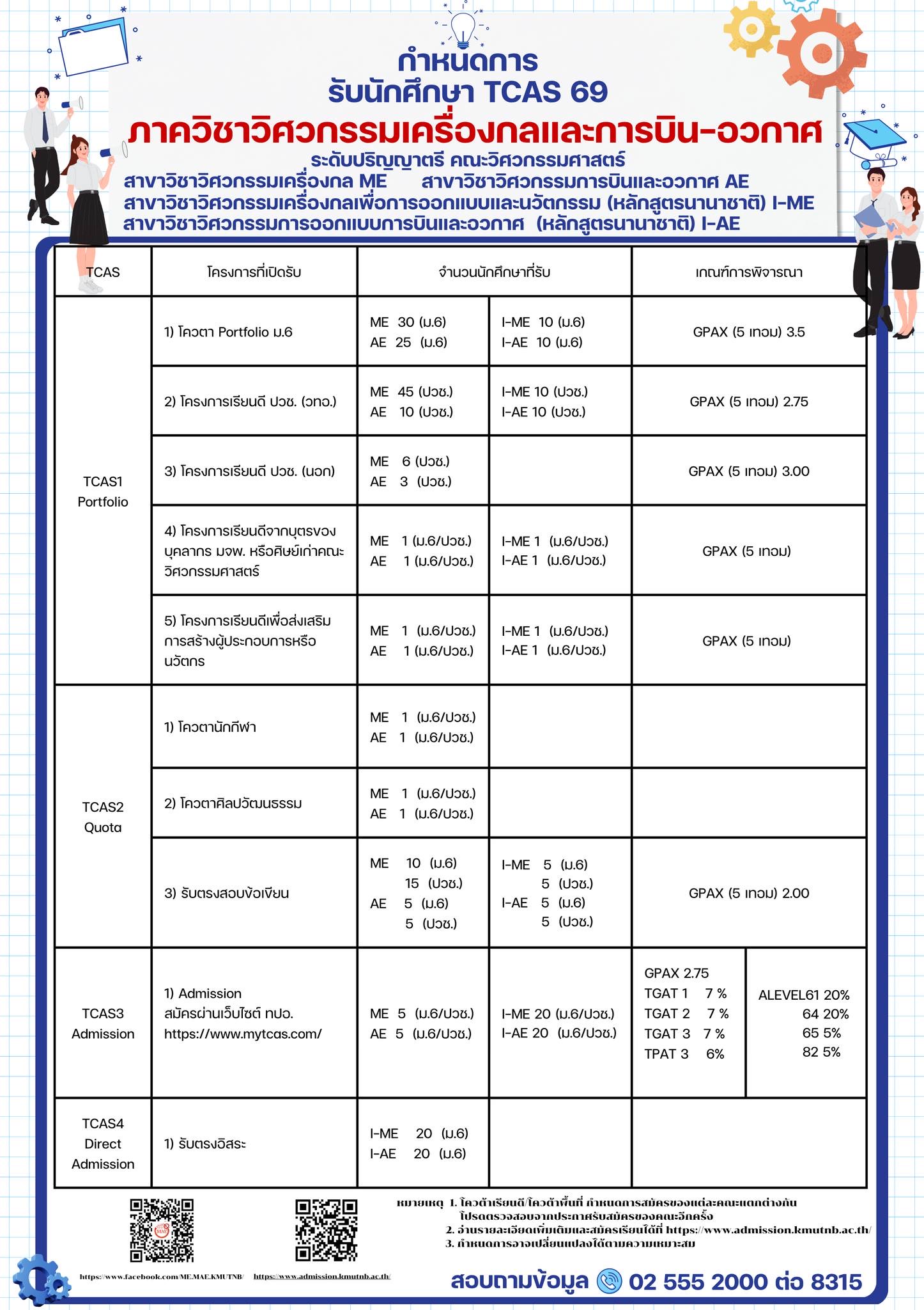 ภาควิชาวิศวกรรมเครื่องกลและการบิน-อวกาศ คณะวิศวกรรมศาสตร์ มหาวิทยาลัยเทคโนโลยีพระจอมเกล้าพระนครเหนือ (มจพ.)  เปิดรับสมัครนักศึกษา TCAS69 เข้าศึกษาต่อในระดับปริญญาตรี ใน
