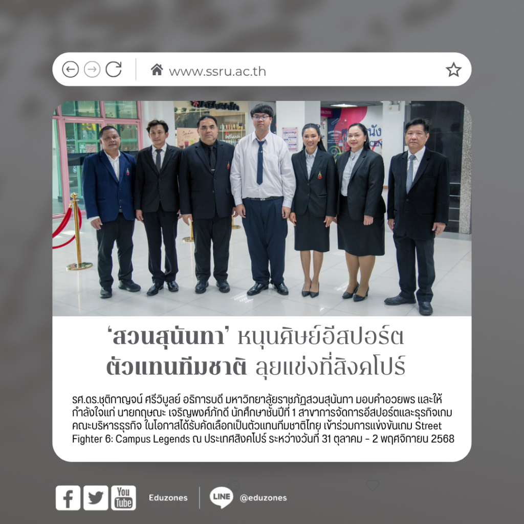 tui sakrapee October 27, 2025 tui sakrapee October 27, 2025 สวนสุนันทาหนุนศิษย์อีสปอร์ตตัวแทนทีมชาติ ลุยแข่ง Street Fighter 6 ที่สิงคโปร์ รศ.ดร.ชุติกาญจน์ ศรีวิบูลย์ อธิการบดี มหาวิทยาลัยราชภัฏสวนสุนันทา มอบคำอวยพรและให้กำลังใจแก่ นายกฤษณะ เจริญพงศ์ภักดี นักศึกษาชั้นปีที่ 1 สาขาการจัดการอีสปอร์ตและธุรกิจเกม คณะบริหารธุรกิจ ในโอกาสได้รับคัดเลือกเป็นตัวแทนทีมชาติไทย เข้าร่วมการแข่งขันเกม Street Fighter 6: Campus Legends ณ ประเทศสิงคโปร์ ระหว่างวันที่ 31 ตุลาคม – 2 พฤศจิกายน 2568 อธิการบดีได้กล่าวชื่นชมในความมุ่งมั่นและความสามารถของนักศึกษา พร้อมทั้งให้โอวาทในการเป็นตัวแทนเยาวชนไทยสร้างชื่อเสียงให้กับประเทศและมหาวิทยาลัยในระดับนานาชาติ ทั้งนี้รายการ Campus Legends: Street Fighter 6 ในสิงคโปร์ เป็นรายการอีสปอร์ตนักศึกษาชั้นนำที่จับมือ CAPCOM มีทั้งลีกในประเทศและทัวร์นาเมนต์ระดับ SEA จัดแข่งออฟไลน์ที่โลเคชันเด่นอย่าง *SCAPE มีถ่ายทอดสดครบเครื่อง สร้างบันไดสู่ระดับโปรและงานในอุตสาหกรรมอีสปอร์ตของจริง สำหรับนักศึกษาทั้งในสิงคโปร์และประเทศเพื่อนบ้านรวมถึงนักศึกษาของไทยด้วย.