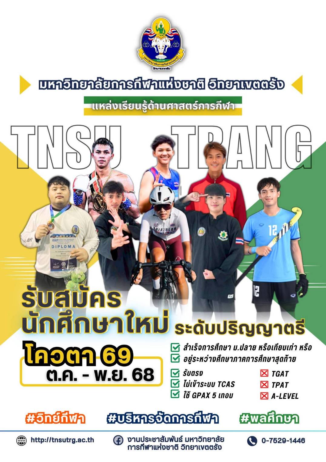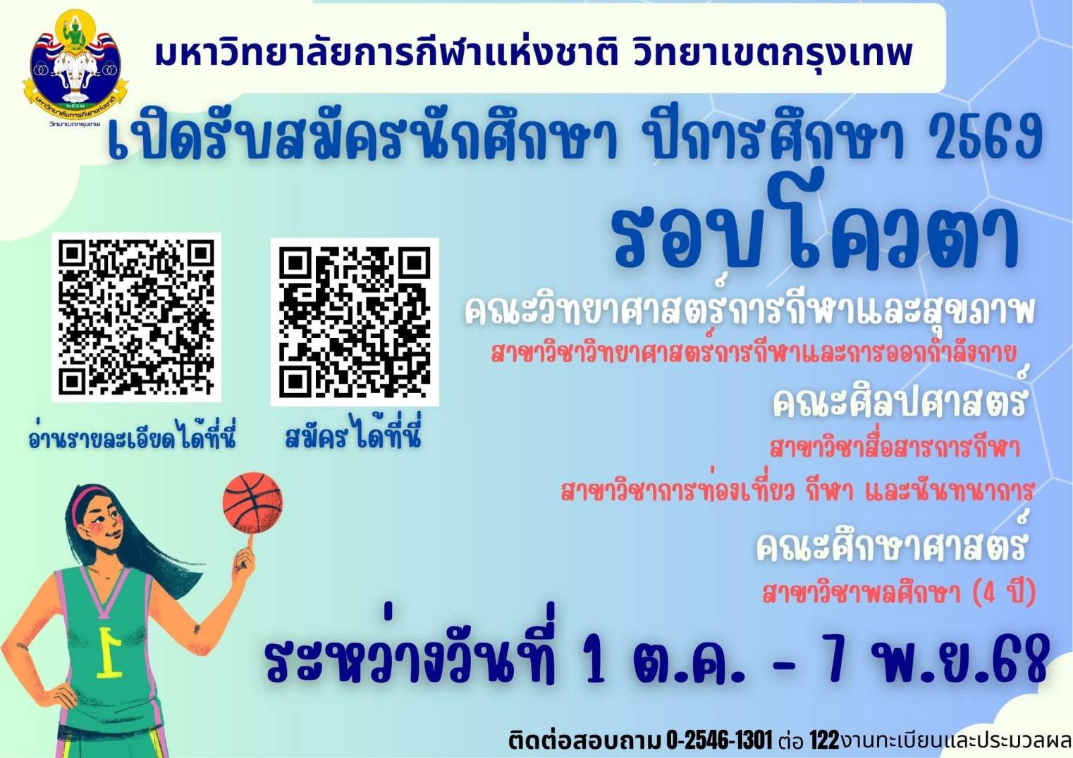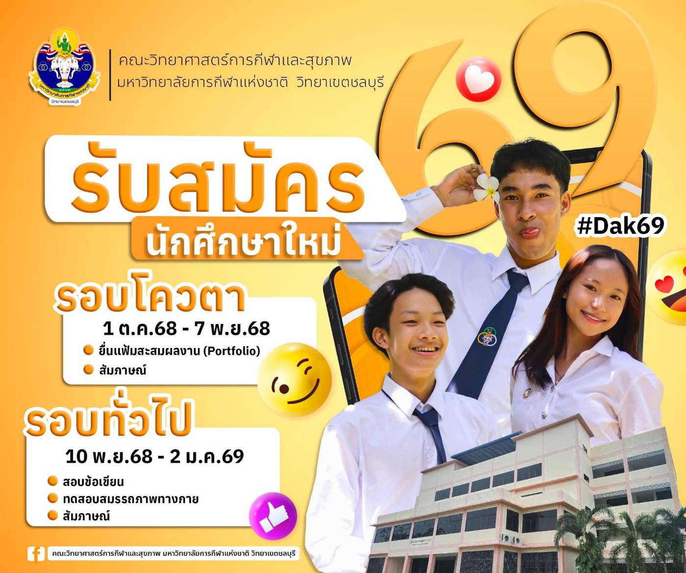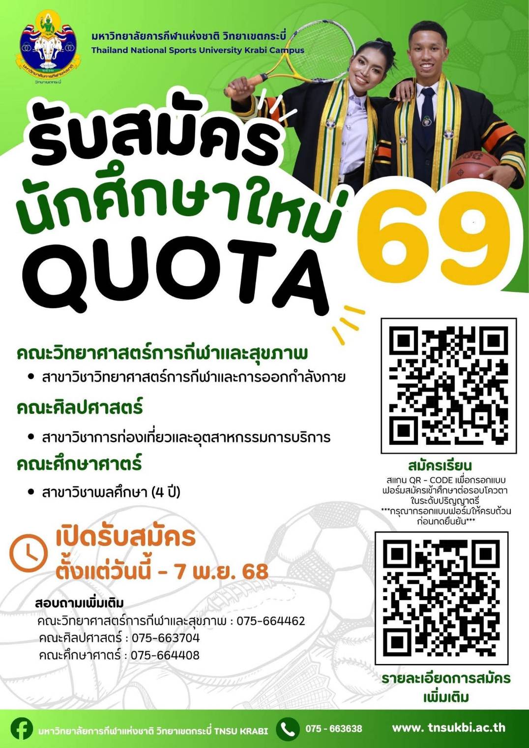 EZ Webmaster October 27, 2025 EZ Webmaster October 27, 2025 DEK69 ห้ามพลาด! รวมรอบโควตาของ มกช. ทั้ง 17 วิทยาเขต รวมโควต้า มหาวิทยาลัยการกีฬาแห่งชาติ ทั้ง 17 วิทยาเขต สำหรับน้องๆ ที่มีความฝันอยากเป็นนักกีฬาเฉพาะด้าน วันนี้พี่รวบรวมมาแล้ว .. โควต้าDEK69 มหาวิทยาลัยการกีฬาแห่งชาติ ทั้ง 177 วิทยาเขตทั่วประเทศไทย จะมีวิทยาเขตไหน รับสมัครยังไงบ้าง ไปดูกันเลย… 1. มหาวิทยาลัยการกีฬา วิทยาเขตกระบี่ คณะวิชา คณะวิทยาศาสตร์การกีฬาและสุขภาพ คณะศิลปศาสตร์ คณะศึกษาศาสตร์ ข้อมูลเพิ่มเติมและเว็บไซต์ทางการ มหาวิทยาลัยการกีฬา วิทยาเขตกระบี่ เพจ Facebook :; มหาวิทยาลัยการกีฬาแห่งชาติ วิทยาเขตกระบี่ TNSU KRABI 2. มหาลัยการกีฬา วิทยาเขตกรุงเทพฯ หลักสูตร หลักสูตรวิทยาศาสตร์บัณฑิต (วิทยาศาสตร์การกีฬาและการออกกำลังกาย) หลักสูตรศิลปศาสตร์บัณฑิต (การท่องเที่ยวและนันทนาการ) หลักสูตรศิลปศาสตร์บัณฑิต (สื่อสารการกีฬา) หลักการศึกษาศาสตร์บัณฑิต (พลศึกษา) ข้อมูลเพิ่มเติมและเว็บไซต์ทางการ มหาวิทยาลัยการกีฬา วิทยาเขตกรุงเทพฯ เพจ Facebook :; มหาวิทยาลัยการกีฬาแห่งชาติ วิทยาเขตกรุงเทพฯ 3. มหาวิทยาลัยการกีฬา วิทยาเขตชลบุรี หลักสูตร หลักสูตรคณะวิทยาศาสตร์การกีฬาและสุขภาพ (วิทยาศาสตร์การกีฬาและการออกกำลังกาย) หลักสูตรคณะศิลปศาสตร์ (การบริหารจัดการกีฬา) หลักสูตรคณะศิลปศาสตร์ (การท่องเที่ยวและนันทนาการ) หลักสูตรคณะศึกษาศาสตร์ (พลศึกษา) หลักสูตรคณะศึกษาศาสตร์ (พลศึกษาและสุขศึกษา) ข้อมูลเพิ่มเติมและเว็บไซต์ทางการ มหาวิทยาลัยการกีฬา วิทยาเขตชลบุรี เพจ Facebook :; ประชาสัมพันธ์ มหาวิทยาลัยการกีฬาแห่งชาติ วิทยาเขตชลบุรี 4. มหาวิทยาลัยการกีฬา วิทยาเขตชัยภูมิ หลักสูตร หลักสูตรคณะวิทยาศาสตร์การกีฬาและสุขภาพ (วิทยาศาสตร์การกีฬาและการออกกำลังกาย) หลักสูตรคณะศิลปศาสตร์ (สื่อสารมวลชนทางการกีฬา) หลักสูตรคณะศึกษาศาสตร์ (พลศึกษา) ข้อมูลเพิ่มเติมและเว็บไซต์ทางการ มหาวิทยาลัยการกีฬา วิทยาเขตชัยภูมิ เพจ Facebook :; มหาวิทยาลัยการกีฬาแห่งชาติ วิทยาเขตชัยภูมิ 5. มหาวิทยาลัยการกีฬา วิทยาเขตชุมพร หลักสูตร หลักสูตรคณะวิทยาศาสตร์การกีฬาและสุขภาพ (สาขาวิทยาศาสตร์การกีฬาและการออกกำลังกาย) หลักสูตรคณะศิลปศาสตร์ (สาขาการท่องเที่ยวและนันทนาการ) หลักสูตรคณะศึกษาศาสตร์ (สาขาพลศึกษา) ข้อมูลเพิ่มเติมและเว็บไซต์ทางการ มหาวิทยาลัยการกีฬา วิทยาเขตชุมพร เพจ Facebook :; มหาวิทยาลัยการกีฬาแห่งชาติ วิทยาเขตชุมพร 6. มหาวิทยาลัยการกีฬา วิทยาเขตเชียงใหม่ หลักสูตร หลักสูตรคณะวิทยาศาสตร์การกีฬาและสุขภาพ (สาขาวิทยาศาสตร์การกีฬาและการออกกำลังกาย) หลักสูตร