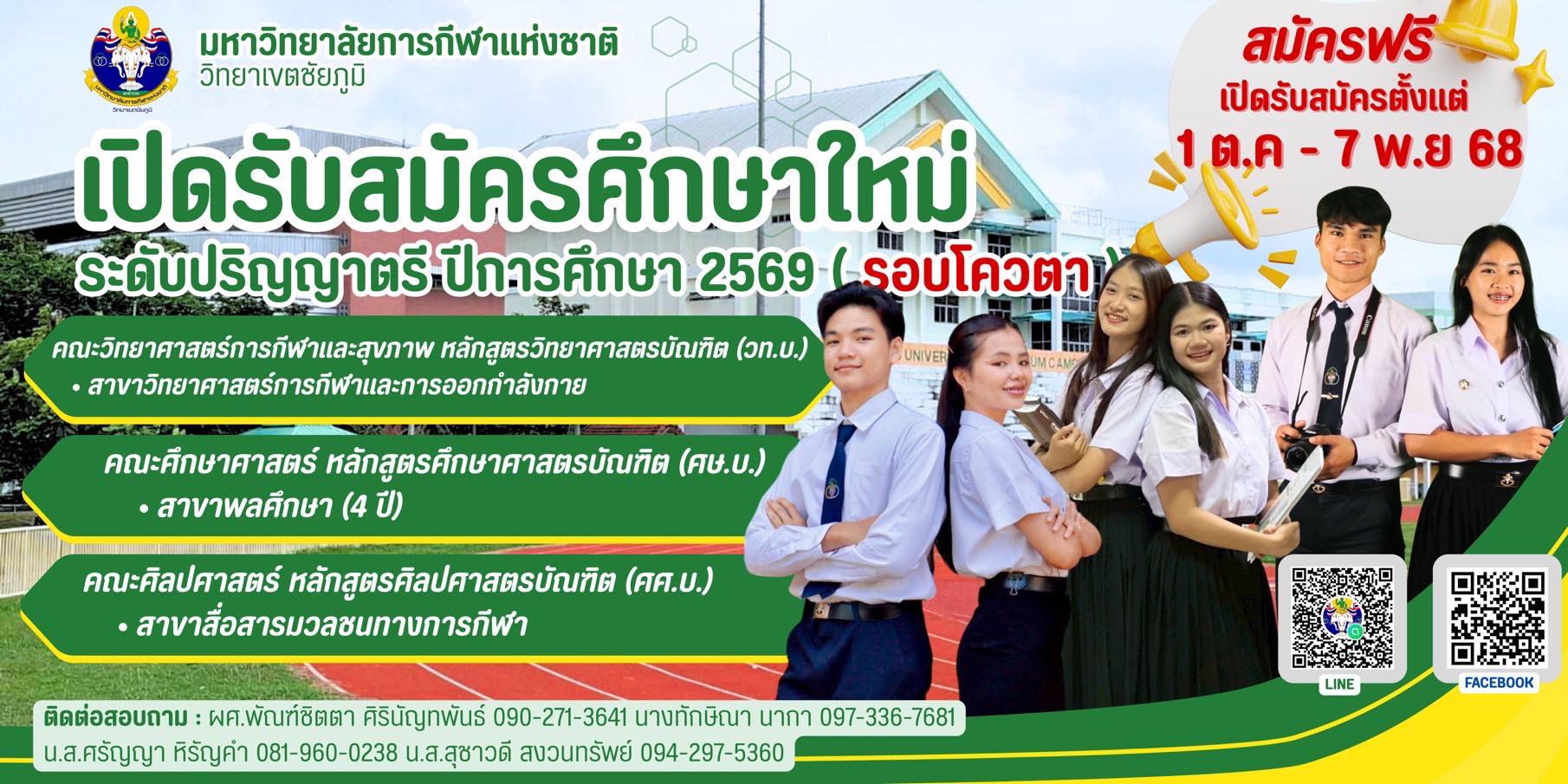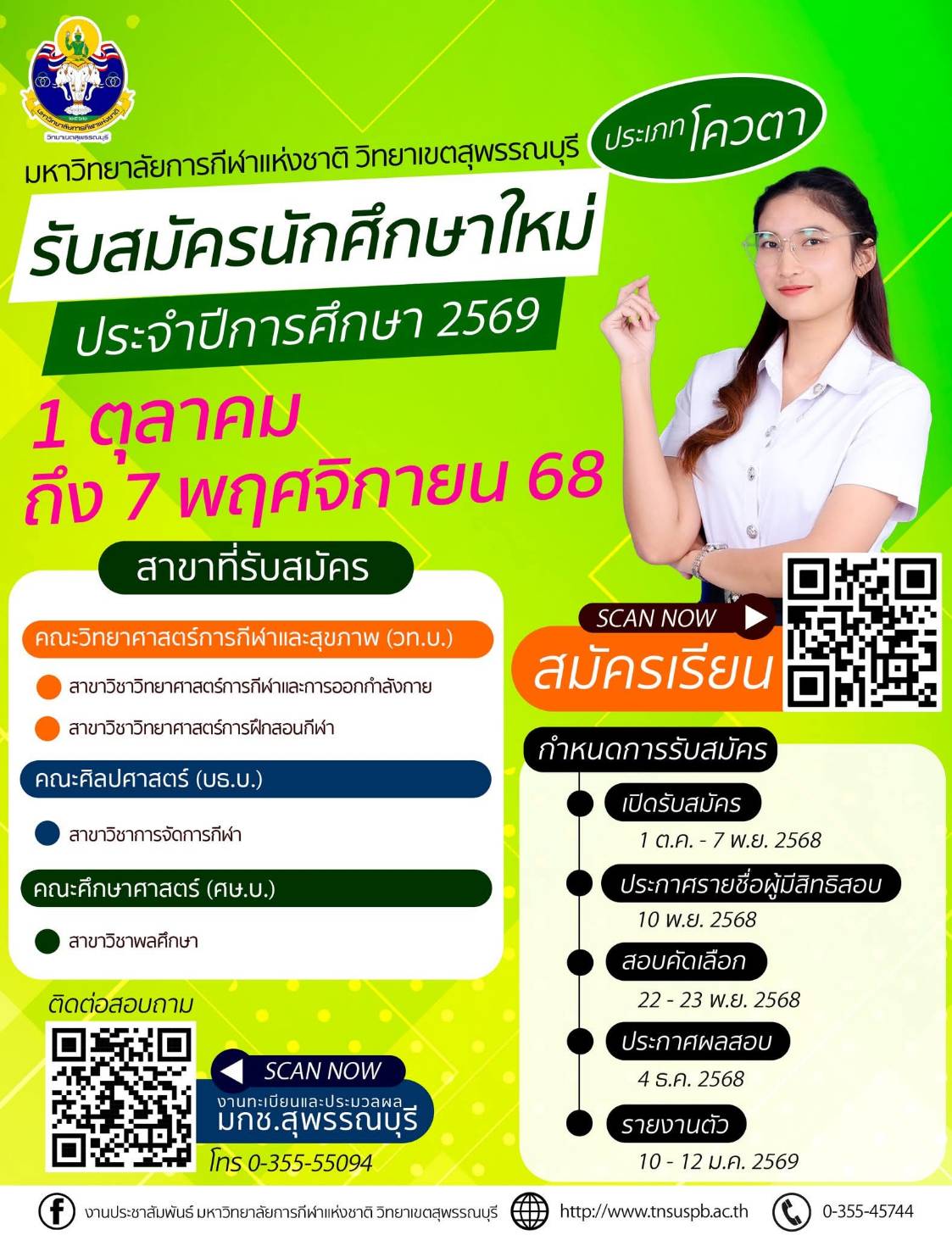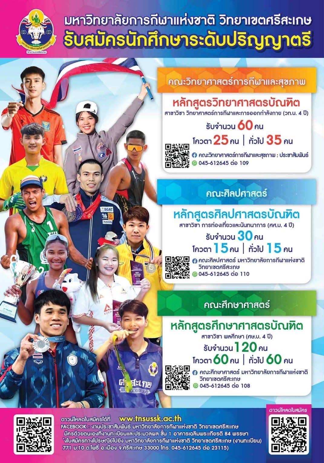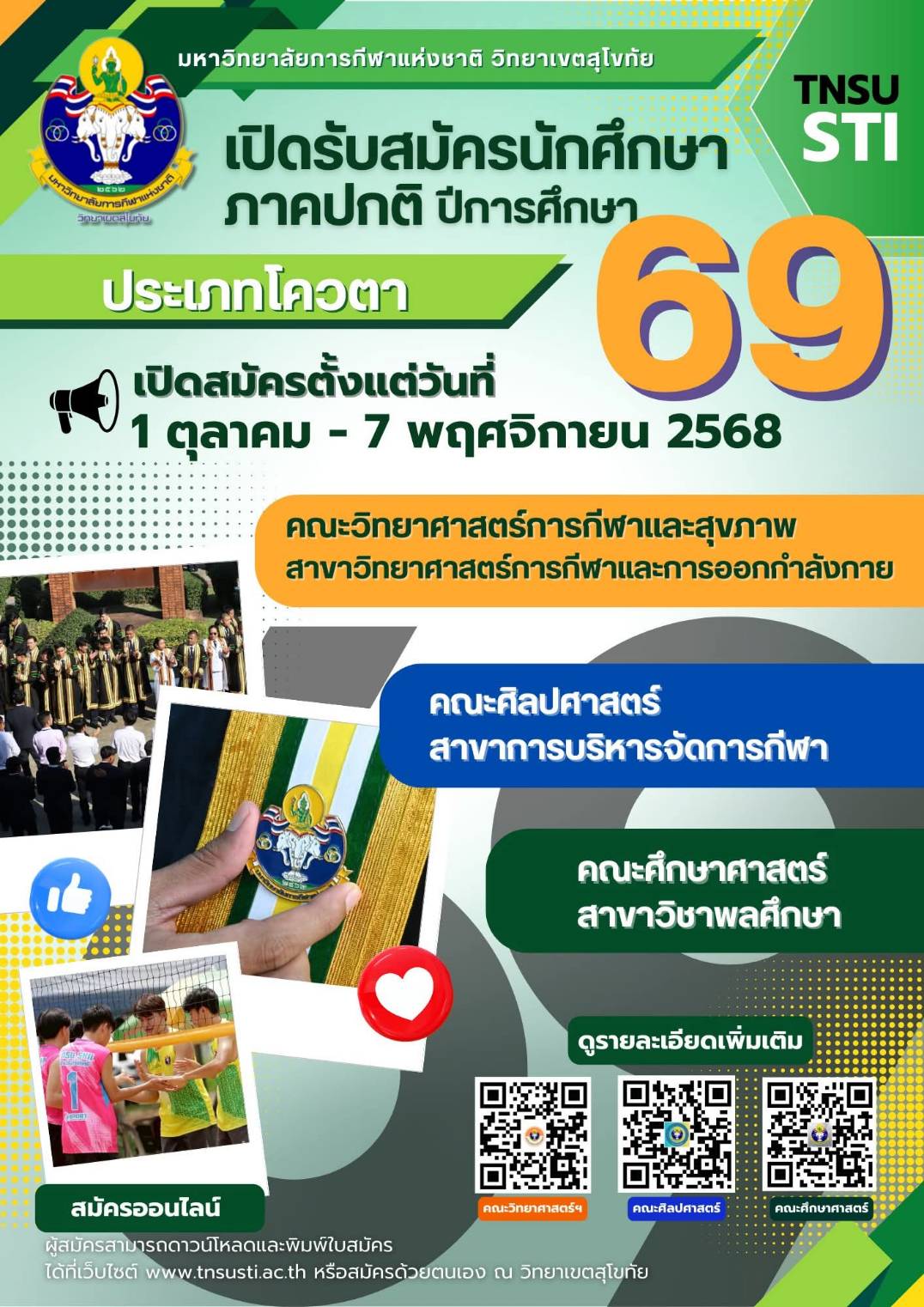 EZ Webmaster October 27, 2025 EZ Webmaster October 27, 2025 DEK69 ห้ามพลาด! รวมรอบโควตาของ มกช. ทั้ง 17 วิทยาเขต รวมโควต้า มหาวิทยาลัยการกีฬาแห่งชาติ ทั้ง 17 วิทยาเขต สำหรับน้องๆ ที่มีความฝันอยากเป็นนักกีฬาเฉพาะด้าน วันนี้พี่รวบรวมมาแล้ว .. โควต้าDEK69 มหาวิทยาลัยการกีฬาแห่งชาติ ทั้ง 177 วิทยาเขตทั่วประเทศไทย จะมีวิทยาเขตไหน รับสมัครยังไงบ้าง ไปดูกันเลย… 1. มหาวิทยาลัยการกีฬา วิทยาเขตกระบี่ คณะวิชา คณะวิทยาศาสตร์การกีฬาและสุขภาพ คณะศิลปศาสตร์ คณะศึกษาศาสตร์ ข้อมูลเพิ่มเติมและเว็บไซต์ทางการ มหาวิทยาลัยการกีฬา วิทยาเขตกระบี่ เพจ Facebook :; มหาวิทยาลัยการกีฬาแห่งชาติ วิทยาเขตกระบี่ TNSU KRABI 2. มหาลัยการกีฬา วิทยาเขตกรุงเทพฯ หลักสูตร หลักสูตรวิทยาศาสตร์บัณฑิต (วิทยาศาสตร์การกีฬาและการออกกำลังกาย) หลักสูตรศิลปศาสตร์บัณฑิต (การท่องเที่ยวและนันทนาการ) หลักสูตรศิลปศาสตร์บัณฑิต (สื่อสารการกีฬา) หลักการศึกษาศาสตร์บัณฑิต (พลศึกษา) ข้อมูลเพิ่มเติมและเว็บไซต์ทางการ มหาวิทยาลัยการกีฬา วิทยาเขตกรุงเทพฯ เพจ Facebook :; มหาวิทยาลัยการกีฬาแห่งชาติ วิทยาเขตกรุงเทพฯ 3. มหาวิทยาลัยการกีฬา วิทยาเขตชลบุรี หลักสูตร หลักสูตรคณะวิทยาศาสตร์การกีฬาและสุขภาพ (วิทยาศาสตร์การกีฬาและการออกกำลังกาย) หลักสูตรคณะศิลปศาสตร์ (การบริหารจัดการกีฬา) หลักสูตรคณะศิลปศาสตร์ (การท่องเที่ยวและนันทนาการ) หลักสูตรคณะศึกษาศาสตร์ (พลศึกษา) หลักสูตรคณะศึกษาศาสตร์ (พลศึกษาและสุขศึกษา) ข้อมูลเพิ่มเติมและเว็บไซต์ทางการ มหาวิทยาลัยการกีฬา วิทยาเขตชลบุรี เพจ Facebook :; ประชาสัมพันธ์ มหาวิทยาลัยการกีฬาแห่งชาติ วิทยาเขตชลบุรี 4. มหาวิทยาลัยการกีฬา วิทยาเขตชัยภูมิ หลักสูตร หลักสูตรคณะวิทยาศาสตร์การกีฬาและสุขภาพ (วิทยาศาสตร์การกีฬาและการออกกำลังกาย) หลักสูตรคณะศิลปศาสตร์ (สื่อสารมวลชนทางการกีฬา) หลักสูตรคณะศึกษาศาสตร์ (พลศึกษา) ข้อมูลเพิ่มเติมและเว็บไซต์ทางการ มหาวิทยาลัยการกีฬา วิทยาเขตชัยภูมิ เพจ Facebook :; มหาวิทยาลัยการกีฬาแห่งชาติ วิทยาเขตชัยภูมิ 5. มหาวิทยาลัยการกีฬา วิทยาเขตชุมพร หลักสูตร หลักสูตรคณะวิทยาศาสตร์การกีฬาและสุขภาพ (สาขาวิทยาศาสตร์การกีฬาและการออกกำลังกาย) หลักสูตรคณะศิลปศาสตร์ (สาขาการท่องเที่ยวและนันทนาการ) หลักสูตรคณะศึกษาศาสตร์ (สาขาพลศึกษา) ข้อมูลเพิ่มเติมและเว็บไซต์ทางการ มหาวิทยาลัยการกีฬา วิทยาเขตชุมพร เพจ Facebook :; มหาวิทยาลัยการกีฬาแห่งชาติ วิทยาเขตชุมพร 6. มหาวิทยาลัยการกีฬา วิทยาเขตเชียงใหม่ หลักสูตร หลักสูตรคณะวิทยาศาสตร์การกีฬาและสุขภาพ (สาขาวิทยาศาสตร์การกีฬาและการออกกำลังกาย) หลักสูตร