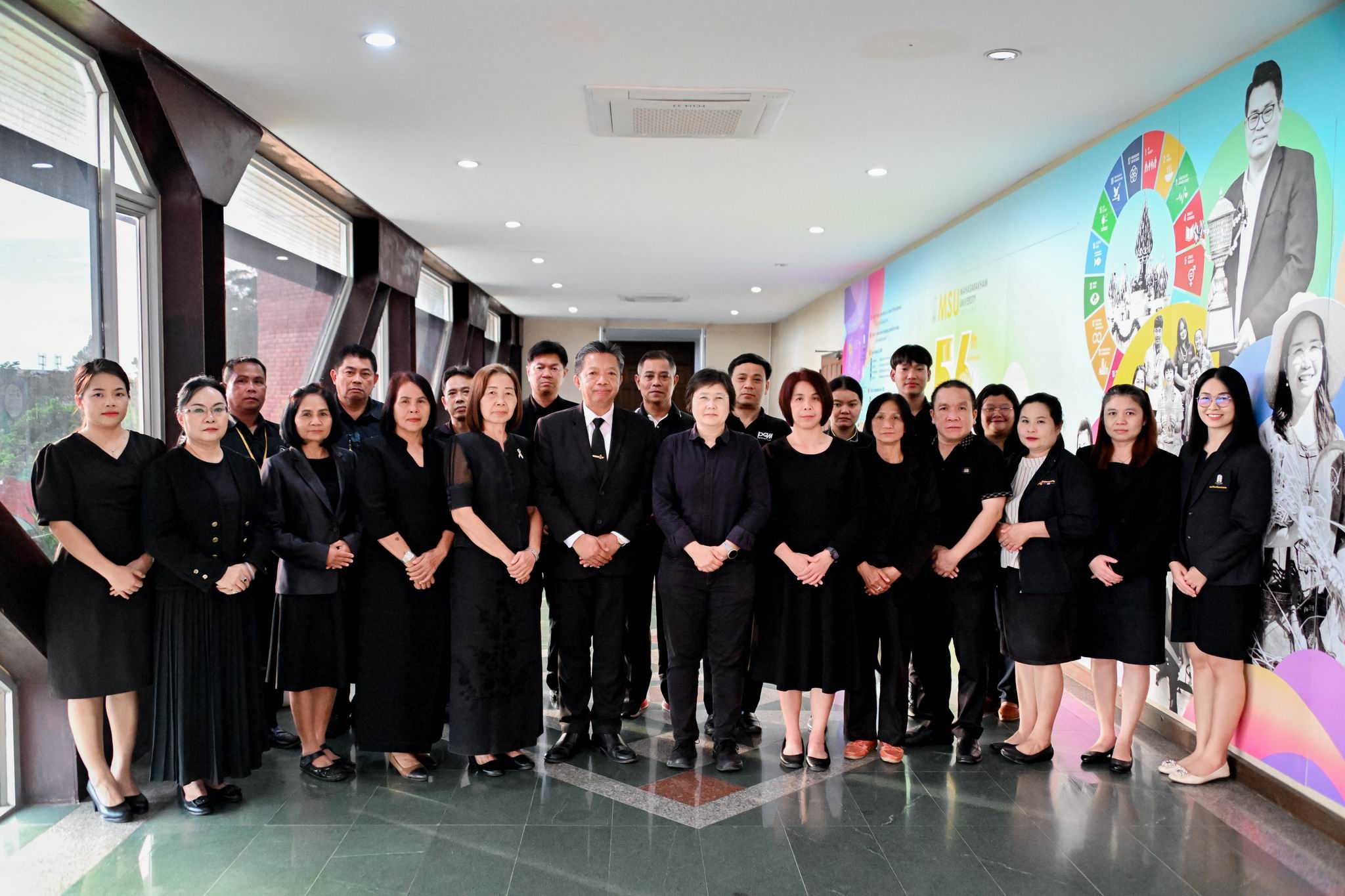 EZ Webmaster October 28, 2025 EZ Webmaster October 28, 2025 ชาว มมส พร้อมใจแต่งกายไว้ทุกข์ ถวายแด่สมเด็จพระบรมราชชนนีพันปีหลวง ชาว มมส พร้อมใจแต่งกายไว้ทุกข์ ถวายแด่สมเด็จพระบรมราชชนนีพันปีหลวง มหาวิทยาลัยมหาสารคาม (มมส) ได้จัดกิจกรรมเพื่อแสดงความอาลัยอย่างสุดซึ้งต่อการเสด็จสวรรคตของ สมเด็จพระนางเจ้าสิริกิติ์ พระบรมราชินีนาถ พระบรมราชชนนีพันปีหลวง ซึ่งบรรยากาศภายในมหาวิทยาลัยฯ เต็มไปด้วยความโศกเศร้าอาลัย โดยคณะผู้บริหาร คณาจารย์ บุคลากร และนิสิตมหาวิทยาลัยมหาสารคาม พร้อมใจกันแต่งกายด้วยชุดไว้ทุกข์สีดำ เพื่อแสดงความจงรักภักดีและน้อมสำนึกในพระมหากรุณาธิคุณอันหาที่สุดมิได้ ที่พระองค์ท่านทรงปฏิบัติพระราชกรณียกิจนานัปการเพื่อประโยชน์สุขของประเทศชาติและประชาชนมาโดยตลอด ในช่วงเช้า มหาวิทยาลัยฯ ได้ประกอบพิธีเชิญธงชาติไทยขึ้นสู่ยอดเสา ก่อนจะดำเนินการ ลดธงลงสู่ระดับครึ่งเสา เพื่อแสดงความอาลัย ตามประกาศสำนักพระราชวัง และมติของรัฐบาลที่แจ้งให้สถานที่ราชการและสถานศึกษาทุกแห่งลดธงครึ่งเสาเป็นเวลา 30 วัน ตั้งแต่วันที่ 25 ตุลาคม 2568 เป็นต้นไป นอกจากนี้ มหาวิทยาลัยมหาสารคาม ยังได้ดำเนินการตามแนวทางของรัฐบาลที่กำหนดให้ข้าราชการ พนักงานรัฐวิสาหกิจ และเจ้าหน้าที่ของรัฐไว้ทุกข์เป็นเวลา 1 ปี เพื่อร่วมแสดงความอาลัยอย่างสมพระเกียรติสูงสุด
