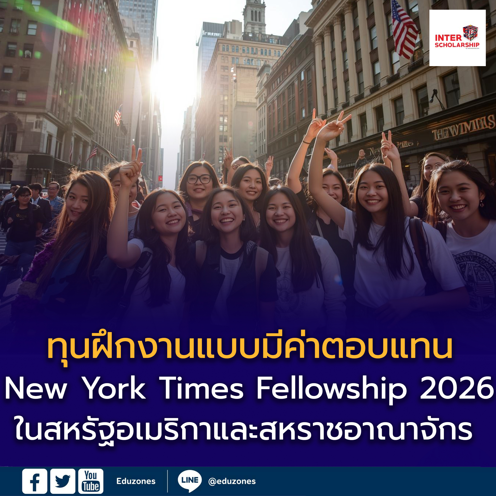 EZ Webmaster October 28, 2025 EZ Webmaster October 28, 2025 New York Times Fellowship 2026 📰 New York Times Fellowship 2026 ทุนฝึกงานมีค่าตอบแทนในสหรัฐอเมริกาและสหราชอาณาจักร 🌍 The New York Times Fellowship คือโครงการฝึกงานแบบ มีค่าตอบแทน (Paid Fellowship Program) ที่จัดขึ้นเพื่อพัฒนาเยาวชนรุ่นใหม่ในสายสื่อสารมวลชนให้เติบโตเป็นนักข่าวมืออาชีพ ทั้งสายข่าว สายภาพ มัลติมีเดีย และบรรณาธิการ ผู้เข้าร่วมจะได้ทำงานจริงกับสื่อระดับโลก พร้อมรับคำแนะนำจากผู้เชี่ยวชาญในองค์กรสื่ออันดับต้น ๆ ของโลก 🌎 🏛️ ข้อมูลทั่วไป ประเทศเจ้าภาพ: สหรัฐอเมริกา 🇺🇸 และ สหราชอาณาจักร 🇬🇧 หน่วยงานจัดโครงการ: The New York Times สถานที่ฝึกงาน: New York, Washington, San Francisco, Chicago และ London ระยะเวลาโครงการ: 1 ปี⏰ เริ่ม 1 มิถุนายน 2026 – สิ้นสุด 21 พฤษภาคม 2027 💼 สิทธิประโยชน์ของผู้เข้าร่วม ค่าตอบแทนรายปีขั้นต่ำ 82,415.05 ดอลลาร์สหรัฐ (USD) โอกาสทำงานในองค์กรสื่อระดับโลก ได้รับประสบการณ์จริงในสภาพแวดล้อมการทำงานนานาชาติ มีสิทธิ์ลาคลอด / ลาพักเลี้ยงดูบุตรแบบได้รับเงินเดือน (สูงสุด 18 สัปดาห์) เข้าร่วมเวิร์กช็อป การอบรม และโอกาสสร้างเครือข่ายกับทีมงานระดับมืออาชีพ 🧭 เนื้อหาการฝึกงาน ทำงานเต็มเวลาในฝ่ายข่าวหรือบทความความคิดเห็น (Opinion Section) ได้รับการอบรมเฉพาะทางและคำแนะนำจาก Writing Coach เข้าร่วมเวิร์กช็อป ฟังบรรยายจากผู้เชี่ยวชาญ เข้าถึงทรัพยากรและคอร์สออนไลน์ขององค์กรได้ฟรี เข้าร่วมเครือข่าย Employee Resource Groups (ERG) เพื่อเรียนรู้ร่วมกับเพื่อนร่วมงานจากทั่วโลก 🌍 คุณสมบัติผู้สมัคร ต้องมีสิทธิ์ทำงานใน สหรัฐอเมริกา หรือ สหราชอาณาจักร เปิดรับผู้ที่มีพื้นฐานด้านสื่อ เช่น นักข่าว นักเขียน บรรณาธิการ ช่างภาพ ศิลปินมัลติมีเดีย หรือผู้เชี่ยวชาญด้านเสียง/วิดีโอ แต่ละตำแหน่งมีคุณสมบัติและข้อกำหนดเฉพาะ ควรอ่านรายละเอียดก่อนสมัคร 📝 ขั้นตอนการสมัคร เข้าเว็บไซต์ทางการของ The New York Times เลือกตำแหน่งที่สนใจและกรอกข้อมูลในแบบฟอร์มออนไลน์ แนบเอกสารประกอบ ได้แก่ Resume / CV Cover Letter Portfolio / Website / Video Link สำเนาพาสปอร์ต และใบแสดงผลการศึกษา ตรวจสอบข้อมูลก่อนกดยืนยันส่งใบสมัคร ⚠️ หมายเหตุ: สมัครได้เพียง 1 ตำแหน่งต่อปี ใบสมัครที่ไม่สมบูรณ์จะ ไม่ถูกพิจารณา 📅 หมดเขตรับสมัคร: 19 พฤศจิกายน 2025 🔗 สมัครและดูรายละเอียดเพิ่มเติมได้ที่ เว็บไซต์ทางการ: The New York Times Fellowship แบบฟอร์มสมัคร: Apply Now