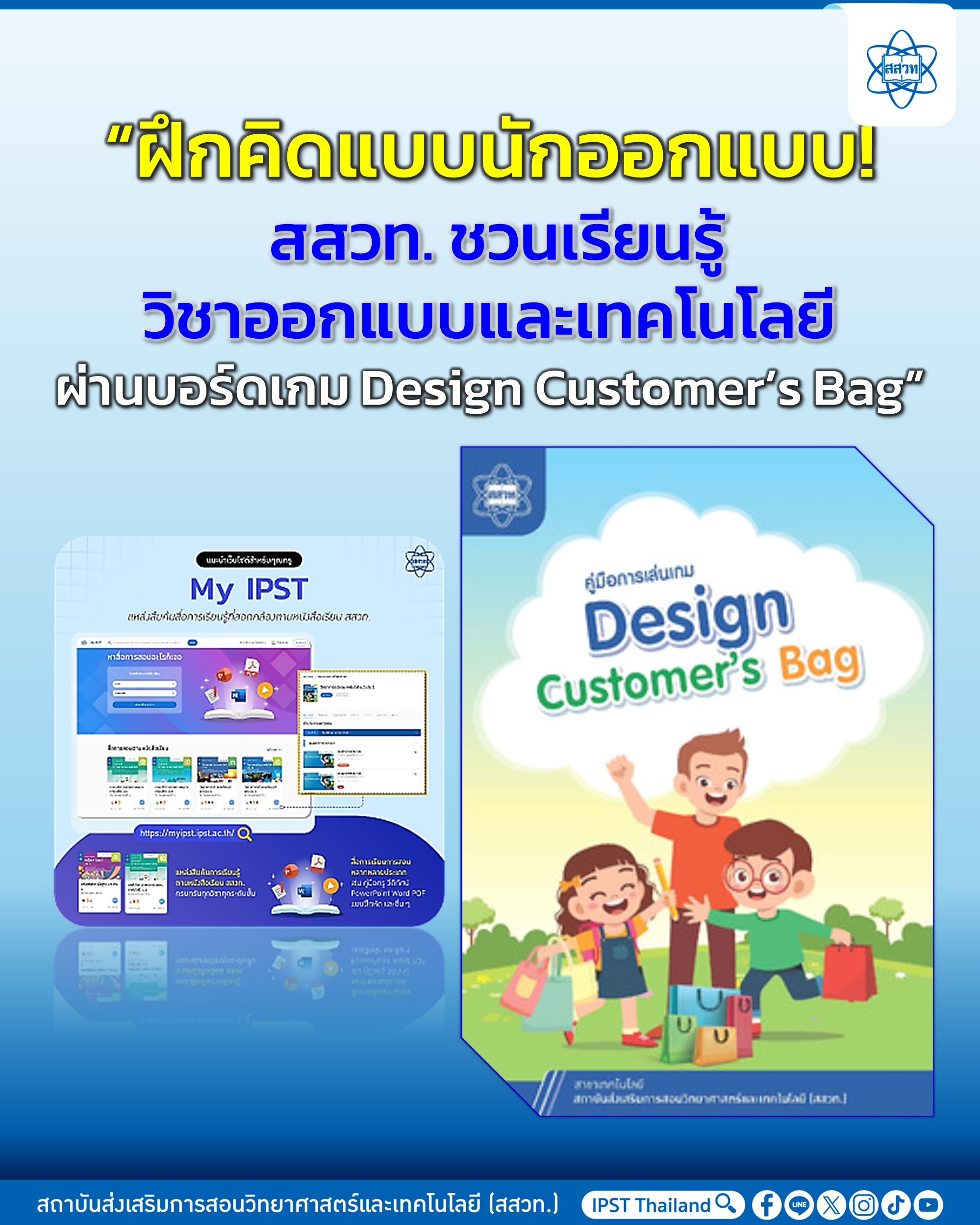 EZ Webmaster October 31, 2025 EZ Webmaster October 31, 2025 “ฝึกคิดแบบนักออกแบบ! สสวท. ชวนเรียนรู้วิชาออกแบบและเทคโนโลยี ผ่านบอร์ดเกม Design Customer’s Bag” “ฝึกคิดแบบนักออกแบบ! สสวท. ชวนเรียนรู้วิชาออกแบบและเทคโนโลยี ผ่านบอร์ดเกม Design Customer’s Bag” ช่วงปิดเทอมนี้ สถาบันส่งเสริมการสอนวิทยาศาสตร์และเทคโนโลยี (สสวท.) ชวนคุณครู นักเรียน และผู้ปกครอง มาสนุก ไปกับ “Design Customer’s Bag” สื่อบอร์ดเกมสร้างสรรค์เพื่อการเรียนรู้วิชา ออกแบบและเทคโนโลยี สำหรับนักเรียน ชั้นมัธยมศึกษาปีที่ 2 เป็นต้นไป ที่จะช่วยพัฒนาทักษะการแก้ปัญหาและการคิดอย่างเป็นระบบ ในเกมนี้ น้อง ๆ จะได้สวมบทบาทเป็น “นักออกแบบกระเป๋า” ที่ต้องสร้างสรรค์ผลงานให้ตอบโจทย์ความต้องการของลูกค้า ไม่ว่าจะเป็นด้าน การใช้งาน วัสดุ ความสวยงาม รูปทรง สีสัน และลวดลาย ที่ผู้เล่นจะได้เรียนรู้แนวคิดของกระบวนการออกแบบอย่างสร้างสรรค์ภายใต้เงื่อนไข และทรัพยากรที่มีอยู่ รวมถึงการพิจารณาปัจจัยต่าง ๆ เช่น เวลา ความทนทาน ความเหมาะสมกับผู้ใช้งาน และผลกระทบต่อสิ่งแวดล้อม กิจกรรมนี้ไม่เพียงฝึกการคิดเชิงออกแบบเท่านั้น แต่ยังสร้างบรรยากาศการเรียนรู้ที่เต็มไปด้วยความสนุกและจินตนาการ เหมาะอย่างยิ่งสำหรับใช้จัดกิจกรรมในห้องเรียนหรือช่วงปิดภาคเรียน ดาวน์โหลดฟรี คู่มือการเล่นบอร์ดเกม “Design Customer’s Bag” ได้ที่คลังสื่อการสอน สสวท. My IPST สนใจคลิกที่ลิงก์ https://myipst.ipst.ac.th/medias/M2DT_01_Board%20Game%20Design%20Customer%E2%80%99s%20Bag