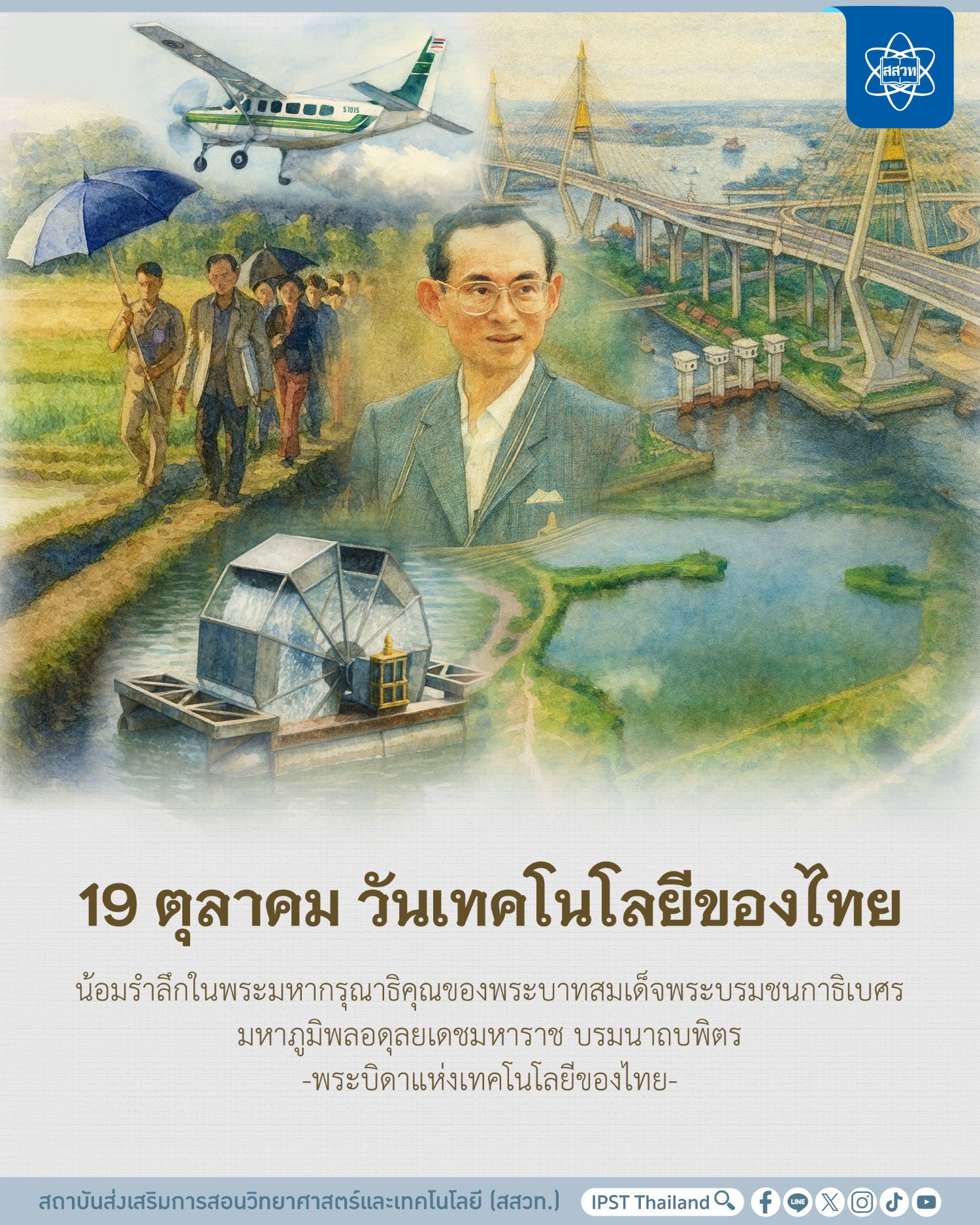 EZ Webmaster October 31, 2025 EZ Webmaster October 31, 2025 พระอัจฉริยภาพเหนือกาลเวลา: ‘พระบิดาแห่งเทคโนโลยีของไทย’ กับ พระราชกรณีกิจ ทางด้านวิทยาศาสตร์ ที่สร้างสรรค์นวัตกรรมเพื่อปวงประชา พระอัจฉริยภาพเหนือกาลเวลา: ‘พระบิดาแห่งเทคโนโลยีของไทย’ กับ พระราชกรณีกิจ ทางด้านวิทยาศาสตร์ ที่สร้างสรรค์นวัตกรรมเพื่อปวงประชา เนื่องในโอกาส “วันเทคโนโลยีของไทย” วันที่ ๑๙ ตุลาคม ของทุกปี สถาบันส่งเสริมการสอนวิทยาศาสตร์และเทคโนโลยี (สสวท.) ขอเชิญชวนประชาชนร่วมเทิดพระเกียรติและเรียนรู้โครงการอันเนื่องมาจากพระราชดำริ และเป็นวาระสำคัญที่คนไทย จะได้น้อมรำลึกถึง พระมหากรุณาธิคุณอันหาที่สุดมิได้ของพระบาทสมเด็จพระบรมชนกาธิเบศร มหาภูมิพลอดุลยเดช มหาราชบรมนาถบพิตร (ในหลวงรัชกาลที่ ๙) ในฐานะ “พระบิดาแห่งเทคโนโลยีของไทย” พระอัจฉริยภาพและพระวิสัยทัศน์ ที่ทรงนำเทคโนโลยีและวิทยาการสมัยใหม่มาประยุกต์ใช้เพื่อแก้ไขปัญหาและพัฒนาประเทศอย่างยั่งยืน และได้ก่อให้เกิดโครงการอันเนื่องมาจากพระราชดำริมากมาย ที่ยังคงเป็นประโยชน์ต่อพสกนิกรมาจนถึงปัจจุบัน ๑๙ ตุลาคม ๒๕๑๕: จุดเริ่มต้นแห่งเกียรติยศ การพระราชทานพระบรมราชานุญาตให้ถวายพระราชสมัญญานาม “พระบิดาแห่งเทคโนโลยีของไทย” และกำหนดให้วันที่ ๑๙ ตุลาคม เป็น “วันเทคโนโลยีของไทย” นั้น มีจุดเริ่มต้นจากเหตุการณ์สำคัญทางประวัติศาสตร์ เมื่อวันที่ ๑๙ ตุลาคม พ.ศ. ๒๕๑๕ ในวันนั้น พระบาทสมเด็จพระเจ้าอยู่หัวรัชกาลที่ ๙ ทรงควบคุมบัญชาการและอำนวยการสาธิตการทำ “ฝนหลวง” หรือฝนเทียมสูตรใหม่ของประเทศไทยเป็นครั้งแรกของโลก ณ เขื่อนแก่งกระจาน จังหวัดเพชรบุรี ซึ่งผลการทดลองประสบความสำเร็จอย่างแม่นยำ คณะรัฐมนตรีจึงได้มีมติเมื่อวันที่ ๑๒ ธันวาคม พ.ศ. ๒๕๔๓ เทิดพระเกียรติในพระปรีชาสามารถด้านเทคโนโลยีและการประดิษฐ์คิดค้นที่สร้างคุณูปการอย่างยิ่งต่อประเทศชาติ เรื่อง “พระบาทสมเด็จพระปรมินทรมหาภูมิพลอดุลยเดช กับ พระราชกรณีกิจ ทางด้านวิทยาศาสตร์”คลิกที่ https://www.scimath.org/article-chemistry/item/7465-2017-09-08-02-53-24 และ“พระบิดาแห่งเทคโนโลยีของไทย” คลิกที่ https://www.scimath.org/article-technology/item/7470-2017-09-08-03-18-58 หรืออ่านบทความที่ https://www.ipst.ac.th/news/107579/19oct.html