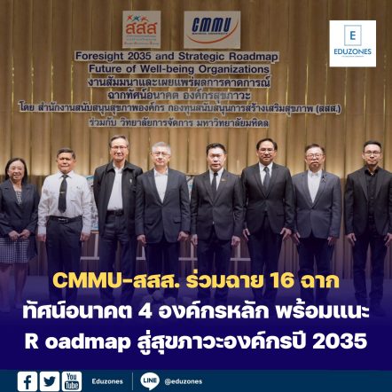 EZ Webmaster November 28, 2025 CMMU–สสส. ร่วมฉาย 16 ฉากทัศน์อนาคต 4 องค์กรหลัก พร้อมแนะ Roadmap สู่สุขภาวะองค์กรปี 2035 EZ Webmaster November 28, 2025 CMMU–สสส. ร่วมฉาย 16 ฉากทัศน์อนาคต 4 องค์กรหลัก พร้อมแนะ R oadmap สู่สุขภาวะองค์กรปี 2035 นายพงษ์ศักดิ์ ธงรัตนะ ผู้อำนวยการสำนักสนับสนุนสุขภาวะองค์กร (สำนัก 8) สสส. (ที่ 5 จากซ้าย) รศ.ดร.ณัฐสิทธิ์ เกิดศรี หัวหน้าทีมวิจัยโครงการจัดทำแผนที่นำทางและการคาดการณ์อนาคตเชิงยุทธศาสตร์ งานสร้างเสริมสุขภาวะองค์กร (ที่ 6 จากซ้าย) และ ผศ.ดร. บุญยิ่ง คงอาชาภัทร หัวหน้าโครงการจัดทำแผนที่นำทางและการคาดการณ์อนาคต เชิงยุทธศาสตร์ งานสร้างเสริมสุขภาวะองค์กร (ที่ 7 จากซ้าย) ร่วมงานแถลงข่าว “CMMU – สสส.” เผยแพร่ผลการคาดการณ์ฉากทัศน์อนาคต “Foresight 2035 and Strategic Roadmap: Future of Well-being Organizations” งานดังกล่าวเป็นการนำเสนอภาพอนาคตสุขภาวะองค์กรไทยในอีก 10 ปีข้างหน้า ครอบคลุม 4 ประเภทองค์กรหลัก ได้แก่… Continue Reading