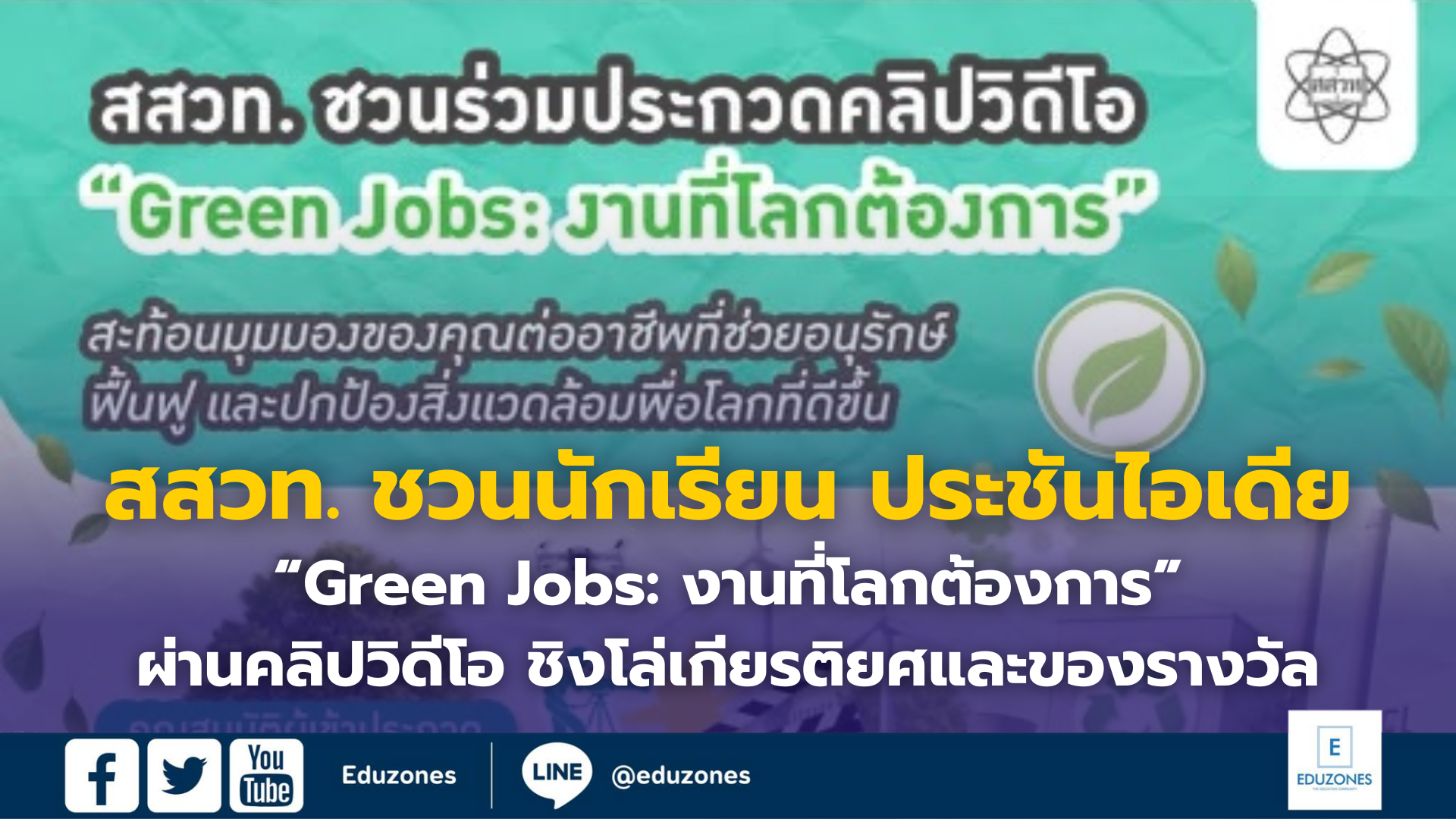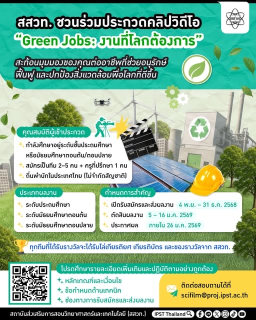 EZ Webmaster November 7, 2025 EZ Webmaster November 7, 2025 สสวท. ชวนนักเรียน ประชันไอเดีย “Green Jobs: งานที่โลกต้องการ” ผ่านคลิปวิดีโอ ชิงโล่เกียรติยศและของรางวัล สสวท. ชวนนักเรียน ประชันไอเดีย “Green Jobs: งานที่โลกต้องการ” ผ่านคลิปวิดีโอ ชิงโล่เกียรติยศและของรางวัล สถาบันส่งเสริมการสอนวิทยาศาสตร์และเทคโนโลยี (สสวท.) ขอเชิญชวนนักเรียนระดับประถมศึกษา มัธยมศึกษาตอนต้น และมัธยมศึกษาตอนปลาย ทั่วประเทศ ร่วมสร้างสรรค์และส่งผลงาน คลิปวิดีโอความยาว 3–5 นาที ในหัวข้อ “Green Jobs: งานที่โลกต้องการ” เพื่อสะท้อนมุมมองต่ออาชีพที่ช่วยอนุรักษ์ ฟื้นฟู หรือปกป้องสิ่งแวดล้อมสู่โลกที่ดีขึ้น งานสีเขียว (Green Jobs) คือ งานที่มีส่วนช่วยในการลดการใช้ทรัพยากร ลดการปล่อยแก๊สเรือนกระจก ของเสียและมลพิษ รวมถึงส่งเสริมเศรษฐกิจคาร์บอนต่ำและความยั่งยืน ผู้สนใจสามารถสมัครเป็นทีม (2–5 คน) พร้อมครูที่ปรึกษา 1 คน โดยส่งผลงานได้ตั้งแต่วันนี้จนถึงวันที่ 31 ธันวาคม 2568 ประกาศผลภายในวันที่ 26 มกราคม 2569 นี้ ทุกผลงานที่ได้รับรางวัลจะได้รับโล่เกียรติยศ เกียรติบัตร และของรางวัลจาก สสวท. อ่านรายละเอียดได้ที่เว็บไซต์ https://sciencefilm.ipst.ac.th/contest ติดต่อสอบถามได้ที่อีเมล scifilm@proj.ipst.ac.th