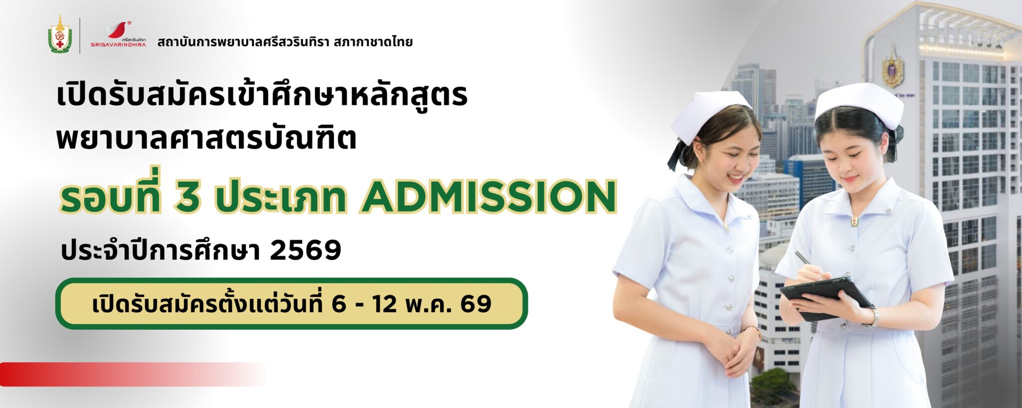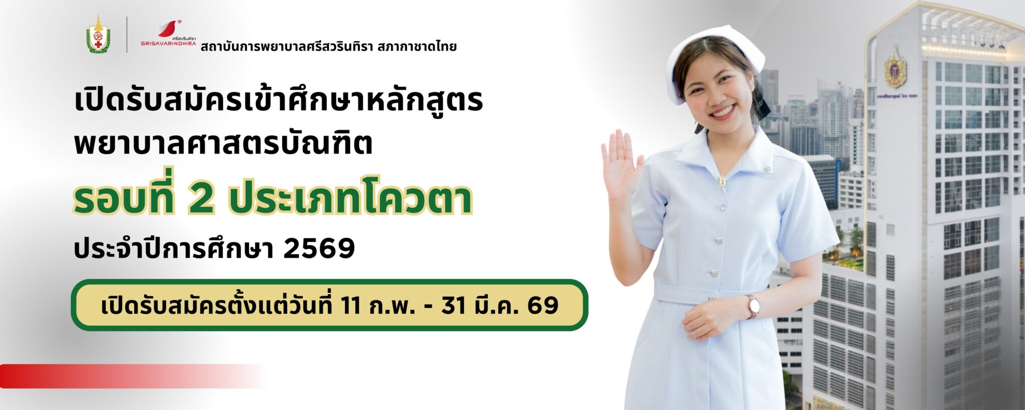 EZ Webmaster November 7, 2025 EZ Webmaster November 7, 2025 สถาบันการพยาบาลศรีสวรินทิรา สภากาชาดไทย เปิดรับสมัครนักศึกษาหลักสูตร พยาบาลศาสตรบัณฑิต ประจำปีการศึกษา 2569 🎓 สถาบันการพยาบาลศรีสวรินทิรา สภากาชาดไทยเปิดรับสมัครนักศึกษาหลักสูตร พยาบาลศาสตรบัณฑิต ประจำปีการศึกษา 2569 📍 รอบที่ 1 ประเภทแฟ้มสะสมผลงาน (Portfolio)ผู้ที่ผ่านการคัดเลือกทุกคนจะได้รับ ทุนสภากาชาดไทยตลอดหลักสูตร 4 ปี 🇹🇭 💰 สิทธิประโยชน์ทุนการศึกษา ทุนนี้ครอบคลุมค่าใช้จ่ายทั้งหมดตลอดการศึกษา ได้แก่ ค่าธรรมเนียมการศึกษาและค่าบำรุง ค่าที่พักภายในสถาบัน (ชั้นปี 1–4) ค่าอาหารที่จัดเตรียมให้ ค่าใช้จ่ายประจำเดือนตามประกาศของสถาบัน 🩺 เงื่อนไขสำคัญ:ผู้รับทุนต้องปฏิบัติงานในหน่วยงานของ สภากาชาดไทย ติดต่อกันไม่น้อยกว่า 4 ปีหลังสำเร็จการศึกษา 📅 กำหนดการรับสมัคร เปิดรับสมัคร: 3 พฤศจิกายน 2568 – 2 มกราคม 2569 ค่าธรรมเนียมสมัคร: 500 บาท จำนวนรับ: 80 คน📍 สมัครทางเว็บไซต์สถาบัน 👉 stin.ac.th 👩⚕️ คุณสมบัติผู้สมัคร กำลังศึกษาชั้น ม.6 แผนวิทย์–คณิต ปีการศึกษา 2568 เกรดเฉลี่ยสะสม 5 ภาคเรียน ≥ 3.25 เกรดเฉลี่ยเฉพาะ วิทย์ / คณิต / อังกฤษ ≥ 3.00 มีผลสอบภาษาอังกฤษ เช่น TOEFL iBT ≥ 42 IELTS ≥ 4.0 TOEIC ≥ 550(อายุผลสอบไม่เกิน 2 ปี) น้ำหนัก ≥ 40 กก. / ความสูง ≥ 150 ซม. สุขภาพแข็งแรง ไม่มีโรคหรือภาวะที่เป็นอุปสรรคต่อการเรียนและประกอบวิชาชีพ 🧾 เกณฑ์การคัดเลือก (รวม 100%) คะแนนสอบภาษาอังกฤษ → 50% แฟ้มสะสมผลงาน (Portfolio) → 25%(พิจารณารางวัล, กิจกรรมพยาบาล, จิตอาสา) โครงงานนวัตกรรมทางการพยาบาล (ไม่เกิน 1 หน้า) → 25% 📌 ผู้มีสิทธิ์สอบสัมภาษณ์ต้องมีคะแนนรวม ≥ 75 คะแนน 🗓️ ขั้นตอนหลังการคัดเลือก ประกาศรายชื่อผู้มีสิทธิ์สอบสัมภาษณ์: 14 ม.ค. 2569 ทดสอบบุคลิกภาพ (ออนไลน์): 26 ม.ค. 2569 สอบสัมภาษณ์ ณ สถาบันฯ: 27 ม.ค. 2569 (แต่งกายชุดนักเรียน) ยืนยันสิทธิ์ TCAS69: 6 – 7 ก.พ. 2569 รายงานตัวและทำสัญญาเข้าศึกษา: 20 เม.ย. 2569 รอบที่ 2 ประเภทโควตา (เปิดรับสมัครระหว่างวันที่ 11 กุมภาพันธ์ – 31 มีนาคม 2569) ประกาศสำนักวิชาพยาบาลศาสตร์ สถาบันการพยาบาลศรีสวรินทิรา สภากาชาดไทย รอบที่ 2 ประเภทโควตาภาคตะวันออก ประกาศสำนักวิชาพยาบาลศาสตร์ สถาบันการพยาบาลศรีสวรินทิรา สภากาชาดไทย รอบที่ 2 ประเภท โควตาบุตรเจ้าหน้าที่สภากาชาดไทย ประกาศสำนักวิชาพยาบาลศาสตร์ สถาบันการพยาบาลศรีสวรินทิรา สภากาชาดไทย รอบที่ 2 ประเภท โควตาผู้สำเร็จการศึกษาหลักสูตรประกาศนียบัตรผู้ช่วยพยาบาล ประกาศสำนักวิชาพยาบาลศาสตร์ สถาบันการพยาบาลศรีสวรินทิรา สภากาชาดไทย รอบที่ 2 ประเภท โควตากรุงเทพมหานครและปริมณฑล ประกาศสำนักวิชาพยาบาลศาสตร์ สถาบันการพยาบาลศรีสวรินทิรา สภากาชาดไทย รอบที่ 2 ประเภท โค