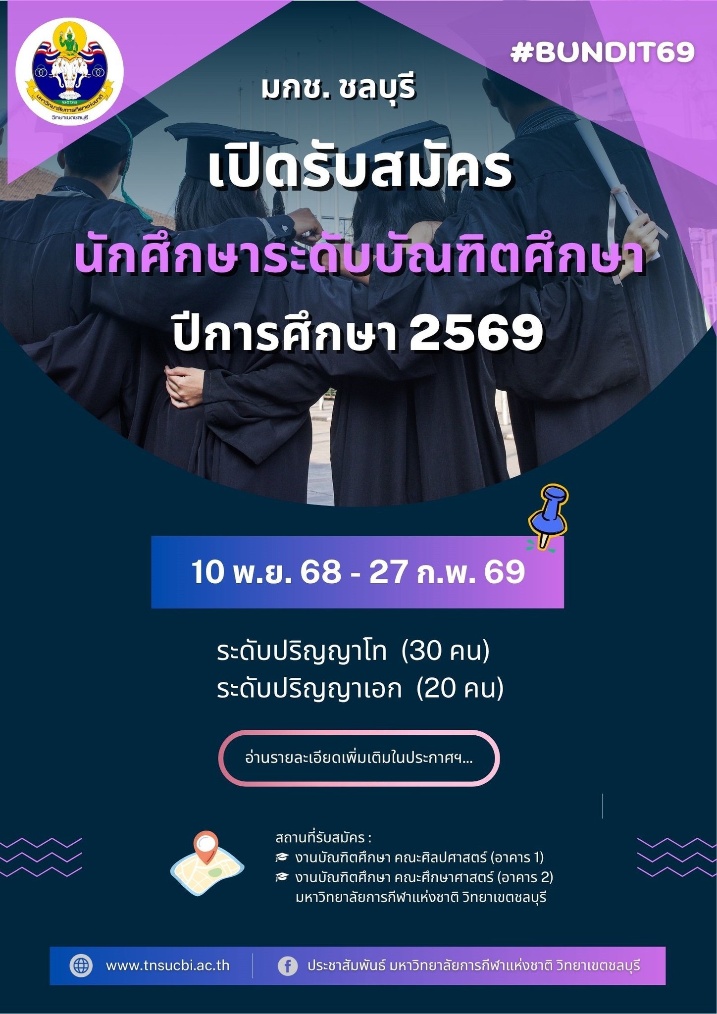 EZ Webmaster November 7, 2025 EZ Webmaster November 7, 2025 มหาวิทยาลัยการกีฬาแห่งชาติ วิทยาเขตชลบุรี (มกช.ชลบุรี) เปิดรับสมัคร นักศึกษาใหม่ระดับบัณฑิตศึกษา ประจำปีการศึกษา 2569 ทั้งระดับ ปริญญาโท และ ปริญญาเอก 🎓 มหาวิทยาลัยการกีฬาแห่งชาติ วิทยาเขตชลบุรี (มกช.ชลบุรี) เปิดรับสมัคร นักศึกษาใหม่ระดับบัณฑิตศึกษา ประจำปีการศึกษา 2569ทั้งระดับ ปริญญาโท และ ปริญญาเอก 🧾✨ 📘 หลักสูตรระดับปริญญาโท (Master’s Degree)📍คณะศิลปศาสตร์▪ บธ.ม. การจัดการการกีฬา การท่องเที่ยวและนันทนาการ (รับ 15 คน) 📍คณะศึกษาศาสตร์▪ ศษ.ม. พลศึกษาและกีฬา (รับ 15 คน) 📙 หลักสูตรระดับปริญญาเอก (Doctoral Degree)📍คณะศิลปศาสตร์▪ บธ.ด. การจัดการการกีฬา การท่องเที่ยวและนันทนาการ (รับ 10 คน) 📍คณะศึกษาศาสตร์▪ ปร.ด. พลศึกษาและกีฬา (รับ 10 คน) 🗓 ระยะเวลารับสมัคร:10 พฤศจิกายน 2568 – 27 กุมภาพันธ์ 2569 📄 รายละเอียดเพิ่มเติม:🔗 อ่านประกาศฉบับเต็ม📝 ใบสมัครเข้าศึกษา:▪ ภาษาไทย▪ ภาษาอังกฤษ (Application Form for foreigners)📝 สมัครสอบวัดความสามารถทางภาษาอังกฤษ (TNSU English Test):คลิกที่นี่ ⚠️ โปรดอ่านประกาศทุกหน้าอย่างละเอียด และปฏิบัติตามขั้นตอนให้ครบถ้วน 🎯 หากคุณคือคนที่รักการกีฬา การท่องเที่ยว หรือการพัฒนาคนด้วยพลังการศึกษา —นี่คือโอกาสดีในการก้าวสู่ความเชี่ยวชาญระดับสูงกับ มกช.ชลบุรี 🏅