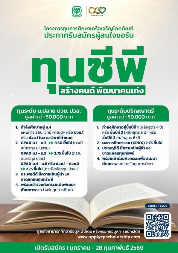 EZ Webmaster November 27, 2025 EZ Webmaster November 27, 2025 เครือเจริญโภคภัณฑ์ (CP) เปิดรับสมัครทุนการศึกษา ปี 2569 เครือเจริญโภคภัณฑ์ (ซีพี) เปิดรับสมัครทุนการศึกษา ปี 2569 รวม 140 ทุน เรียนฟรี ไม่มีพันธะใช้ทุน สนับสนุนเยาวชนไทยต่อยอดสู่อนาคต เครือเจริญโภคภัณฑ์ (CP Group) ประกาศเปิดรับสมัคร ทุนการศึกษา ปีการศึกษา 2569 เพื่อมอบโอกาสทางการศึกษาแก่เยาวชนไทยที่มีความสามารถ ขยันตั้งใจเรียน และมีความประพฤติดี แต่ขาดโอกาสทางการเงิน โดยปีนี้เปิดรับจำนวน รวม 140 ทุน ครอบคลุมหลายระดับการศึกษา ตั้งแต่มัธยมปลายจนถึงปริญญาตรี 🎓 ประเภททุนที่เปิดรับสมัคร ระดับการศึกษา จำนวนทุน ระยะเวลาสนับสนุน ม.ปลาย 30 ทุน 3 ปี (จนจบ ม.6) ปวช. 10 ทุน 3 ปี จนจบ ปวช. ปวส. 10 ทุน 2 ปี จนจบ ปวส. ปริญญาตรี 90 ทุน 3 ปี (หรือจนจบหลักสูตร) 📌 สิทธิประโยชน์ของผู้ได้รับทุน ✔ เรียนฟรีตามระยะเวลาที่กำหนดในแต่ละระดับ✔ ไม่มีภาระผูกพันใช้ทุน หลังเรียนจบ✔ ได้เข้าร่วมกิจกรรมพัฒนา Soft Skills และ Leadership กับเครือซีพี✔ ได้รับการดูแลและติดตามผลการเรียนอย่างต่อเนื่อง✔ มีโอกาสได้รับการพิจารณา “ทุนต่อระดับ” หากมีผลการเรียนและความประพฤติดี✔ ได้รับใบประกาศนียบัตรรับรองการพัฒนาศักยภาพจากโครงการ✔ มีโอกาสเชื่อมต่อสู่ฝึกงานหรือทำงานในองค์กรของซีพี (ตามความสมัครใจ) 🧑🎓 คุณสมบัติพื้นฐานของผู้สมัคร 1️⃣ กำลังศึกษาอยู่ในระดับ ม.ต้น / ม.ปลาย / ปวช. / ปวส. หรือมหาวิทยาลัย (ตามทุนที่สมัคร)2️⃣ มีผลการเรียนตามเกณฑ์ขั้นต่ำ (เกณฑ์ขึ้นอยู่กับระดับและประเภททุน)3️⃣ มีความประพฤติดี มีวินัย ขยัน และตั้งใจเรียน4️⃣ ขาดโอกาสทางการเงิน หรือมีความจำเป็นพิเศษด้านครอบครัว5️⃣ สามารถเข้าร่วมกิจกรรมพัฒนาและอบรมตามที่โครงการกำหนดได้ 📅 กำหนดการสมัคร 📌 เปิดรับสมัคร:1 มกราคม – 28 กุมภาพันธ์ 2569 📌 ช่องทางการสมัคร:สมัครผ่าน โรงเรียนหรือสถานศึกษาเท่านั้น 📎 โรงเรียนจะเป็นผู้คัดกรองและส่งเอกสารมายังโครงการทุนของเครือซีพี 🗂 เอกสารที่ต้องเตรียม (เบื้องต้น) ใบสมัคร (ตามแบบของโครงการทุนซีพี) สำเนาบัตรประชาชน / ทะเบียนบ้าน ใบแสดงผลการเรียน (ปพ.1 / Transcript) หนังสือรับรองสถานภาพครอบครัว หรือเอกสารยืนยันฐานะ หนังสือรับรองความประพฤติจากครูหรือผู้บริหารสถานศึกษา (รายละเอียดเอกสารเพิ่มเติมให้ดูในประกาศอย่างเป็นทางการ) 🎯 เป้าหมายของโครงการทุนซีพี ทุนซีพีไม่ได้เป็นเพียงทุนสนับสนุนค่าเรียน แต่เป็นโครงการที่มุ่ง สร้างคนรุ่นใหม่ที่มีความสามารถ มีคุณธรรม และพร้อมเติบโตเป็นกำลังสำคัญของชาติ ทั้งในด้านเศรษฐกิจ สังคม และการพัฒนาชุมชน 📄 ดูรายละเอียดเพิ่มเติมและดาวน์โหลดประกาศทุนอย่างเป็น