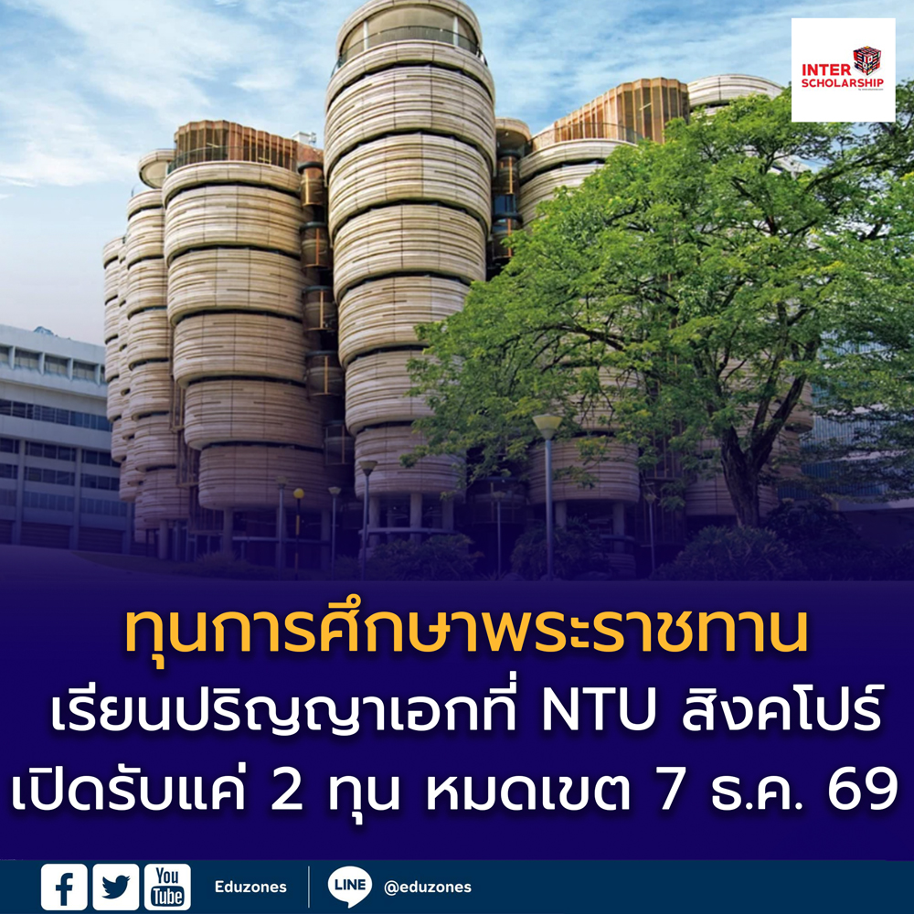 EZ Webmaster November 28, 2025 EZ Webmaster November 28, 2025 ทุนปริญญาเอกจาก NTU สิงคโปร์ ประจำปี 2569 📰 ทุนปริญญาเอกจาก NTU สิงคโปร์ ประจำปี 2569 ด้วย มหาวิทยาลัยเทคโนโลยีนันยาง (Nanyang Technological University: NTU) สาธารณรัฐสิงคโปร์ ได้ทูลเกล้าฯ ถวายทุนการศึกษาแด่ สมเด็จพระกนิษฐาธิราชเจ้า กรมสมเด็จพระเทพรัตนราชสุดาฯ เพื่อพระราชทานแก่ผู้มีคุณสมบัติเหมาะสม เข้าศึกษาต่อระดับ ปริญญาเอก (Ph.D.) ใน สาขาวิศวกรรมศาสตร์ หรือ วิทยาศาสตร์และเทคโนโลยี ณ NTU สิงคโปร์ ประจำปีการศึกษา 2569 (ค.ศ. 2026) จำนวน 2 ทุนการศึกษา ด้วยหลักสูตรภาษาอังกฤษ 🎓 สาขาที่เปิดรับสมัคร (10 สาขา)1️⃣ College of Computing and Data Science2️⃣ School of Chemistry, Chemical Engineering and Biotechnology (CCEB)3️⃣ School of Civil and Environmental Engineering (CEE)4️⃣ School of Mechanical and Aerospace Engineering (MAE)5️⃣ School of Electrical and Electronic Engineering (EEE)6️⃣ School of Materials Science and Engineering (MSE)7️⃣ School of Physical and Mathematical Sciences (SPMS)8️⃣ School of Biological Sciences (SBS)9️⃣ The Asian School of the Environment (ASE)🔟 Lee Kong Chian School of Medicine 📜 ข้อมูลทุนการศึกษา ระดับปริญญาเอก (Ph.D.) ระยะเวลาทุน ไม่เกิน 4 ปี ยกเว้นค่าลงทะเบียนเรียนทั้งหมด เงินสนับสนุนรายเดือน 2,700 SGDและเพิ่มเป็น 3,200 SGD หลังสอบผ่าน Qualifying Exam (QE) ✨ ไม่มีข้อผูกพันชดใช้ทุน 🗓️ หมดเขตรับสมัคร: วันที่ 7 ธันวาคม 2568 🔍 รายละเอียดเพิ่มเติมและสมัครได้ที่เว็บไซต์: https://www.princess-it.org/scholarship/ntu/2026-ntu/2026-ntu-announce-apply/ 📞 ติดต่อสอบถาม📱 062-229-6468 (เรณุกา)📱 081-829-1759 (เบญญาภา)