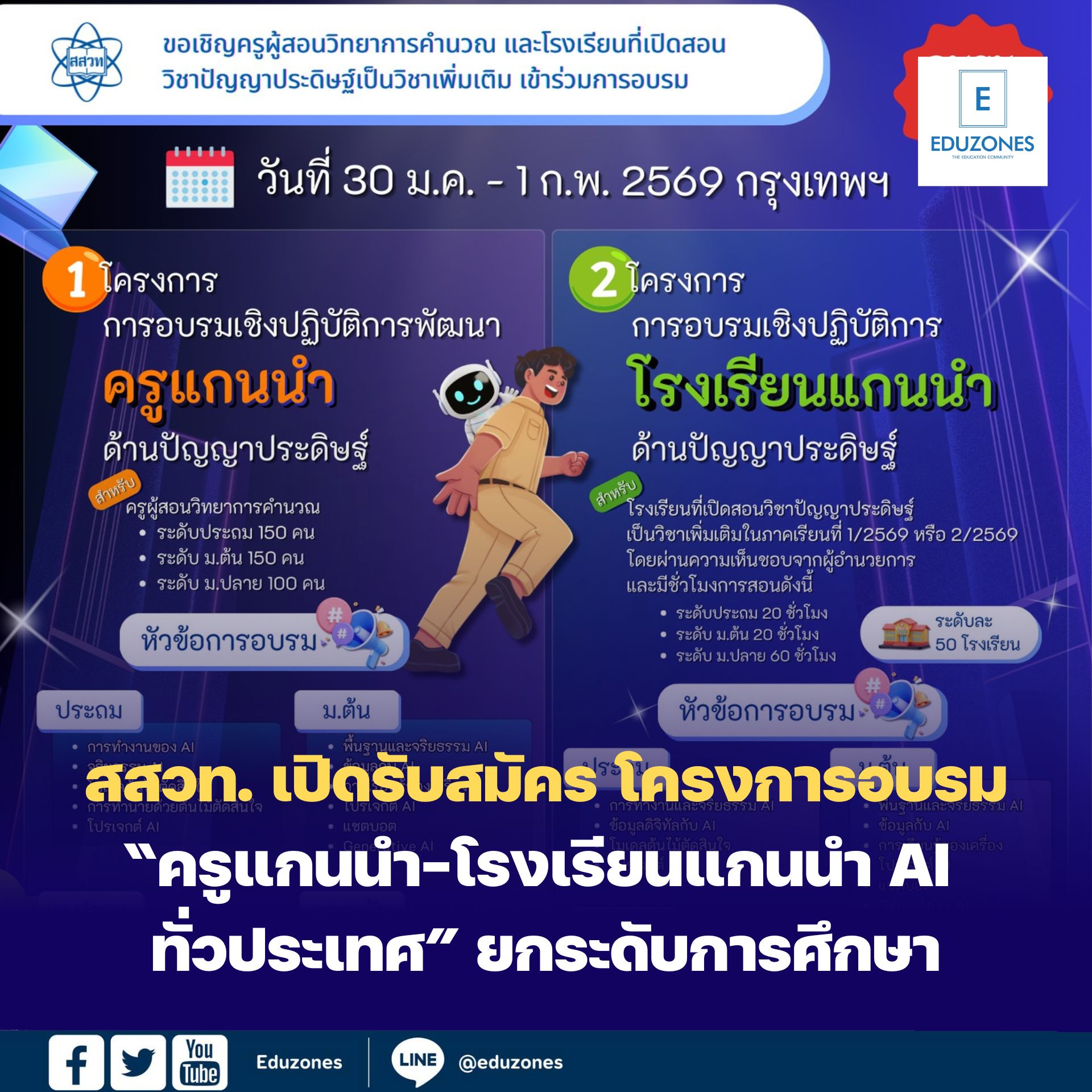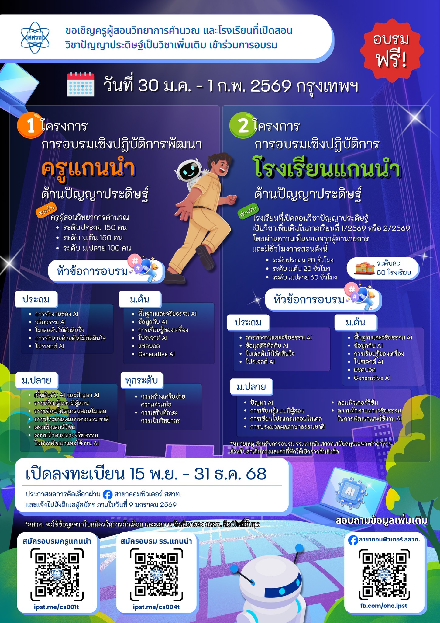EZ Webmaster November 28, 2025 EZ Webmaster November 28, 2025 สสวท. เปิดรับสมัครอบรมฟรี โครงการอบรมเชิงปฏิบัติการ “ครูแกนนำ-โรงเรียนแกนนำ AI ทั่วประเทศ” ยกระดับการศึกษาไทยสู่ยุคปัญญาประดิษฐ์ สสวท. เปิดรับสมัครอบรมฟรี โครงการอบรมเชิงปฏิบัติการ “ครูแกนนำ-โรงเรียนแกนนำ AI ทั่วประเทศ” ยกระดับการศึกษาไทยสู่ยุคปัญญาประดิษฐ์ สถาบันส่งเสริมการสอนวิทยาศาสตร์และเทคโนโลยี (สสวท.) ขอเชิญชวนครูผู้สอนวิทยาการคำนวณและโรงเรียนที่เปิดสอนวิชาปัญญาประดิษฐ์เป็นวิชาเพิ่มเติมทั่วประเทศ เข้าร่วมอบมรมฟรี “โครงการอบรมเชิงปฏิบัติการ ระหว่างวันที่ 30 มกราคม – กุมภาพันธ์ 2569 กรุงเทพฯ เพื่อยกระดับความรู้และทักษะด้านปัญญาประดิษฐ์ (AI) ในระบบการศึกษาไทย โดยเปิดรับสมัคร 2 โครงการหลัก คือ โครงการอบรมเชิงปฏิบัติการพัฒนาครูแกนนำด้านปัญญาประดิษฐ์ สำหรับครูผู้สอนรายวิชาเทคโนโลยี (วิทยาการคำนวณ) ทุกระดับชั้น (ประถม-มัธยม) จำนวน 400 คน สมัครได้ที่ https://ipst.me/cs001t และโครงการอบรมเชิงปฏิบัติการพัฒนาโรงเรียนแกนนำด้านปัญญาประดิษฐ์ สำหรับโรงเรียนที่พร้อมเปิดสอนวิชา AI เป็นวิชาเพิ่มเติมในภาคเรียนที่ 1/2569 หรือ 2/2569 จำนวน 50 โรงเรียน สมัครได้ที่ https://ipst.me/cs004t ตั้งแต่วันนี้ – 31 ธันวาคม 2568 สอบถามและประกาศผลการคัดเลือกที่Facebook สาขาคอมพิวเตอร์ สสวท. https://www.facebook.com/oho.ipst
