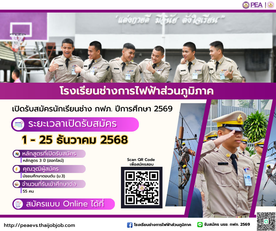 EZ Webmaster December 1, 2025 EZ Webmaster December 1, 2025 โรงเรียนช่างการไฟฟ้าส่วนภูมิภาค เปิดรับสมัครนักเรียนใหม่ ปี 2569 📢 โรงเรียนช่างการไฟฟ้าส่วนภูมิภาค เปิดรับสมัครนักเรียนใหม่ ปี 2569โอกาสทองสำหรับนักเรียน ม.3 และผู้ปกครองที่กำลังมองหาเส้นทางอาชีพ มั่นคง มีรายได้แน่นอน และมีงานรองรับทันทีหลังจบ 🎓 หลักสูตรช่างไฟฟ้าภายใน 3 ปี (ฮอทไลน์)เรียนฟรี มีทุนต่อปริญญาตรีสายวิศวกรรม และมีเส้นทางบรรจุเป็นพนักงาน กฟภ. (PEA) 🔍 คุณสมบัติผู้สมัคร 👨🎓 สำเร็จการศึกษาระดับ ม.3 ปีการศึกษา 2567–2568🎂 เกิดระหว่าง 1 ม.ค. 2552 – 31 มี.ค. 2554🛠️ รับจำนวน 55 คน เท่านั้น 📅 กำหนดการรับสมัคร รายการ วัน/เวลา เปิดรับสมัครออนไลน์ 1 – 25 ธ.ค. 2568 ชำระค่าสมัครได้ถึง 26 ธ.ค. 2568 เวลา 22.00 น. 🖥️ สมัครออนไลน์ได้ที่ 👉 https://peaevs.thaijobjob.com📘 คู่มือรับสมัคร ปี 2569 👉 https://file.thaijobjob.com/prakad/peaevs202512/peaevs202512_5 💡 จุดเด่นของหลักสูตร 💜 เรียนฟรี ไม่มีค่าเทอม💜 มีทุนต่อระดับปริญญาตรี สายวิศวกรรม💜 จบแล้วมีงานรองรับ บรรจุเป็นพนักงาน กฟภ.💜 วิชาชีพตรงสาย รองรับตลาดแรงงานยุคพลังงานไฟฟ้าและระบบ Smart Grid ✨ เส้นทางมั่นคง ชัดเจน ตั้งแต่เริ่มเรียนจนถึงวันทำงานเรียนที่นี่ = เตรียมเป็นพนักงาน กฟภ. อย่างเต็มตัว 📱 สอบถามเพิ่มเติมLine OpenChat 👉 https://bit.ly/3J2V9Z7