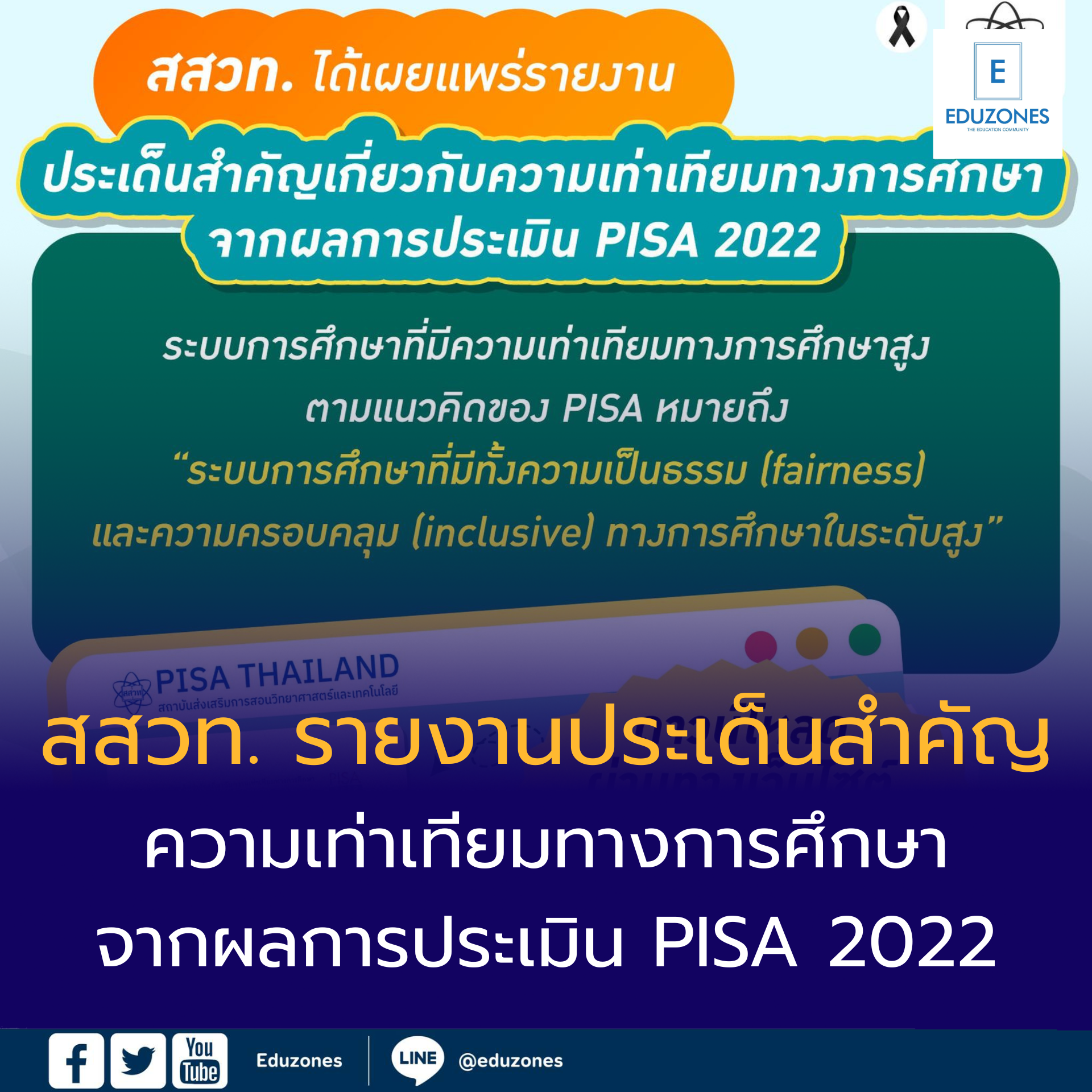 EZ Webmaster December 2, 2025 EZ Webmaster December 2, 2025 สสวท. เผยรายงานประเด็นสำคัญเกี่ยวกับความเท่าเทียมทางการศึกษา จากผลการประเมิน PISA 2022 สสวท. เผยรายงานประเด็นสำคัญเกี่ยวกับความเท่าเทียมทางการศึกษา จากผลการประเมิน PISA 2022 สถาบันส่งเสริมการสอนวิทยาศาสตร์และเทคโนโลยี (สสวท.) เผยแพร่รายงาน “ประเด็นสำคัญเกี่ยวกับความเท่าเทียมทางการศึกษาจากผลการประเมิน PISA 2022″ นำเสนอภาพรวมระบบการศึกษาที่ให้ความสำคัญต่อความเป็นธรรม (Fairness) และความครอบคลุม (Inclusive) ทางการศึกษาในระดับสูง พร้อมวิเคราะห์การเปลี่ยนแปลงด้านความเท่าเทียมของประเทศที่เข้าร่วมในช่วงที่ผ่านมา ตลอดจนประเด็นความแตกต่างของนักเรียน ซึ่งสะท้อนความหลากหลายและความท้าทายทางการศึกษาทั่วโลก สสวท. ขอเชิญชวนคุณครู และผู้ที่สนใจร่วมเรียนรู้ข้อมูลสำคัญ และดาวน์โหลดรายงานฉบับเต็มได้ทางเว็บไซต์ PISA Thailand ที่ https://pisathailand.ipst.ac.th/pisa2022-equity-in-education/