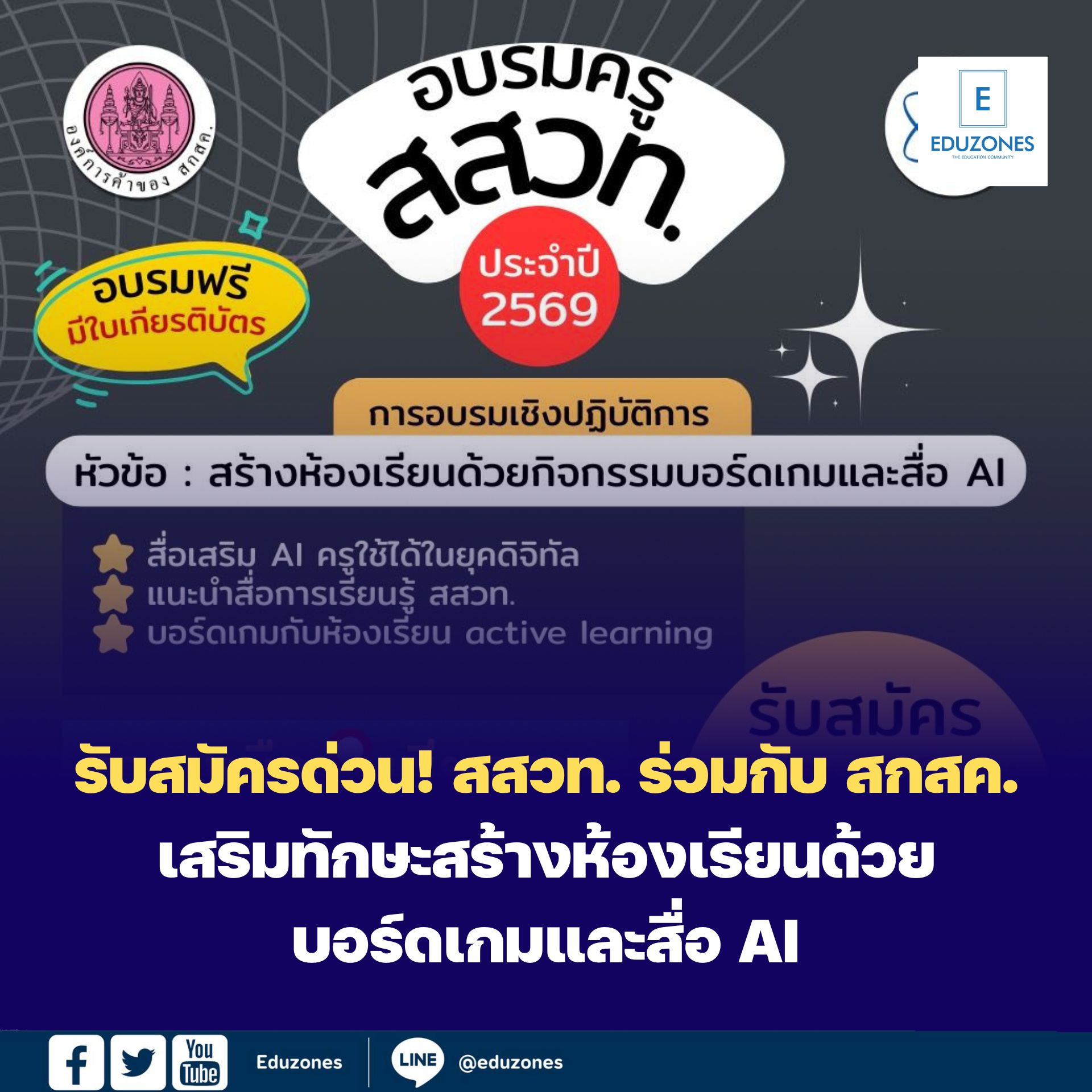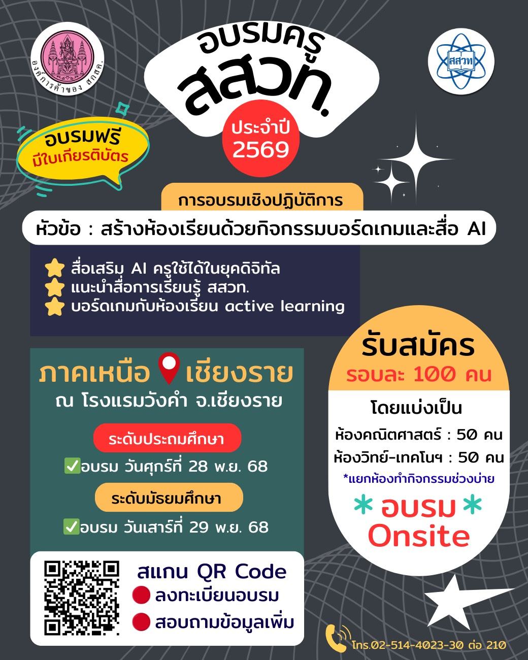EZ Webmaster December 2, 2025 EZ Webmaster December 2, 2025 รับสมัครด่วน! สสวท. ร่วมกับองค์การค้าของ สกสค. เปิดอบรมครูโซนเหนือ เสริมทักษะสร้างห้องเรียนด้วยบอร์ดเกมและสื่อ AI ที่เชียงราย รับสมัครด่วน! สสวท. ร่วมกับองค์การค้าของ สกสค. เปิดอบรมครูโซนเหนือ เสริมทักษะสร้างห้องเรียนด้วยบอร์ดเกมและสื่อ AI ที่เชียงราย สถาบันส่งเสริมการสอนวิทยาศาสตร์และเทคโนโลยี (สสวท.) ร่วมกับองค์การค้าของ สกสค. เปิดรับสมัครครูที่สังกัดโรงเรียนในพื้นที่ภาคเหนือ เข้าร่วมอบรมเชิงปฏิบัติการ หัวข้อ “สร้างห้องเรียนด้วยกิจกรรมบอร์ดเกมและสื่อ AI” เพื่อยกระดับทักษะครูยุคดิจิทัลในการออกแบบการสอนแบบ Active Learning ด้วยสื่อ AI และบอร์ดเกม โดยระดับประถมศึกษา อบรมวันที่ 28 พ.ย. 68 และระดับมัธยมศึกษา อบรมวันที่ 29 พ.ย. 68 ณ โรงแรมวังคำ จ.เชียงราย แบ่งกลุ่มอบรมตามสาขา ได้แก่ คณิตศาสตร์ 50 คน และ วิทยาศาสตร์–เทคโนโลยี 50 คน รวม 100 คน อบรมฟรี พร้อมรับเกียรติบัตร ดูรายละเอียด และสอบถามเพิ่มเติมได้ที่ https://teaching.suksapanpanit.com/th/training/ipst โทร. 0 2514 4023 – 30 ต่อ 210