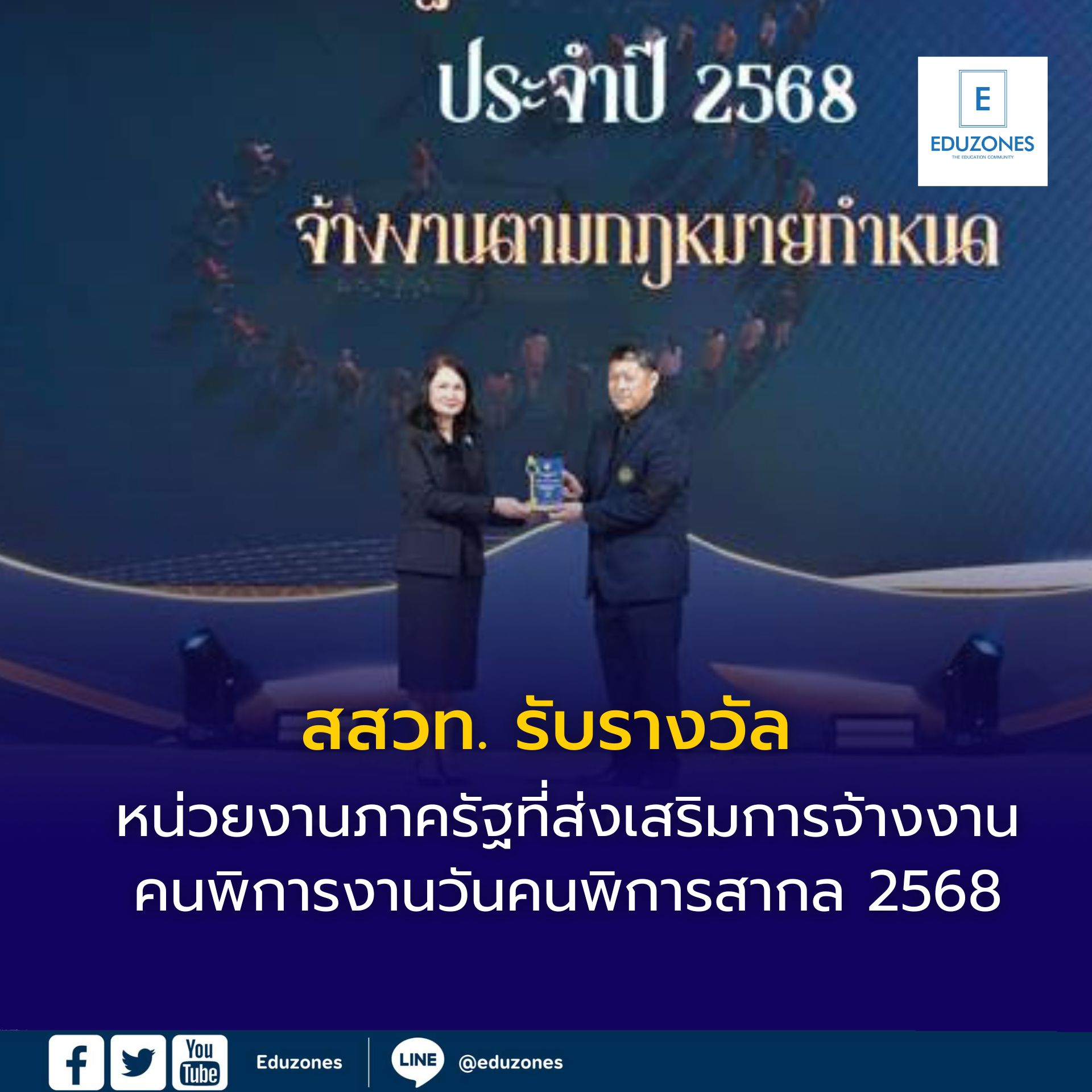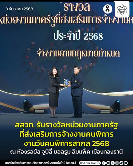 EZ Webmaster December 8, 2025 EZ Webmaster December 8, 2025 สสวท. รับรางวัลหน่วยงานภาครัฐที่ส่งเสริมการจ้างงานคนพิการงานวันคนพิการสากล 2568 สสวท. รับรางวัลหน่วยงานภาครัฐที่ส่งเสริมการจ้างงานคนพิการงานวันคนพิการสากล 2568 นนทบุรี (3 ธันวาคม 2568) – สถาบันส่งเสริมการสอนวิทยาศาสตร์และเทคโนโลยี (สสวท.) เข้ารับรางวัลเชิดชูเกียรติในฐานะหน่วยงานภาครัฐที่ส่งเสริมการจ้างงานคนพิการ ประจำปี 2568 ตอกย้ำภารกิจองค์กรยุคใหม่ที่ให้ความสำคัญกับความเท่าเทียมและการพัฒนาคุณภาพชีวิตคนพิการอย่างยั่งยืน นายกุลกวี ชินสกุลรัตนชัย ผู้ช่วยผู้อำนวยการ สสวท. เป็นผู้แทนหน่วยงานเข้ารับโล่ประกาศเกียรติคุณดังกล่าว จากนางสาวสนธยา บุณยภูษิต อธิบดีกรมส่งเสริมและพัฒนาคุณภาพชีวิตคนพิการ ภายในงานวันคนพิการสากล ประจำปี 2568 ซึ่งจัดขึ้นโดยกระทรวงการพัฒนาสังคมและความมั่นคงของมนุษย์ (พม.) ณ ห้องรอยัล จูบิลี่ บอลรูม อาคารชาเลนเจอร์ อิมแพ็ค เมืองทองธานี การได้รับรางวัลในครั้งนี้ เป็นผลจากการดำเนินนโยบายของ สสวท. ที่สอดรับกับพระราชบัญญัติส่งเสริมและพัฒนาคุณภาพชีวิตคนพิการ พ.ศ. 2550 ในการเปิดโอกาสรับคนพิการที่มีศักยภาพเข้าทำงานในองค์กร (อัตราส่วน 100:1) โดยปัจจุบันมีบุคลากรคนพิการปฏิบัติงานจริงจำนวน 3 ราย ซึ่งถือเป็นการสนับสนุนให้คนพิการมีอาชีพ มีรายได้ และได้รับการยอมรับในฐานะพลังสำคัญขององค์กร งานวันคนพิการสากลในปีนี้ มีนายอัครา พรหมเผ่า รัฐมนตรีว่าการกระทรวง พม. เป็นประธาน ภายใต้แนวคิด “การส่งเสริมสังคมที่ครอบคลุมและเอื้อต่อคนพิการ เพื่อขับเคลื่อนความก้าวหน้าและการพัฒนาทางสังคมอย่างยั่งยืน” (Fostering disability inclusive societies for advancing social progress) โดยภายในงานมีการมอบรางวัลแก่หน่วยงานและบุคคลที่มีผลงานดีเด่นด้านคนพิการ รวมถึงการจัดแสดงนวัตกรรมและเทคโนโลยีเพื่อยกระดับคุณภาพชีวิตคนพิการจากภาคีเครือข่ายทั่วประเทศ