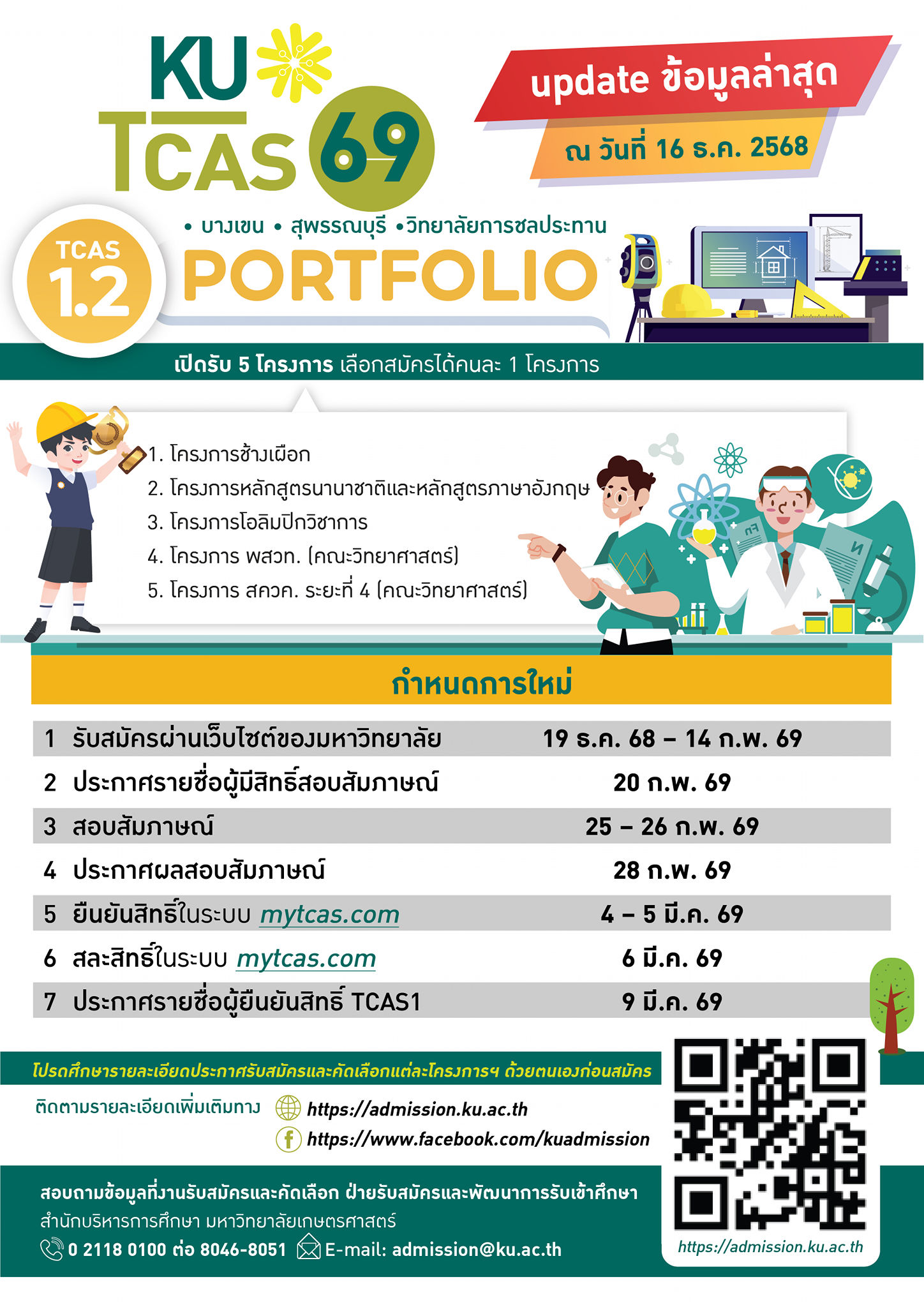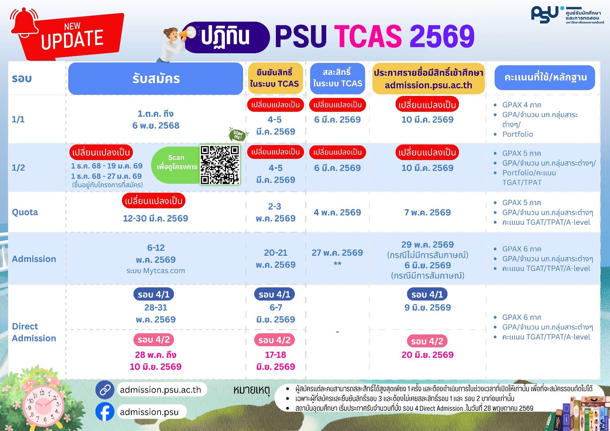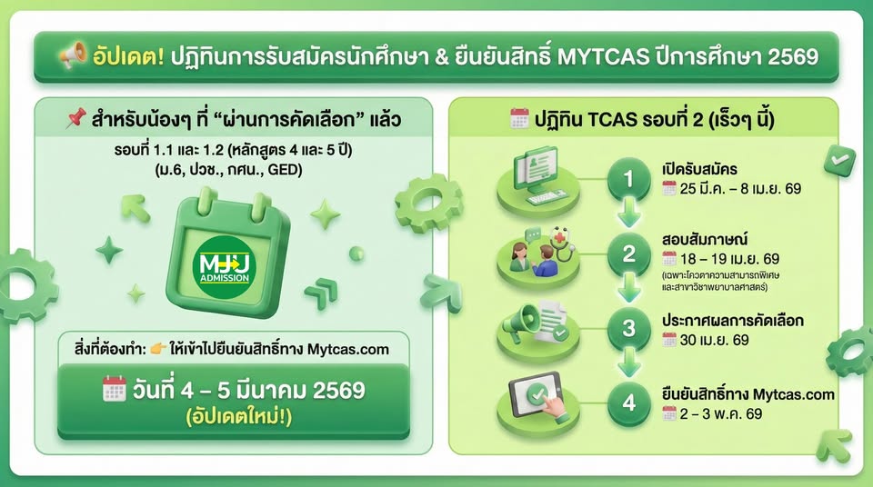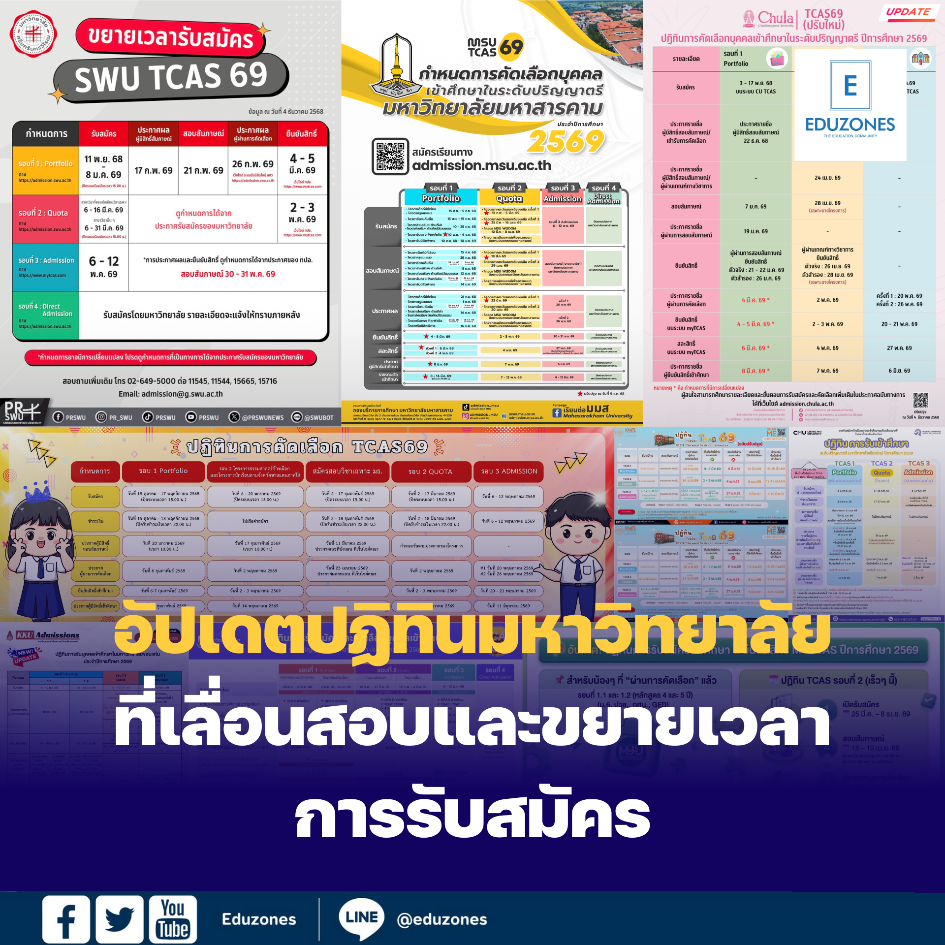 EZ Webmaster December 12, 2025 EZ Webmaster December 12, 2025 อัปเดตปฏิทินมหาวิทยาลัยที่เลื่อนสอบ และขยายเวลาการรับสมัคร อัปเดตปฏิทินมหาวิทยาลัยที่เลื่อนสอบ และขยายเวลาการรับสมัคร อัปเดตล่าสุดสำหรับน้อง ๆ ที่กำลังรอสอบเข้ามหาวิทยาลัย หลายมหาวิทยาลัยได้มีการ เลื่อนวันสอบและขยายเวลาการรับสมัคร เพื่อเปิดโอกาสให้ผู้สมัครเตรียมตัวได้มากขึ้น ใครสมัครอยู่หรือกำลังตัดสินใจ ห้ามพลาดอัปเดตนี้เด็ดขาด! มหาวิทยาลัยศรีนครินทรวิโรฒ ปรับปฏิทิน TCAS69 เลื่อนวันรับสมัครรอบ Portfolio ออกไปเป็น 8 มกราคม 2569 (จากเดิมปิดรับ 11 ธ.ค. 68) และ เลื่อนรอบ Quota ไปเป็นเดือนมีนาคม 69 (จากเดิมกุมภาพันธ์ 69) มหาวิทยาลัยมหาสารคาม การสอบกลาง TGAT/TPAT2-5 (ซึ่งเป็นส่วนหนึ่งของระบบ TCAS69) มีบางสนามสอบที่ตั้งอยู่ในพื้นที่ที่มี สถานการณ์ความไม่สงบใกล้ชายแดนไทย-กัมพูชา ส่งผลให้เกิดความเสี่ยงต่อความปลอดภัยของผู้เข้าสอบ เจ้าหน้าที่ และบุคลากรสนามสอบ ประกาศปฏิทิน TCAS69 ของ มมส. จะอิงตามกรอบเวลาของ ทปอ. จุฬาลงกรณ์มหาวิทยาลัย เลื่อนวันรับสมัครและสอบวิชาเฉพาะ ในหลายรอบ (Portfolio, Quota, Early Admission, Admission) และ เลื่อนสอบ TGAT/TPAT รอบ 1 Portfolio (รับ 3-17 พ.ย.68) รอบ 2 โควตา (รับ 7-12 มี.ค.69) รอบ 3 Admission (รับ 6-12 พ.ค.69) มหาวิทยาลัยธรรมศาสตร์ ปิดรับสมัคร TCAS69 รอบ Portfolio ตั้งแต่ 17 พฤศจิกายน 2568 ที่อยู่ในระหว่างการดำเนินการคัดเลือก หรือประมวลผล และเตรียมจะประกาศรายชื่อผู้มีสิทธิ์สัมภาษณ์ ในวันที่ 20 มกราคม 2569 นี้ แต่มีการเลื่อนสอบออกไป ทางมหาวิทยาลัยจึงปรับปฏิทินในบางโครงการ บางคณะ/สาขาวิชาใหม่ รอบ Portfolio รับสมัคร ต.ค.-พ.ย. 68 (ปรับใหม่บางส่วน) ส่วนรอบ Quota รับสมัคร ก.พ. 69 และต้องเตรียมสอบวิชาเฉพาะ มธ. เปิดรับสมัคร ก.พ. 69 และสอบ มี.ค. 69 ใช้ในรอบ 2 และ 3 สถาบันเทคโนโลยีพระจอมเกล้าเจ้าคุณทหารลาดกระบัง Portfolio (ประกาศผลปลาย ก.พ. 69) และรอบ Quota (เริ่มรับสมัคร มี.ค. 69) พร้อมทั้งมีการ เลื่อนสอบ TGAT/TPAT สำหรับพื้นที่ภาคใต้ (นครศรีธรรมราช, สุราษฎร์ธานี, ปัตตานี, สตูล) จากเดิม 13-15 ธ.ค. 68 ไปเป็น 17-19 ม.ค. 69 มหาวิทยาลัยเชียงใหม่ กำหนดวันประกาศชื่อผู้ผ่านการคัดเลือก, วันจัดการสิทธิ์ mytcas และวันประกาศชื่อผู้มีสิทธิ์เข้าศึกษา แต่สำหรับรอบ Quota นั้น จะมีการเลื่อนวันรับสมัคร, วันประกาศรายชื่อผู้มีสิทธิ์เข้ารับการคัดเลือก และวันทดสอบวิชาเฉพาะ เท่านั้น ส่วนกำหนดตั้งแต่ประกาศชื่อผู้มีสิทธิ์สอบสัมภาษณ์เป็นต้นไป ยังเป็นไปตามเดิม รอบ Portfolio รับสมัคร 4 – 13 พ.ย 68 รอบ Quota รับสมัคร 17-26 ก.พ 69 มหาวิทยาลัยขอนแก่น กำหนดการรอบ Portfolio 1.2 ไปอีกประมาณ 1 เดือน โดยจะเริ่มรับสมัคร 20 – 25 มกราคม 2569 เป็นต้นไป ส่วนรอบ Quota ยังคงรับในเดือนมีนาคม 2569 ตามเดิม เพียงแต่เลื่อนวันรับสมัครออกไปเป็น