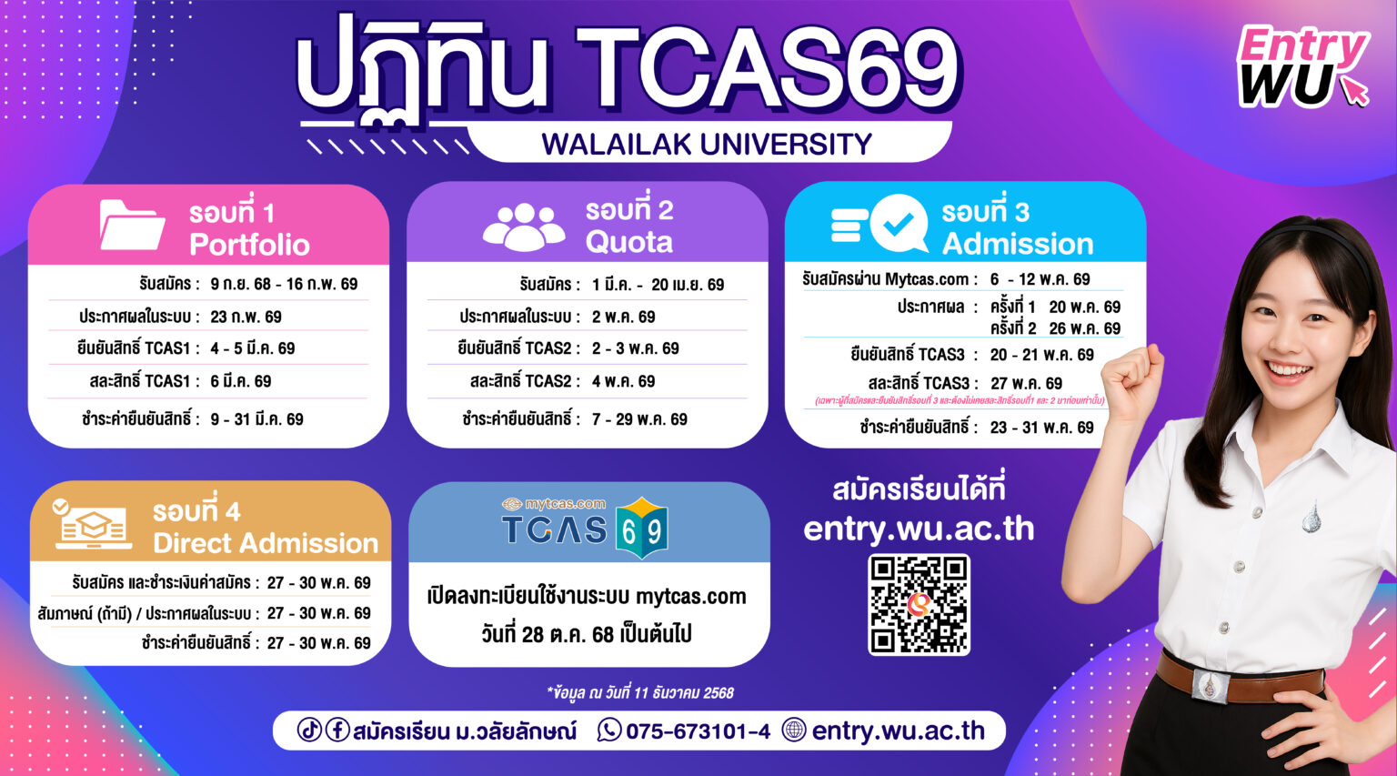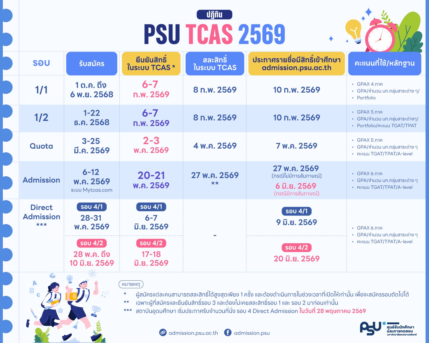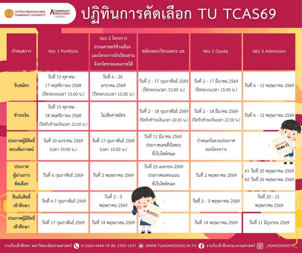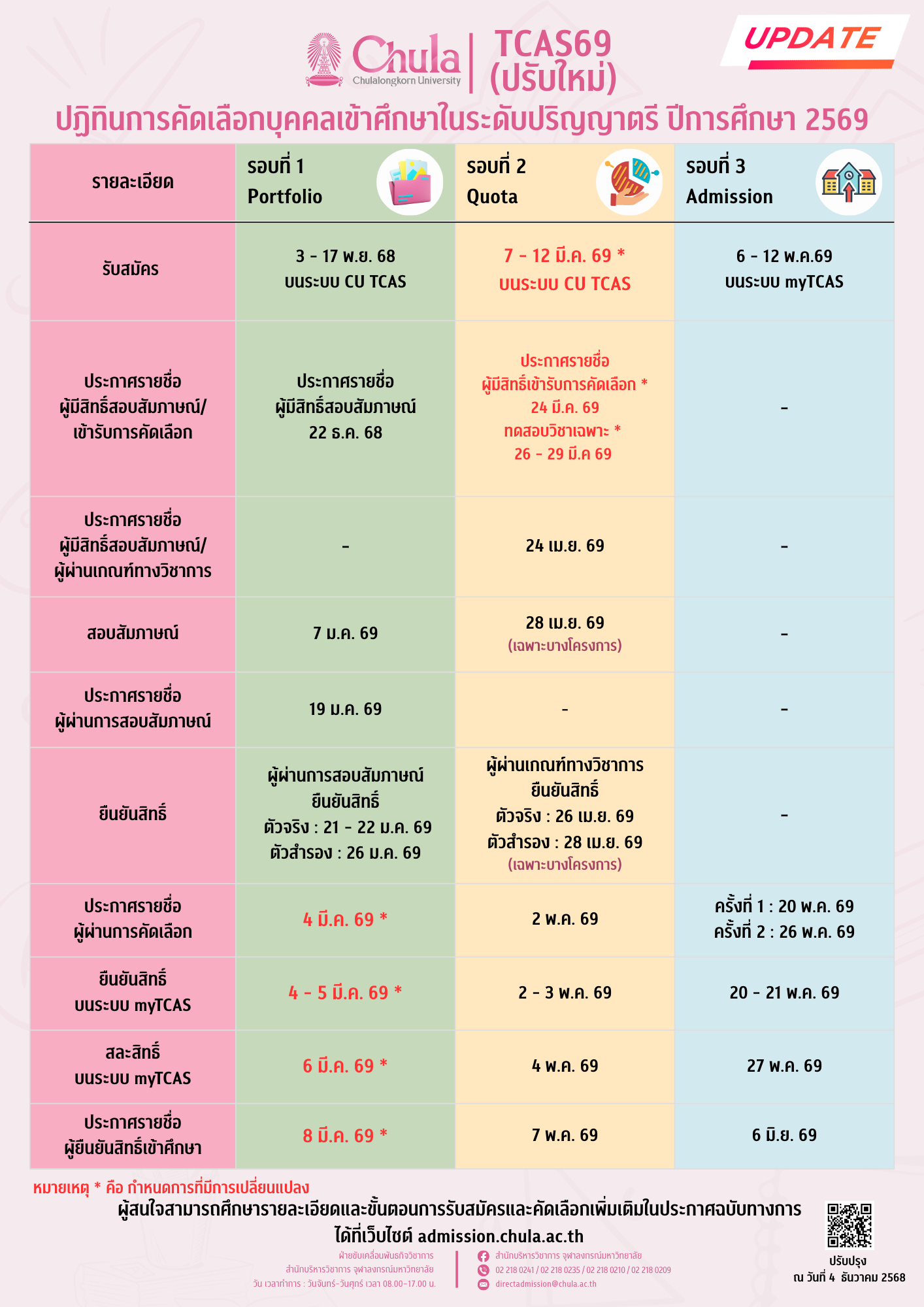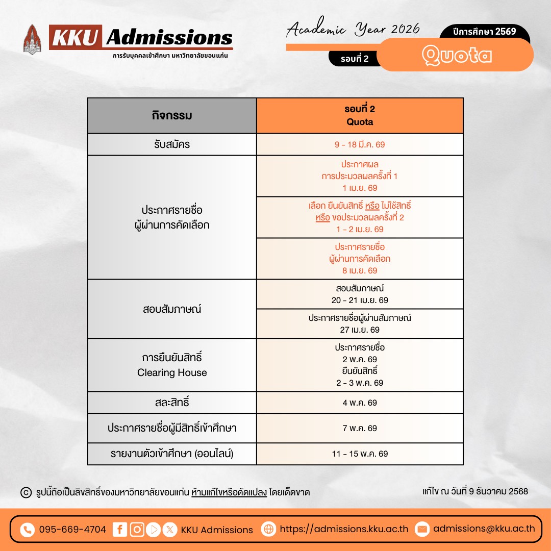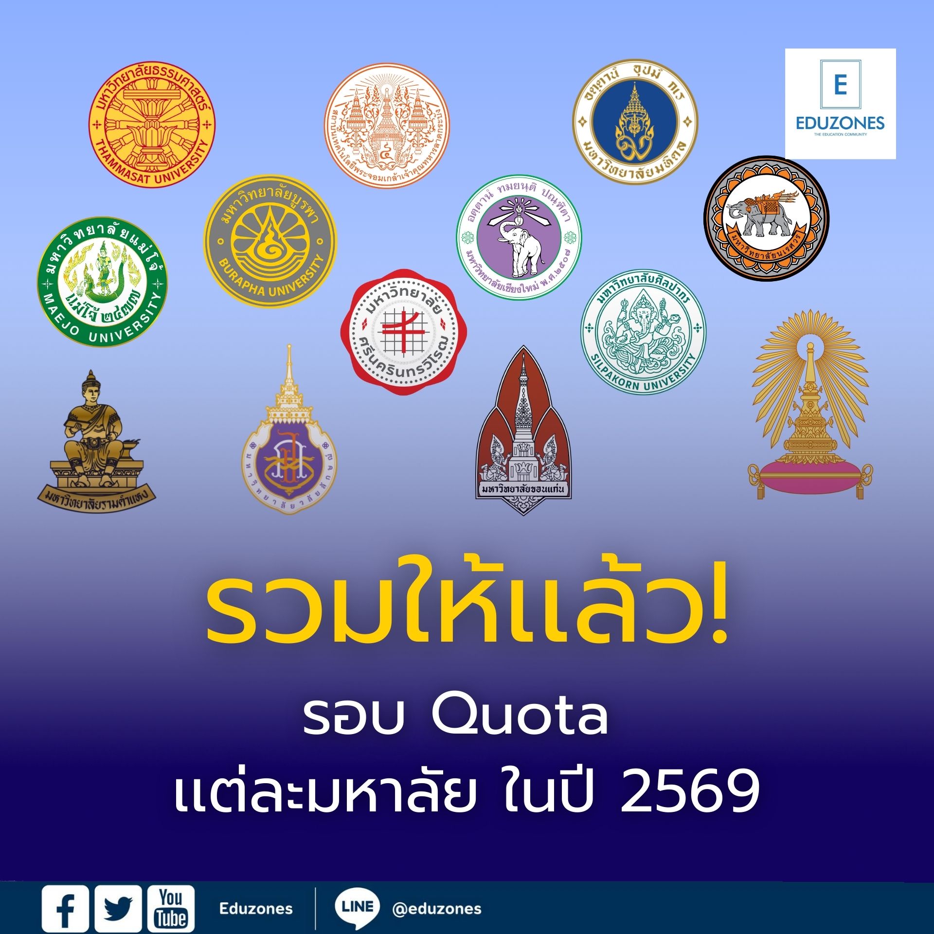 EZ Webmaster December 22, 2025 EZ Webmaster December 22, 2025 รวมให้เเล้ว! รอบ Quota เเต่ละมหาลัย ในปี 2569 รวมให้เเล้ว! รอบ Quota เเต่ละมหาลัย ในปี 2569 เข้าสู่ช่วงเวลาสำคัญของน้องๆ #dek69 กันแล้ว หลังจากผ่านพ้นรอบ Portfolio มาได้ไม่นาน ตอนนี้ก็ถึงเวลาของ TCAS69 รอบที่ 2 หรือ “รอบโควตา” (Quota) ซึ่งถือเป็นโอกาสทองของคนที่มีความสามารถพิเศษ หรืออาศัยอยู่ในพื้นที่เขตบริการของมหาวิทยาลัยต่างๆ ความท้าทายสำคัญของรอบนี้คือ “แต่ละมหาวิทยาลัยมีกำหนดการไม่พร้อมกัน” บางแห่งเปิดรับสมัครเร็ว บางแห่งเปิดรับสั้นๆ เพียงไม่กี่วัน หากน้องๆ วางแผนไม่ดีหรือลืมเช็กวันที่ให้แม่นยำ ก็อาจจะพลาดโอกาสเข้าคณะในฝันไปอย่างน่าเสียดาย เพื่อไม่ให้น้องๆ ต้องเสียเวลาไล่เช็กทีละเว็บไซต์ เราได้รวบรวม สรุปวันเปิดรับสมัครรอบ Quota จากมหาวิทยาลัยชั้นนำทั่วประเทศ มาไว้ให้ในที่เดียว! ไม่ว่าจะเป็นจุฬาฯ, ธรรมศาสตร์, เกษตรศาสตร์ หรือมหาวิทยาลัยในส่วนภูมิภาค จะมีที่ไหนเปิดรับช่วงไหน และต้องเตรียมตัวอย่างไรบ้าง ไปเช็กตารางพร้อมกันเลย! 1. จุฬาลงกรณ์มหาวิทยาลัย วันที่เปิดรับสมัครรอบ Quota : 7 – 12 มีนาคม 2569 จำนวนโครงการที่เปิดรับ : 27 โครงการ / 18 คณะ / 105 สาขาวิชา เกณฑ์คะแนน : ใช้คะแนน TGAT/TPAT และ A-Level เป็นหลัก (สัดส่วนตามคณะกำหนด) ควบคู่กับ GPAX ขั้นต่ำ (ส่วนใหญ่ 2.50 หรือ 3.00 ขึ้นไป) ช่องทางการสมัคร ” คลิก ” เว็บไซต์จุฬาลงกรณ์มหาวิทยาลัย ” คลิก ” 2. มหาวิทยาลัยศิลปากร วันที่เปิดรับสมัครรอบ Quota : 17 กุมภาพันธ์ – 5 มีนาคม 2569 จำนวนโครงการที่เปิดรับ : 18–20 โครงการ / 13 คณะ / 150 สาขาวิชา เกณฑ์คะแนน : ใช้คะแนน TGAT/TPAT และ A-Level เป็นหลัก โดยบางคณะ (เช่น สายศิลปะหรือเภสัชฯ) อาจมีการสอบ วิชาเฉพาะ ของมหาวิทยาลัยเพิ่มเติม ช่องทางการสมัคร ” คลิก ” เว็บไซต์มหาวิทยาลัยศิลปากร ” คลิก ” 3. มหาวิทยาลัยศรีนครินทรวิโรฒ วันที่เปิดรับสมัครรอบ Quota : 6 – 31 มีนาคม 2569 จำนวนโครงการที่เปิดรับ : 10–13 โครงการ / 15 คณะ / 80-100 สาขาวิชา เกณฑ์คะแนน : ใช้คะแนน TGAT/TPAT และ A-Level เกือบทุกสาขาวิชา ควบคู่กับ GPAX (มักกำหนดขั้นต่ำ 2.50 หรือ 2.75 ขึ้นไปแล้วแต่คณะ) ช่องทางการสมัคร ” คลิก ” เว็บไซต์มหาวิทยาลัยศรีนครินทรวิโรฒ ” คลิก ” 4. มหาวิทยาลัยมหิดล วันที่เปิดรับสมัครรอบ Quota : 20 มีนาคม – 8 เมษายน 2569 จำนวนโครงการที่เปิดรับ : 20+ โครงการ / 16 คณะ / 100+ สาขาวิชา เกณฑ์คะแนน : ใช้คะแนน TGAT/TPAT และ A-Level เป็นหลัก โดยเฉพาะคณะสายวิทย์สุขภาพจะเน้นคะแนน A-Level วิชาหลักสูงมาก และต้องมี GPAX ตามที่คณะกำหนด ช่องทางการสมัคร ” คลิก ” เว็บไซต์มหาวิทยาลัยมหิดล ” คลิก ” 5. มหาวิทยาลัยเกษตรศาสตร์ วันที่เปิดรับสมัครรอบ Quota : 13 กุมภาพันธ์ – 12 มีนาคม 2569 จำนวนโครงการที่เปิดรับ : 18 โครงการ / 29 คณะ / 248 สาขาวิชา (รวม
