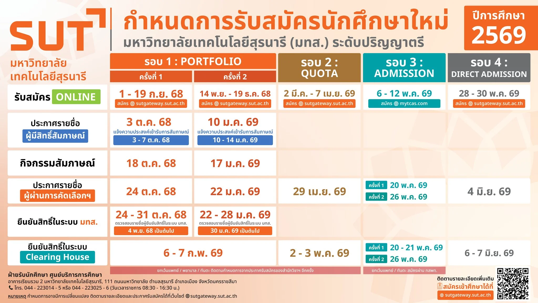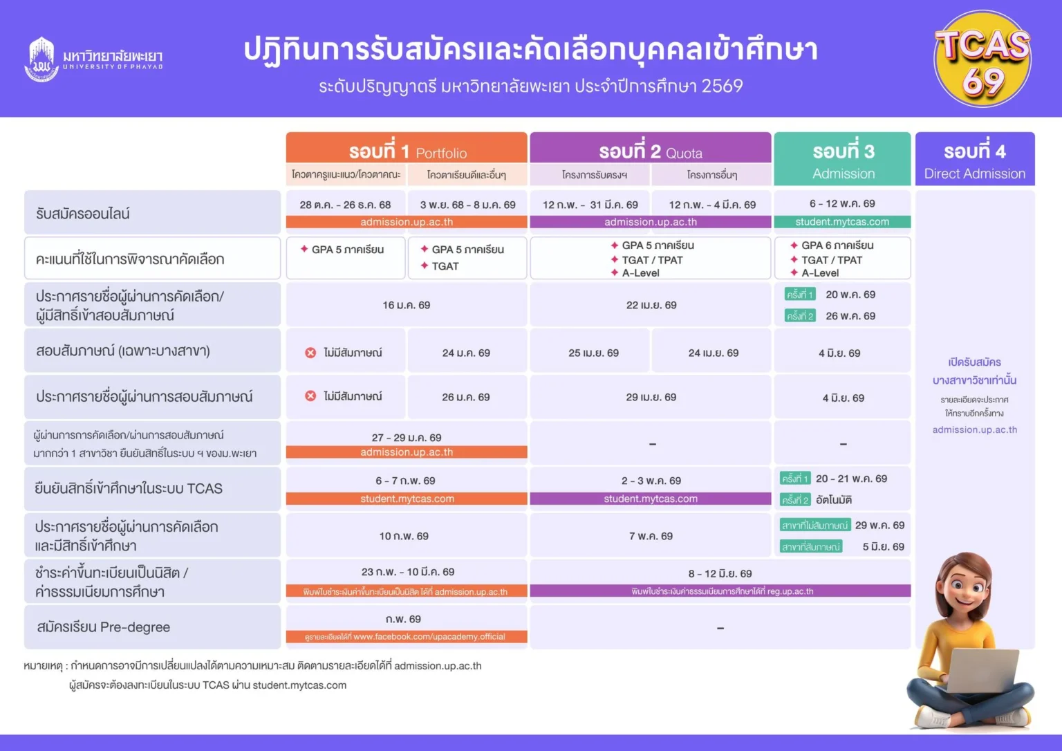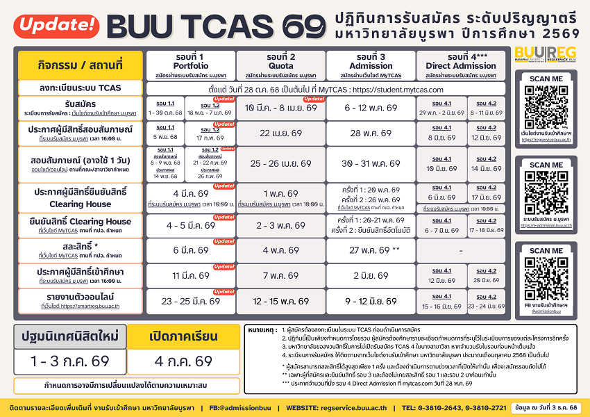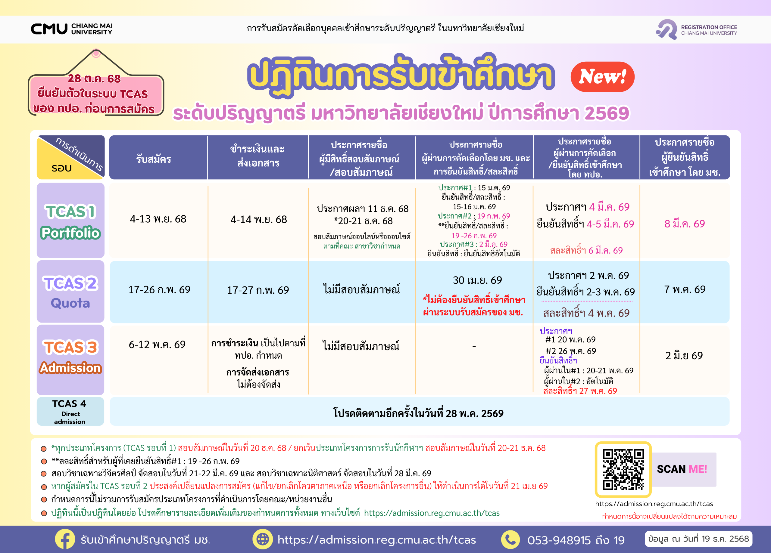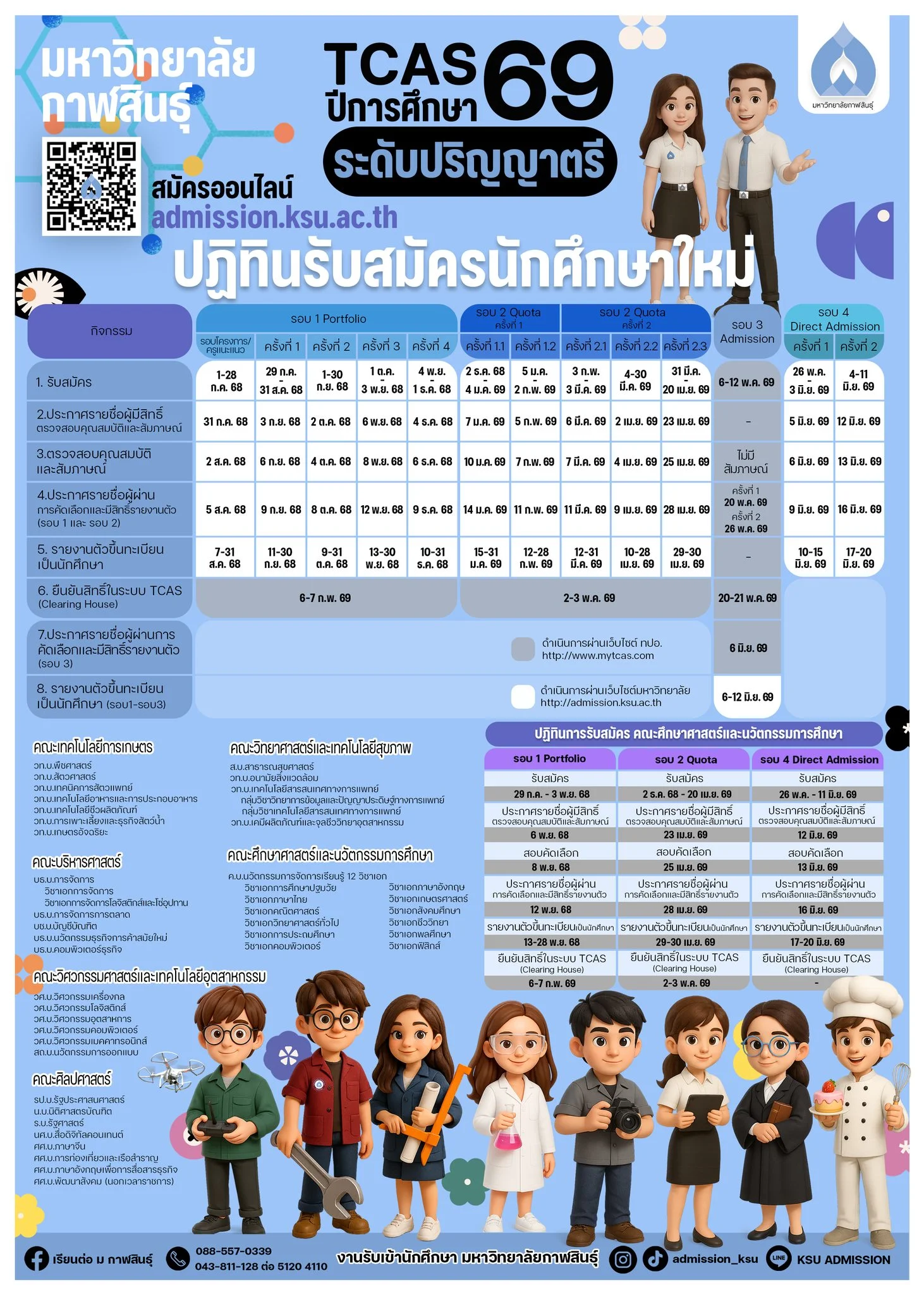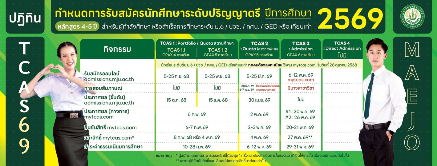 EZ Webmaster December 22, 2025 EZ Webmaster December 22, 2025 รวมให้เเล้ว! รอบ Quota เเต่ละมหาลัย ในปี 2569 รวมให้เเล้ว! รอบ Quota เเต่ละมหาลัย ในปี 2569 เข้าสู่ช่วงเวลาสำคัญของน้องๆ #dek69 กันแล้ว หลังจากผ่านพ้นรอบ Portfolio มาได้ไม่นาน ตอนนี้ก็ถึงเวลาของ TCAS69 รอบที่ 2 หรือ “รอบโควตา” (Quota) ซึ่งถือเป็นโอกาสทองของคนที่มีความสามารถพิเศษ หรืออาศัยอยู่ในพื้นที่เขตบริการของมหาวิทยาลัยต่างๆ ความท้าทายสำคัญของรอบนี้คือ “แต่ละมหาวิทยาลัยมีกำหนดการไม่พร้อมกัน” บางแห่งเปิดรับสมัครเร็ว บางแห่งเปิดรับสั้นๆ เพียงไม่กี่วัน หากน้องๆ วางแผนไม่ดีหรือลืมเช็กวันที่ให้แม่นยำ ก็อาจจะพลาดโอกาสเข้าคณะในฝันไปอย่างน่าเสียดาย เพื่อไม่ให้น้องๆ ต้องเสียเวลาไล่เช็กทีละเว็บไซต์ เราได้รวบรวม สรุปวันเปิดรับสมัครรอบ Quota จากมหาวิทยาลัยชั้นนำทั่วประเทศ มาไว้ให้ในที่เดียว! ไม่ว่าจะเป็นจุฬาฯ, ธรรมศาสตร์, เกษตรศาสตร์ หรือมหาวิทยาลัยในส่วนภูมิภาค จะมีที่ไหนเปิดรับช่วงไหน และต้องเตรียมตัวอย่างไรบ้าง ไปเช็กตารางพร้อมกันเลย! 1. จุฬาลงกรณ์มหาวิทยาลัย วันที่เปิดรับสมัครรอบ Quota : 7 – 12 มีนาคม 2569 จำนวนโครงการที่เปิดรับ : 27 โครงการ / 18 คณะ / 105 สาขาวิชา เกณฑ์คะแนน : ใช้คะแนน TGAT/TPAT และ A-Level เป็นหลัก (สัดส่วนตามคณะกำหนด) ควบคู่กับ GPAX ขั้นต่ำ (ส่วนใหญ่ 2.50 หรือ 3.00 ขึ้นไป) ช่องทางการสมัคร ” คลิก ” เว็บไซต์จุฬาลงกรณ์มหาวิทยาลัย ” คลิก ” 2. มหาวิทยาลัยศิลปากร วันที่เปิดรับสมัครรอบ Quota : 17 กุมภาพันธ์ – 5 มีนาคม 2569 จำนวนโครงการที่เปิดรับ : 18–20 โครงการ / 13 คณะ / 150 สาขาวิชา เกณฑ์คะแนน : ใช้คะแนน TGAT/TPAT และ A-Level เป็นหลัก โดยบางคณะ (เช่น สายศิลปะหรือเภสัชฯ) อาจมีการสอบ วิชาเฉพาะ ของมหาวิทยาลัยเพิ่มเติม ช่องทางการสมัคร ” คลิก ” เว็บไซต์มหาวิทยาลัยศิลปากร ” คลิก ” 3. มหาวิทยาลัยศรีนครินทรวิโรฒ วันที่เปิดรับสมัครรอบ Quota : 6 – 31 มีนาคม 2569 จำนวนโครงการที่เปิดรับ : 10–13 โครงการ / 15 คณะ / 80-100 สาขาวิชา เกณฑ์คะแนน : ใช้คะแนน TGAT/TPAT และ A-Level เกือบทุกสาขาวิชา ควบคู่กับ GPAX (มักกำหนดขั้นต่ำ 2.50 หรือ 2.75 ขึ้นไปแล้วแต่คณะ) ช่องทางการสมัคร ” คลิก ” เว็บไซต์มหาวิทยาลัยศรีนครินทรวิโรฒ ” คลิก ” 4. มหาวิทยาลัยมหิดล วันที่เปิดรับสมัครรอบ Quota : 20 มีนาคม – 8 เมษายน 2569 จำนวนโครงการที่เปิดรับ : 20+ โครงการ / 16 คณะ / 100+ สาขาวิชา เกณฑ์คะแนน : ใช้คะแนน TGAT/TPAT และ A-Level เป็นหลัก โดยเฉพาะคณะสายวิทย์สุขภาพจะเน้นคะแนน A-Level วิชาหลักสูงมาก และต้องมี GPAX ตามที่คณะกำหนด ช่องทางการสมัคร ” คลิก ” เว็บไซต์มหาวิทยาลัยมหิดล ” คลิก ” 5. มหาวิทยาลัยเกษตรศาสตร์ วันที่เปิดรับสมัครรอบ Quota : 13 กุมภาพันธ์ – 12 มีนาคม 2569 จำนวนโครงการที่เปิดรับ : 18 โครงการ / 29 คณะ / 248 สาขาวิชา (รวม