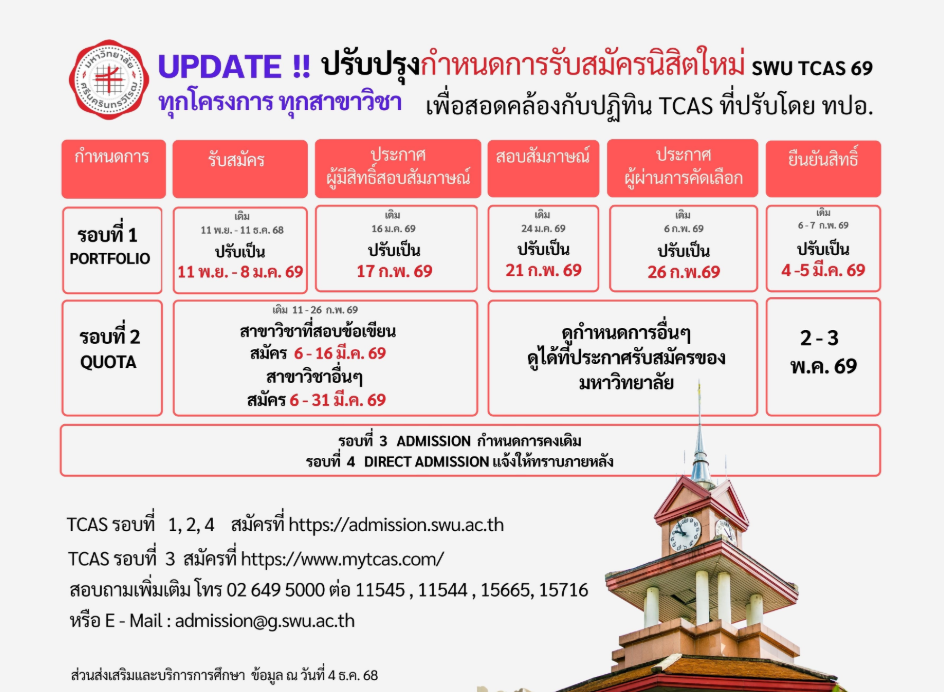 คณะศึกษาศาสตร์ ม.ศิลปากร ผนึกกำลังชุมชน จัดโครงการ “1 ภาควิชา 1 ชุมชน” เชิดชูอัตลักษณ์พระปฐมเจดีย์ สู่เมืองแห่งการเรียนรู้ที่ยั่งยืน EZ WebmasterDecember 22, 2025 คณะศึกษาศาสตร์ ม.ศิลปากร ผนึกกำลังชุมชน จัดโครงการ “1 ภาควิชา 1 ชุมชน” เชิดชูอัตลักษณ์พระปฐมเจดีย์ สู่เมืองแห่งการเรียนรู้ที่ยั่งยืน เมื่อวันเสาร์ที่ 20 ธันวาคม 2568 คณะศึกษาศาสตร์ มหาวิทยาลัยศิลปากร จัดโครงการ… สวนสุนันทาเปิดเวที HIDA รุ่นที่ 5 รวมแพทย์ผู้เชี่ยวชาญถ่ายทอดความรู้ “โรคใกล้ตัว” ชี้แนวทางดูแลตนเอง ลดเสี่ยงโรคเรื้อรังคนไทย tui sakrapeeDecember 19, 2025 📰 ราชภัฏสวนสุนันทาเปิดเวที HIDA รุ่นที่ 5 รวมแพทย์ผู้เชี่ยวชาญถ่ายทอดความรู้ “โรคใกล้ตัว” ชี้แนวทางดูแลตนเอง ลดเสี่ยงโรคเรื้อรังคนไทย เมื่อวันพฤหัสบดีที่ 18 ธันวาคม 2568 ณ โรงแรมชาเทรียม ริเวอร์ไซด์ กรุงเทพฯหลักสูตรผู้บริหารระดับสูงด้านการพัฒนาคุณภาพบริการสุขภาพและความงาม (HIDA)… มหาวิทยาลัยกรุงเทพ จัดงาน “BU Game On! Expo x Job Fair for Game Industry 2025” เวทีพิสูจน์ฝีมือนักพัฒนาเกมรุ่นใหม่ tui sakrapeeDecember 18, 2025 มหาวิทยาลัยกรุงเทพ จัดงาน “BU Game On! Expo x Job Fair for Game Industry 2025″ เวทีพิสูจน์ฝีมือนักพัฒนาเกมรุ่นใหม่ เชื่อมโลกการศึกษาสู่อุตสาหกรรมจริง มหาวิทยาลัยกรุงเทพ จัดงาน… มนุษยศาสตร์ฯ สวนสุนันทา ชวนร่วมงานประชุมวิชาการระดับนานาชาติ ICAC 2026 ด้านชุมชนอาเชียน tui sakrapeeDecember 18, 2025 ขอเชิญร่วมงานประชุมวิชาการระดับนานาชาติ ICAC 2026 ด้านชุมชนอาเชียน ณ มหาวิทยาลัยราชภัฏสวนสุนันทา คณะมนุษยศาสตร์และสังคมศาสตร์ มหาวิทยาลัยราชภัฏสวนสุนันทา ร่วมกับเครือข่ายพันธมิตรทางวิชาการระดับนานาชาติ เตรียมจัดงานประชุมวิชาการระดับนานาชาติ ICAC 2026 (International Conference on Asian Communities) ในวันจันทร์ที่… Search for: Search EZ Webmaster December 22, 2025 EZ Webmaster December 22, 2025 รวมให้เเล้ว! รอบ Quota เเต่ละมหาลัย ในปี 2569 รวมให้เเล้ว! รอบ Quota เเต่ละมหาลัย ในปี 2569 เข้าสู่ช่วงเวลาสำคัญของน้องๆ #dek69 กันแล้ว หลังจากผ่านพ้นรอบ Portfolio มาได้ไม่นาน ตอนนี้ก็ถึงเวลาของ TCAS69 รอบที่ 2 หรือ “รอบโควตา” (Quota) ซึ่งถือเป็นโอกาสทองของคนที่มีความสามารถพิเศษ หรืออาศัยอยู่ในพื้นที่เขตบริการของมหาวิทยาลัยต่างๆ ความท้าทายสำคัญของรอบนี้คือ “แต่ละมหาวิทยาลัยมีกำหนดการไม่พร้อมกัน” บางแห่งเปิดรับสมัครเร็ว บางแห่งเปิดรับสั้นๆ เพียงไม่กี่วัน หากน้องๆ วางแผนไม่ดีหรือลืมเช็กวันที่ให้แม่นยำ ก็อาจจะพลาดโอกาสเข้าคณะในฝันไปอย่างน่าเสียดาย เพื่อไม่ให้น้องๆ ต้องเสียเวลาไล่เช็กทีละเว็บไซต์ เราได้รวบรวม สรุปวันเปิดรับสมัครรอบ Quota จากมหาวิทยาลัยชั้นนำทั่วประเทศ มาไว้ให้ในที่เดียว! ไม่ว่าจะเป็นจุฬาฯ, ธรรมศาสตร์, เกษตรศาสตร์ หรือมหาวิท