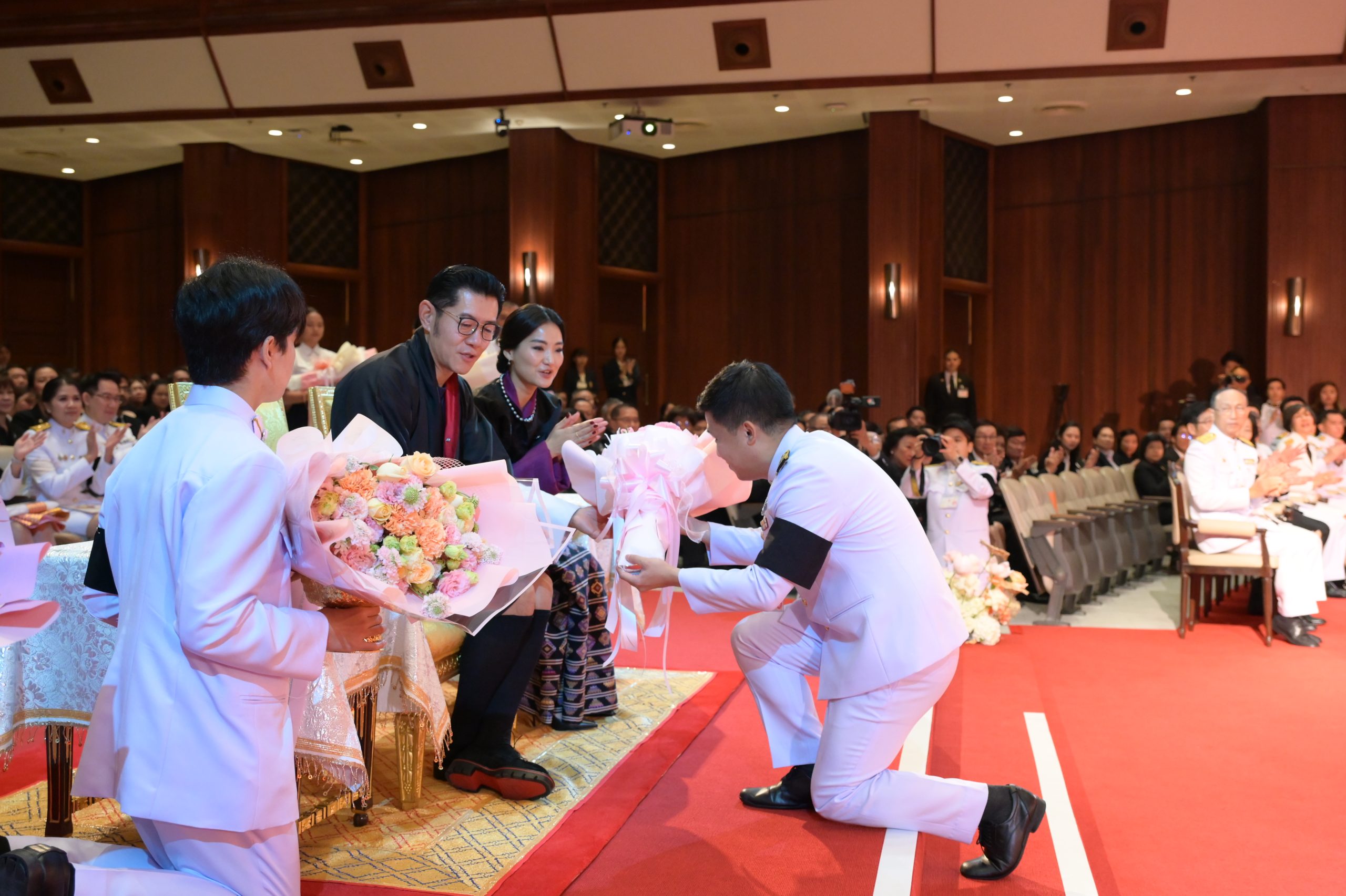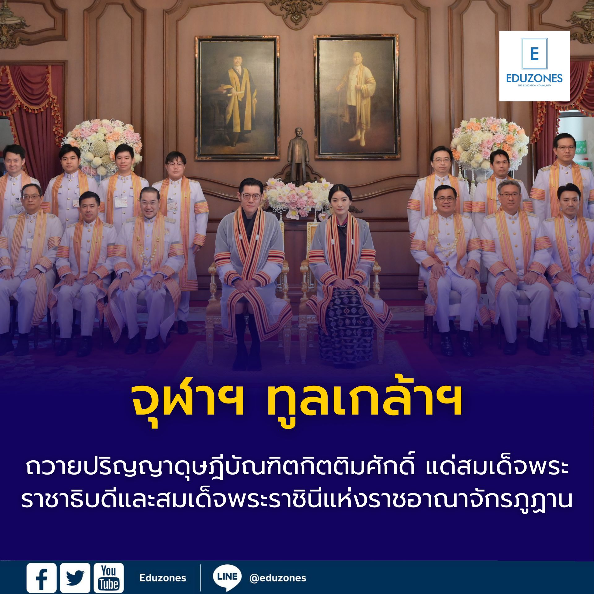 EZ Webmaster December 22, 2025 EZ Webmaster December 22, 2025 จุฬาฯ ทูลเกล้าฯ ถวายปริญญาดุษฎีบัณฑิตกิตติมศักดิ์ แด่สมเด็จพระราชาธิบดีและสมเด็จพระราชินีแห่งราชอาณาจักรภูฏาน จุฬาฯ ทูลเกล้าฯ ถวายปริญญาดุษฎีบัณฑิตกิตติมศักดิ์ แด่สมเด็จพระราชาธิบดีและสมเด็จพระราชินีแห่งราชอาณาจักรภูฏาน เมื่อวันที่ 22 ธันวาคม 2568 เวลา 10.00 น. ณ หอประชุมจุฬาลงกรณ์มหาวิทยาลัย สมเด็จพระราชาธิบดีจิกมี เคเซอร์ นัมเกล วังชุก และ สมเด็จพระราชินีเจตซุน เพมา วังชุก แห่งราชอาณาจักรภูฏาน เสด็จฯ มายังจุฬาลงกรณ์มหาวิทยาลัย เพื่อทรงรับการทูลเกล้าฯ ถวายปริญญาดุษฎีบัณฑิตกิตติมศักดิ์ โดยมี ศ. (พิเศษ) ดร.สุรเกียรติ์ เสถียรไทย นายกสภาจุฬาลงกรณ์มหาวิทยาลัย, ศ.ดร.วิเลิศ ภูริวัชร อธิการบดีจุฬาฯ พร้อมด้วยผู้บริหารมหาวิทยาลัย และนิสิตภูฏานที่ศึกษาอยู่ในจุฬาลงกรณ์มหาวิทยาลัย เฝ้าฯ รับเสด็จ สมเด็จพระราชาธิบดีจิกมี เคเซอร์ นัมเกล วังชุก และสมเด็จพระราชินีเจตซุน เพมา วังชุก เสด็จเข้าห้องรับรอง หอประชุมจุฬาฯ ทรงลงพระปรมาภิไธยและพระนามาภิไธยในสมุดเยี่ยม ศ. (พิเศษ) ดร.สุรเกียรติ์ เสถียรไทย นายกสภาจุฬาลงกรณ์มหาวิทยาลัย ทูลเกล้าฯ ถวายฉลองพระองค์ครุยดุษฎีบัณฑิตกิตติมศักดิ์แด่สมเด็จพระราชาธิบดีจิกมี เคเซอร์ นัมเกล วังชุก ศ.ดร.วิเลิศ ภูริวัชร อธิการบดีจุฬาฯ ทูลเกล้าฯ ถวายฉลองพระองค์ครุยดุษฎีบัณฑิตกิตติมศักดิ์แด่สมเด็จพระราชินีเจตซุน เพมา วังชุก สมเด็จพระราชาธิบดีจิกมี เคเซอร์ นัมเกล วังชุก และสมเด็จพระราชินีเจตซุน เพมา วังชุก เสด็จเข้าหอประชุมจุฬาฯ ศ. (พิเศษ) ดร.สุรเกียรติ์ เสถียรไทย นายกสภาจุฬาลงกรณ์มหาวิทยาลัย กราบบังคมทูลสำนึกในพระมหากรุณาธิคุณ และอ่านประกาศราชสดุดีเฉลิมพระเกียรติคุณเนื่องในโอกาสที่สภาจุฬาลงกรณ์มหาวิทยาลัยทูลเกล้าฯ ถวายปริญญาดุษฎีบัณฑิตกิตติมศักดิ์ ในโอกาสนี้ นายกสภาจุฬาลงกรณ์มหาวิทยาลัยทูลเกล้าฯ ถวายปริญญาศิลปศาสตรดุษฎีบัณฑิตกิตติมศักดิ์ สาขาวิชาการพัฒนาระหว่างประเทศ แด่สมเด็จพระราชาธิบดีจิกมี เคเซอร์ นัมเกล วังชุก ในฐานะที่ทรงบำบัดทุกข์บำรุงสุขแก่พสกนิกรด้วยพระราชหฤทัยตั้งมั่นบนการพัฒนาอันยั่งยืน ทรงให้ความสำคัญด้านการเตรียมพร้อมรับมือกับภัยพิบัติ ทรงดำเนินโครงการในพระราชดำริโดยให้ความสำคัญแก่เยาวชนและเด็ก ทรงเสริมสร้างความเป็นอยู่ที่ดีของประชาชน และทรงสนับสนุนการมีส่วนร่วมแสดงความคิดเห็นของประชาชนตามวิถีประชาธิปไตย และทูลเกล้าฯ ถวายปริญญาศิลปศาสตรดุษฎีบัณฑิตกิตติมศักดิ์ สาขาวิชาสังคมวิทยาและมานุษยวิทยา แด่สมเด็จพระราชินีเจตซ