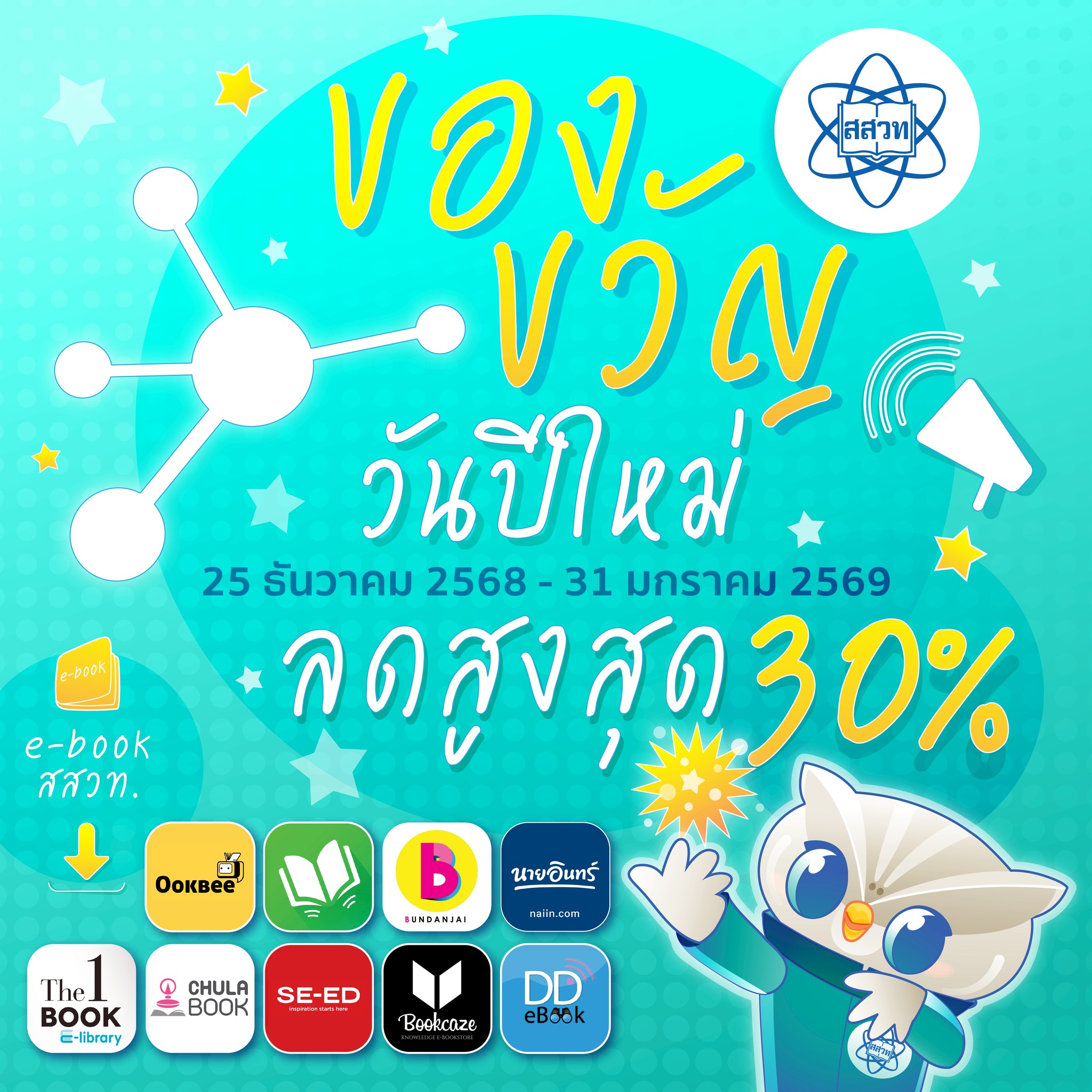 สถาบันส่งเสริมการสอนวิทยาศาสตร์และเทคโนโลยี (สสวท.) ร่วมกับร้านค้าชั้นนำจัดโปรโมชั่นพิเศษส่งท้ายปีเก่า ต้อนรับปีใหม่ พ.ศ. 2569 มอบส่วนลดหนังสือเรียน สสวท. ฉบับ e-book ทุกรายการ สูงสุด 30% ตั้งแต่วันที่ 25 ธันวาคม 2568 ถึง 31 มกราคม 2569 สั่งซื้อได้ผ่านแพลตฟอร์ม SE-ED https://bit.ly/4oet8lQ Bundanjai by SE-ED https://bit.ly/3EYrYW2  OOKBEE https://bit.ly/3vo1YQL CU e-Book http://bit.ly/3bLAH0M  Naiin https://bit.ly/49o9crT  meb https://bit.ly/3OCKZl6  The 1 Book https://bit.ly/3rYNmoI และ Bookcaze https://shorturl.at/yfjMW สอบถามข้อมูลเพิ่มเติมได้ที่เพจร้านหนังสือ สสวท. และ Line @ipstbookstore
