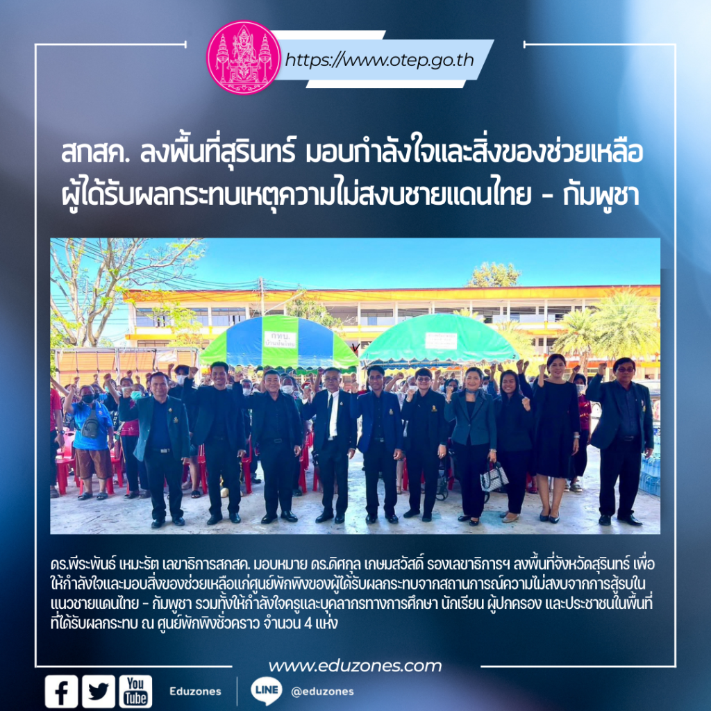 tui sakrapee December 25, 2025 tui sakrapee December 25, 2025 ภารกิจจากใจ เลขาฯสกสค.ช่วยเหลือผู้ได้รับผลกระทบชายแดนไทย–กัมพูชา เสริมพลังใจครูและประชาชนในพื้นที่ เมื่อวันที่ 24 ธันวาคม 2568 ดร.พีระพันธ์ เหมะรัต เลขาธิการคณะกรรมการสำนักงานคณะกรรมการส่งเสริมสวัสดิการและสวัสดิภาพครูและบุคลากรทางการศึกษา (สกสค.) มอบหมายให้ ดร.ดิศกุล เกษมสวัสดิ์ รองเลขาธิการคณะกรรมการ สกสค. พร้อมด้วย นางสาวบุญสม เธียรฤกษ์ ผู้อำนวยการกลุ่มกิจการที่พัก รักษาการแทนผู้อำนวยการสำนักสวัสดิการ และพนักงานเจ้าหน้าที่สำนักงาน สกสค. จังหวัดสุรินทร์ ลงพื้นที่จังหวัดสุรินทร์ การลงพื้นที่ครั้งนี้ เพื่อให้กำลังใจและมอบสิ่งของช่วยเหลือแก่ศูนย์พักพิงของผู้ได้รับผลกระทบจากสถานการณ์ความไม่สงบจากการสู้รบในแนวชายแดนไทย – กัมพูชา รวมทั้งให้กำลังใจครูและบุคลากรทางการศึกษา นักเรียน ผู้ปกครอง และประชาชนในพื้นที่ที่ได้รับผลกระทบ ณ ศูนย์พักพิงชั่วคราว จำนวน 4 แห่ง สกสค. ยังคงมุ่งมั่นในการดูแลช่วยเหลือครู บุคลากรทางการศึกษา และประชาชนผู้ได้รับผลกระทบ เพื่อบรรเทาความเดือดร้อนและสร้างขวัญกำลังใจในช่วงสถานการณ์ที่ยากลำบากอย่างต่อเนื่อง #สกสค #สวัสดิการ #สกสคสุรินทร์