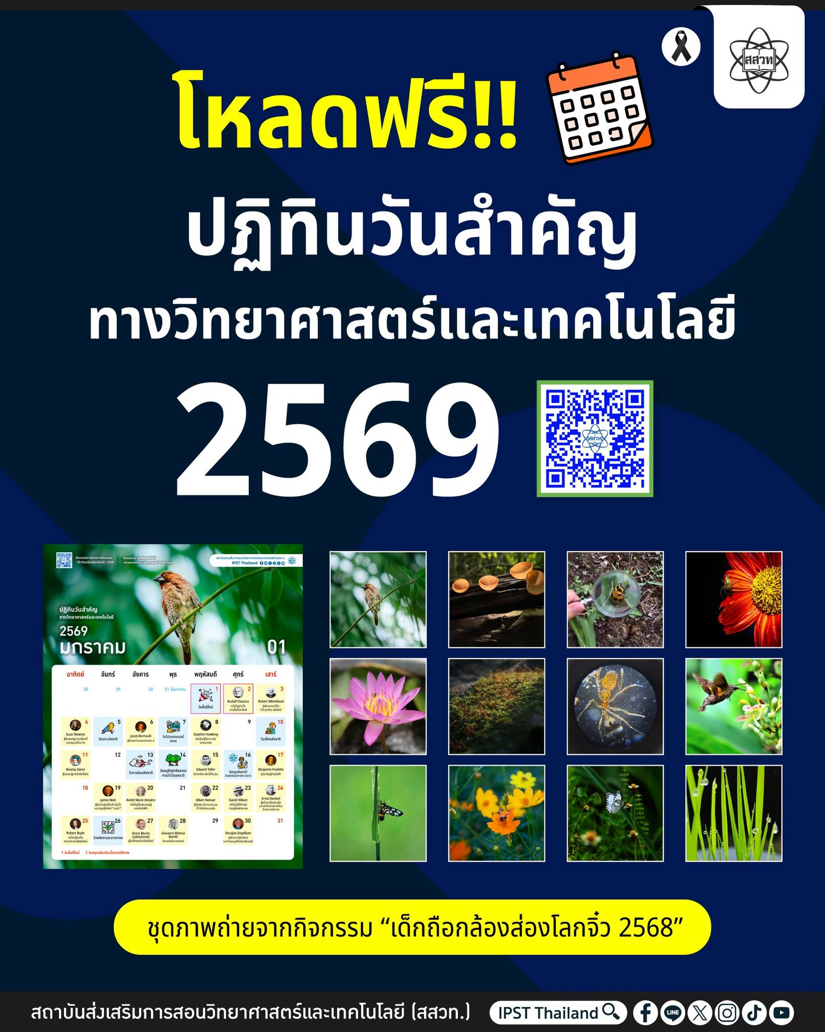 EZ Webmaster December 26, 2025 EZ Webmaster December 26, 2025 สสวท. แจกฟรี ปฏิทินวันสำคัญทางวิทยาศาสตร์และเทคโนโลยี ปี 2569 ของขวัญปีใหม่มอบแด่ครู นักเรียน และประชาชนทั่วประเทศ สสวท. แจกฟรี ปฏิทินวันสำคัญทางวิทยาศาสตร์และเทคโนโลยี ปี 2569 ของขวัญปีใหม่มอบแด่ครู นักเรียน และประชาชนทั่วประเทศ ต้อนรับปีใหม่ 2569 สถาบันส่งเสริมการสอนวิทยาศาสตร์และเทคโนโลยี (สสวท.) โดยเพจเฟซบุ๊ก IPST Thailand มอบของขวัญปีใหม่พิเศษแด่ครู นักเรียน และประชาชนทั่วไป ด้วยการเปิดให้ดาวน์โหลดฟรี “ปฏิทินวันสำคัญทางวิทยาศาสตร์และเทคโนโลยี ประจำปี 2569” ปฏิทินปีนี้มาในธีมภาพถ่ายจากกิจกรรม “เด็กถือกล้องส่องโลกจิ๋ว” ถ่ายทอดการเรียนรู้วิทยาศาสตร์ผ่านมุมมองของเด็ก ๆ พร้อมรวบรวมวันสำคัญและเรื่องราวน่ารู้ทางวิทยาศาสตร์และเทคโนโลยี ที่ช่วยส่งเสริมการเรียนรู้ สร้างแรงบันดาลใจ ต่อยอดการนำไปใช้ในห้องเรียนและชีวิตประจำวันตลอดทั้งปี รวมถึงใช้เป็นสื่อสนับสนุนการจัดการเรียนรู้และกิจกรรมทางการศึกษา ดาวน์โหลดและส่งต่อได้ฟรี จากเว็บไซต์ สสวท. คลิกที่ https://www.ipst.ac.th/ipst-calendar-2026