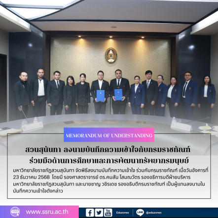 tui sakrapee December 23, 2025 มหาวิทยาลัยราชภัฏสวนสุนันทา ลงนามบันทึกความเข้าใจกับกรมราชทัณฑ์ เสริมสร้างความร่วมมือด้านการศึกษาและการพัฒนาทรัพยากรมนุษย์ tui sakrapee December 23, 2025 มหาวิทยาลัยราชภัฏสวนสุนันทา จัดพิธีลงนามบันทึกความเข้าใจ (Memorandum of Understanding: MOU) ร่วมกับกรมราชทัณฑ์ เมื่อวันอังคารที่ 23 ธันวาคม 2568 เวลา 13.00–15.00 น. ณ ห้องประชุมสภามหาวิทยาลัย อาคาร 31 ชั้น 5 โดยมี รองศาสตราจารย์ ดร.คมสัน โสมณวัตร รองอธิการบดีฝ่ายบริหาร มหาวิทยาลัยราชภัฏสวนสุนันทา และนายชาญ วชิรเดช รองอธิบดีกรมราชทัณฑ์ เป็นผู้แทนลงนามในบันทึกความเข้าใจดังกล่าว ท่ามกลางผู้บริหาร บุคลากร… Continue Reading