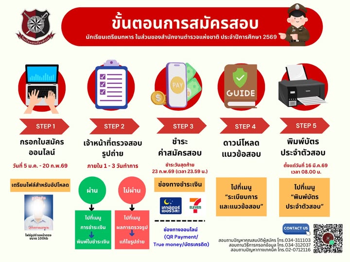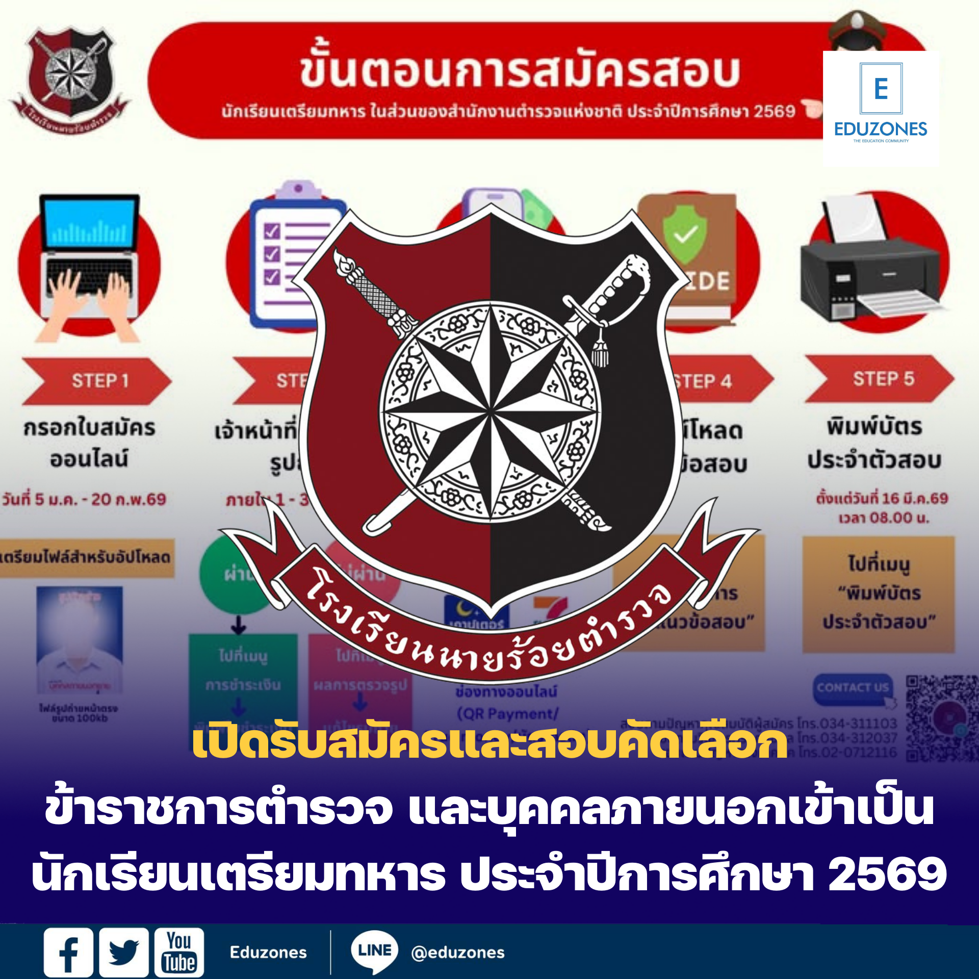 EZ Webmaster January 5, 2026 EZ Webmaster January 5, 2026 เปิดรับสมัครและสอบคัดเลือกข้าราชการตำรวจ และบุคคลภายนอกเข้าเป็นนักเรียนเตรียมทหาร ในส่วนของสำนักงานตำรวจแห่งชาติ ประจำปีการศึกษา 2569 เปิดรับสมัครและสอบคัดเลือกข้าราชการตำรวจ และบุคคลภายนอกเข้าเป็นนักเรียนเตรียมทหาร ในส่วนของสำนักงานตำรวจแห่งชาติ ประจำปีการศึกษา 2569 สำนักงานตำรวจแห่งชาติ ขอประชาสัมพันธ์การเปิดรับสมัครและสอบคัดเลือกข้าราชการตำรวจ และบุคคลภายนอกเพื่อเข้าศึกษาเป็นนักเรียนเตรียมทหาร ในส่วนของสำนักงานตำรวจแห่งชาติประจำปีการศึกษา 2569 โดยมีวัตถุประสงค์เพื่อคัดเลือกผู้ที่มีความรู้ ความสามารถ มีคุณธรรม จริยธรรม และมีความพร้อมทั้งด้านร่างกายและจิตใจ เข้ารับการฝึกศึกษาเพื่อเป็นกำลังสำคัญของประเทศในอนาคต สามารถสมัครได้ที่ : คลิ๊กที่นี่เพื่อสมัคร สอบถามการกรอกข้อมูล : โทร 034-312037 สอบถามคุณสมบัติผู้สมัคร : โทร 034-311103