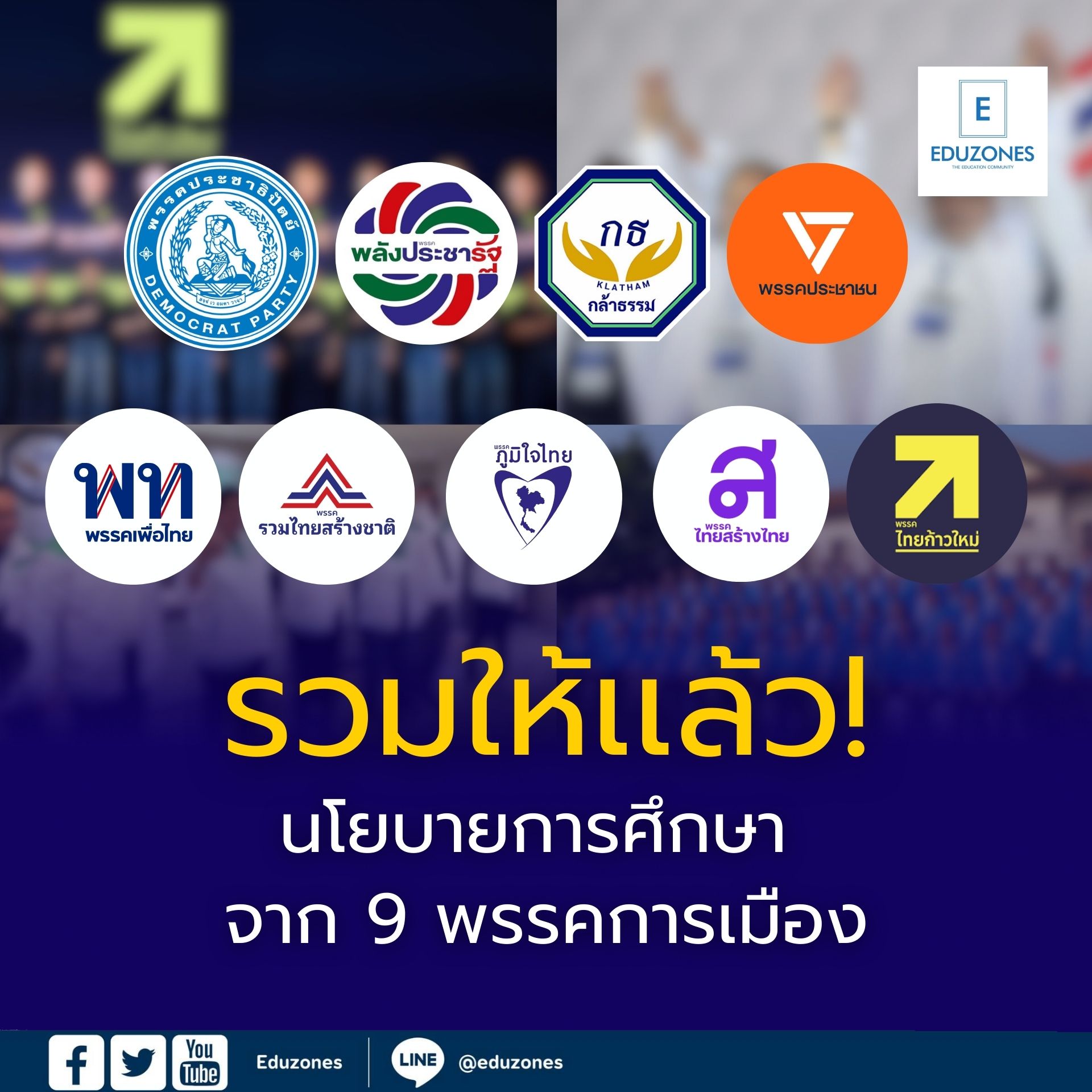 EZ Webmaster January 7, 2026 EZ Webmaster January 7, 2026 รวมให้เเล้ว! นโยบายการศึกษา จาก 9 พรรคการเมือง รวมให้เเล้ว! นโยบายการศึกษา จาก 9 พรรคการเมือง การศึกษาไทยปี 2569 กำลังถูกเขย่าด้วยนวัตกรรมและวิสัยทัศน์ใหม่จาก 9 พรรคการเมืองในสนามการเมืองไทย เมื่อโจทย์ใหญ่ไม่ใช่แค่การให้เด็ก ‘อ่านออกเขียนได้’ แต่คือการทำให้เด็ก ‘อยู่รอดและเติบโต’ ในโลกที่เปลี่ยนไปทุกวินาที บทความนี้สรุปประเด็นสำคัญของนโยบายการศึกษาจากพรรคเพื่อไทย, ประชาชน, ภูมิใจไทย, รวมไทยสร้างชาติ, พลังประชารัฐ, ประชาธิปัตย์, กล้าธรรม และไทยก้าวใหม่ เพื่อให้คุณเห็นภาพรวมว่าทิศทางโรงเรียนและมหาวิทยาลัยไทยในอนาคตกำลังจะมุ่งหน้าไปทางไหน” เจาะลึกนโยบายการศึกษาจาก 8 พรรคการเมืองหลักที่กำลังขับเคี่ยวกันในขณะนี้ เมื่อโจทย์ใหญ่ไม่ใช่แค่การเรียนฟรี แต่คือการปรับตัวให้รอดในโลกยุค AI และการแก้ปัญหาความเหลื่อมล้ำที่ฝังรากลึก มาสำรวจกันว่า “พิมพ์เขียวการศึกษา” ของพรรคไหนจะตอบโจทย์อนาคตเด็กไทยและแก้ปัญหาระบบโรงเรียนได้จริง 1. พรรคเพื่อไทย สรุปนโยบายการศึกษาของพรรคเพื่อไทย มีดังนี้: Learn to Earn (เรียนเพื่อรายได้) : เป็นหัวใจหลักที่มุ่งเน้นให้การศึกษาเชื่อมโยงกับตลาดงาน โดยเน้นว่า “เรียนจบต้องมีงานทำ และมีรายได้ทันที” ลดวิชาทฤษฎีที่ไม่จำเป็น และเพิ่มการฝึกทักษะอาชีพ (Reskill/Upskill) อาชีวะสร้างชาติ สู่อาชีวะสากล : เยาวชนที่เรียนมาสายอาชีวะสามารถทำงานมีรายได้ดี เพราะหลักสูตรอาชีวะจะตรงกับความต้องการตลาดแรงงานจริง ซึ่งภาคอุตสาหกรรมจะร่วมออกแบบหลักสูตรทุกขั้นตอน AI for ALL เรียนทันโลก : คนไทยทุกคนสามารถเรียนรู้ได้ตลอดชีวิตผ่าน AI Learning Platform โรงเรียนกว่า 1,000 แห่งใช้ AI เพื่อยกระดับคุณภาพการเรียนรู้ Free tablet for all : โครงการ 1 นักเรียน 1 แท็บเล็ต และ โครงการ 1 ครู 1 แท็บเล็ต เพื่อเปิดโอกาสทางการศึกษาผ่านออนไลน์ ที่มา : https://www.ptp.or.th/นโยบายหลักพรรคเพื่อไทย/educational-policy https://election.ptp.or.th/policy/105 https://election.ptp.or.th/policy/89 2. พรรคประชาชน สรุปนโยบายการศึกษาของพรรคประชาชน มีดังนี้: การศึกษาที่เลือกได้ : กระจายอำนาจให้โรงเรียนและท้องถิ่นออกแบบหลักสูตรเอง ลดเวลาเรียนในห้องเรียนที่มากเกินความจำเป็น ลดภาระครู : ลดงานเอกสารและยกเลิกเวรครู พลตฟอร์มกลางเพื่อการเรียนรู้ และคูปองการศึกษา : สร้างแพลตฟอร์มเพื่อสนับสนุนการเรียนรู้ตลอดชีวิตแก่คนไทยทุกคน มีคูปองเพื่อให้ผู้เรียนเข้าถึงการยกระดับทักษะเฉพาะทาง ที่มา : https://peoplesparty.or.th/articles/23481/ https://theactive.thaipbs.or.th/news/learning-education-20260109 https://www.springnews.co.th/news/infographic/861467 3. พรรคภูมิใจไทย สรุปนโยบายการศึกษาของพรรคภูมิใจไทยมีดังนี้ : 1 แพลตฟอร์ม 1,000,000 ความรู้ : ความรู้ ที่จะร
