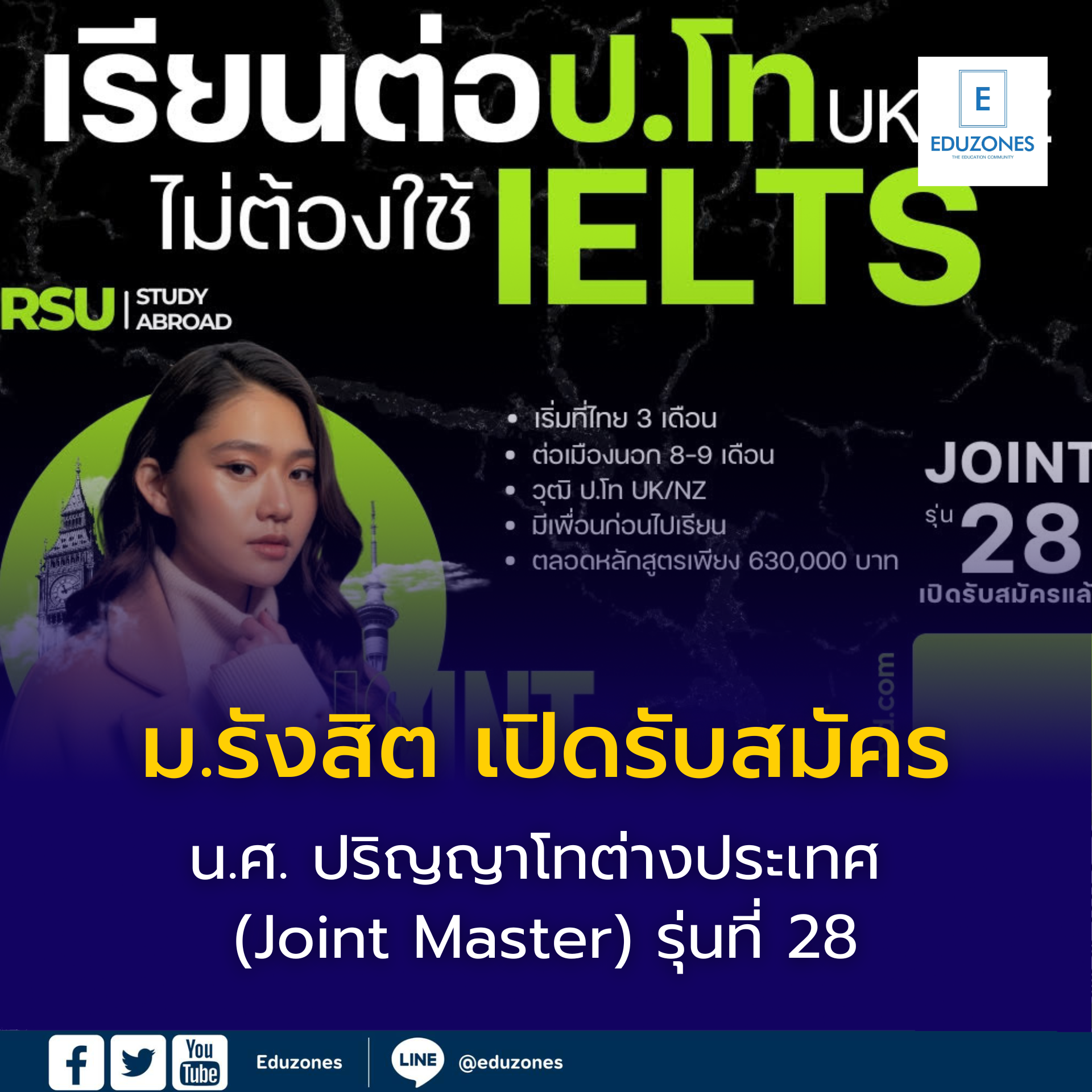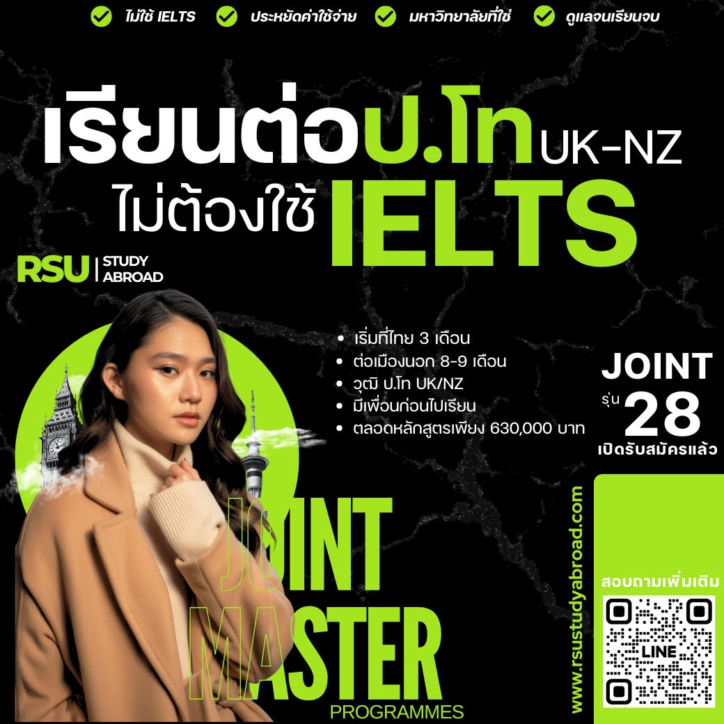 EZ Webmaster January 8, 2026 EZ Webmaster January 8, 2026 RSU Study Abroad ม.รังสิต เปิดรับสมัคร น.ศ. ปริญญาโทต่างประเทศ (Joint Master) รุ่นที่ 28 RSU Study Abroad ม.รังสิต เปิดรับสมัคร น.ศ. ปริญญาโทต่างประเทศ (Joint Master) รุ่นที่ 28 RSU Study Abroad มหาวิทยาลัยรังสิต เปิดรับสมัครนักศึกษาใหม่หลักสูตรปริญญาโท (Joint Master Programme) รุ่นที่ 28 เพื่อเข้าศึกษาต่อในมหาวิทยาลัยชั้นนำ ณ สหราชอาณาจักร (UK) และนิวซีแลนด์ (NZ) โดยมีกำหนดเปิดภาคเรียนในวันที่ 30 มกราคม 2569 หลักสูตรนี้มุ่งเน้นการสร้างโอกาสทางการศึกษาในระดับสากลด้วยงบประมาณที่เข้าถึงได้เริ่มต้นไม่ถึงหนึ่งล้านบาท และไม่ต้องใช้ผลคะแนน IELTS ในการสมัคร โครงสร้างหลักสูตรถูกออกแบบมาให้ผู้เรียนสามารถสำเร็จการศึกษาได้ภายในระยะเวลา 1 ปี โดยแบ่งเป็นการศึกษาในประเทศไทยเป็นเวลา 3 เดือน ซึ่งสามารถเลือกเรียนได้ทั้งรูปแบบ Onsite หรือ Online จากนั้นจึงเดินทางไปศึกษาต่อ ณ ต่างประเทศเป็นเวลา 8-9 เดือน เมื่อสำเร็จการศึกษาจะได้รับวุฒิปริญญาโท จากมหาวิทยาลัยในสหราชอาณาจักรหรือนิวซีแลนด์โดยตรง ซึ่งจะช่วยเพิ่มโอกาสในการอัปเกรดตำแหน่งงานและฐานเงินเดือนในอนาคต หลักสูตรดังกล่าวเปิดกว้างสำหรับผู้สมัครในทุกสาขาวิชาและไม่จำกัดเกรดเฉลี่ย (GPA) ในระดับปริญญาตรี อีกทั้งไม่จำเป็นต้องมีประสบการณ์การทำงาน โดยนักศึกษาที่กำลังศึกษาอยู่ในชั้นปีที่ 4 สามารถสมัครเข้าร่วมโครงการได้ทันที ปัจจุบันหลักสูตรนี้ มีเครือข่ายศิษย์เก่า (Alumni) มากกว่า 2,000 คน ซึ่งจะช่วยสร้างความมั่นใจในการเรียนและการใช้ชีวิตในต่างประเทศร่วมกับกลุ่มเพื่อน และมีสาขาวิชาที่เปิดสอนครอบคลุมมากกว่า 50 สาขา อาทิ Business Analytics, Global MBA, Digital Media, Marketing, Finance, Management และสาขาอื่นๆ จากมหาวิทยาลัยชื่อดัง นอกจากนี้ นักศึกษาในโครงการยังมีโอกาสทำงาน Part-time ระหว่างศึกษา และมีสิทธิ์ยื่นขอ Graduate Route Visa เพื่อทำงานต่อหลังเรียนจบในประเทศอังกฤษ (ยกเว้นมหาวิทยาลัย UWE) ทั้งนี้ สำหรับผู้ที่สนใจสมัครภายในวันที่ 15 มกราคม 2569 จะได้รับทุนส่วนลดพิเศษมูลค่า 15,000 บาท ผู้ที่สนใจสามารถสอบถามข้อมูลเพิ่มเติมได้ที่ โทรศัพท์ 088-022-2701 หรือ 098-285-6114 และผ่านช่องทาง LINE: @rsustudyabroad หรือเยี่ยมชมเว็บไซต์ผ่านลิงก์ https://page.line.me/rsustudyabroad?openQrModal=true