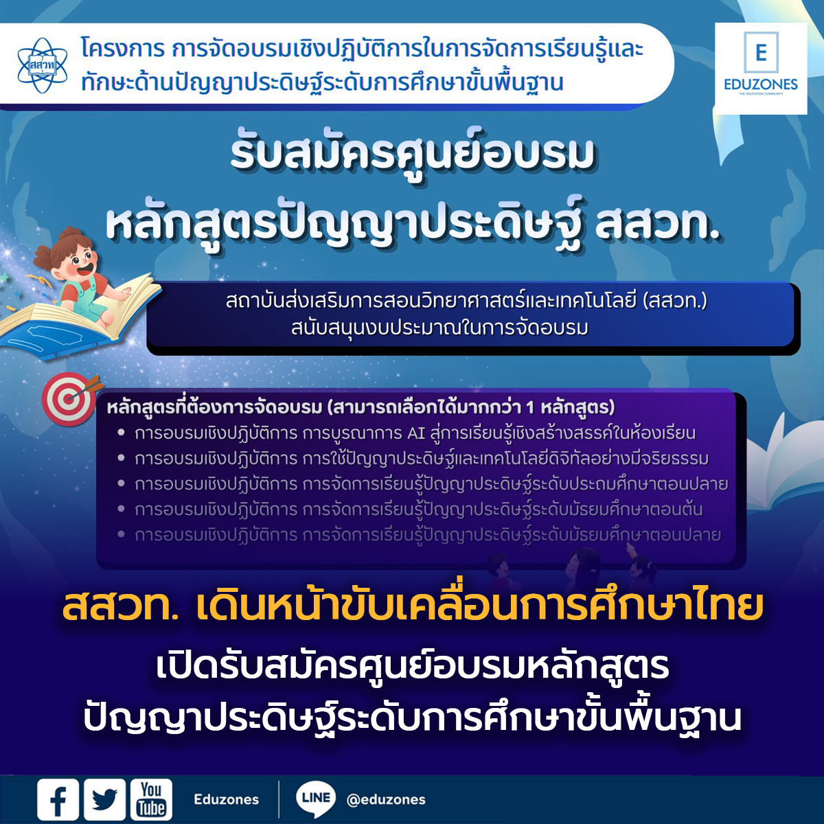 EZ Webmaster January 9, 2026 EZ Webmaster January 9, 2026 สสวท. เดินหน้าขับเคลื่อนการศึกษาไทย เปิดรับสมัครศูนย์อบรมหลักสูตร ปัญญาประดิษฐ์ระดับการศึกษาขั้นพื้นฐาน สถาบันส่งเสริมการสอนวิทยาศาสตร์และเทคโนโลยี (สสวท.) ขอเชิญสำนักงานเขตพื้นที่การศึกษา และสำนักงานศึกษาธิการจังหวัดทั่วประเทศ สมัครเป็นศูนย์อบรมหลักสูตรปัญญาประดิษฐ์ สสวท. โดย สสวท. สนับสนุนงบประมาณในการจัดอบรม เพื่อส่งเสริมการให้ความรู้ด้านปัญญาประดิษฐ์ และสร้างเครือข่ายในการส่งเสริมการจัดการเรียนรู้ด้านปัญญาประดิษฐ์ รวมถึงยกระดับศักยภาพครูและการเรียนรู้ของผู้เรียนให้มีความรู้ความสามารถเท่าทันต่อการเปลี่ยนแปลงของสังคมโลกและทัดเทียมกับนานาชาติ เปิดรับสมัครตั้งแต่วันนี้ ถึง 31 มกราคม 2569 ผ่านแบบฟอร์มออนไลน์ที่ https://ipst.me/cs013t ประกาศผลการคัดเลือก วันที่ 10 กุมภาพันธ์ 2569 และจะจัดอบรมในช่วงเดือนมีนาคม–พฤษภาคม 2569 ดูรายละเอียดเพิ่มเติมได้ที่เพจ สาขาคอมพิวเตอร์ สสวท. https://www.facebook.com/oho.ipst