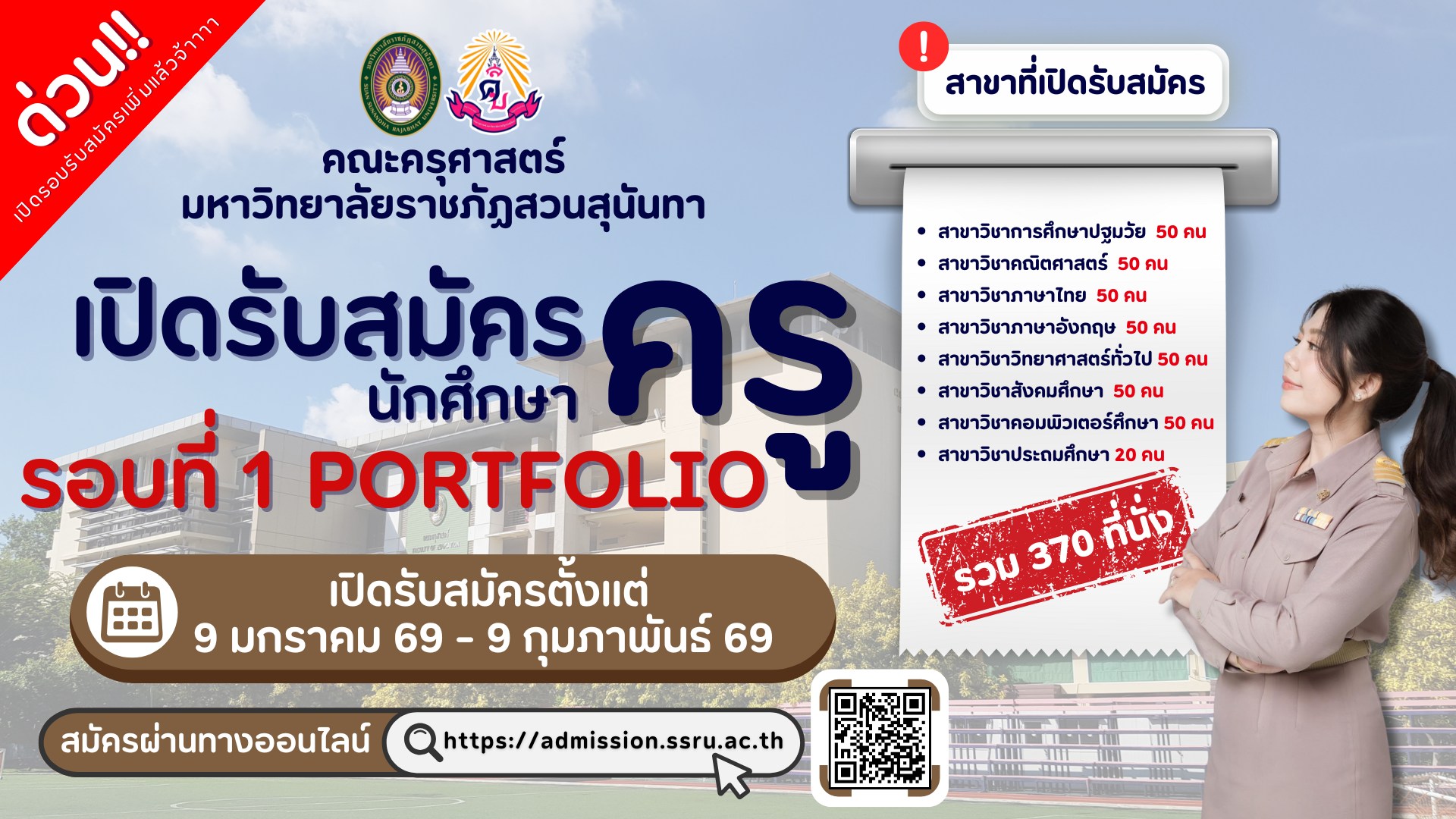 EZ Webmaster January 9, 2026 EZ Webmaster January 9, 2026 รับสมัครนักศึกษาครูแล้ว! TCAS69 รอบที่ 1 Portfolio คณะครุศาสตร์ มหาวิทยาลัยราชภัฏสวนสุนันทา 🎓 รับสมัครนักศึกษาครูแล้ว! TCAS69 รอบที่ 1 Portfolio คณะครุศาสตร์ มหาวิทยาลัยราชภัฏสวนสุนันทา สำหรับน้อง ๆ ที่ใฝ่ฝันอยากเป็นครูนี่คือโอกาสสำคัญในการก้าวสู่สายวิชาชีพครูอย่างมั่นคง ✨ 📚 สาขาที่เปิดรับสมัคร ครูภาษาไทย ครูคณิตศาสตร์ ครูวิทยาศาสตร์ทั่วไป ครูสังคมศึกษา ครูภาษาอังกฤษ ครูปฐมวัย / การศึกษาปฐมวัย ครูคอมพิวเตอร์ ครูประถมศึกษา ✅ คุณสมบัติผู้สมัคร จบ ปวช. / ปวส. สมัครได้ จบ ม.6 / กศน. เกรดเฉลี่ย GPA 2.50 ขึ้นไป สมัครได้ 🗓️ กำหนดการรับสมัคร เปิดรับสมัคร: 9 มกราคม – 9 กุมภาพันธ์ 2569 ส่ง Portfolio: 9 มกราคม – 9 กุมภาพันธ์ 2569 👉 สมัครได้ที่🔗 https://admission.ssru.ac.th/login 📞 สอบถามข้อมูลเพิ่มเติม ☎️ 02-160-1061–2 ⏰ โอกาสดีแบบนี้ รีบสมัครก่อนปิดรับ!ครูในฝัน เริ่มต้นได้ที่สวนสุนันทา 🌱