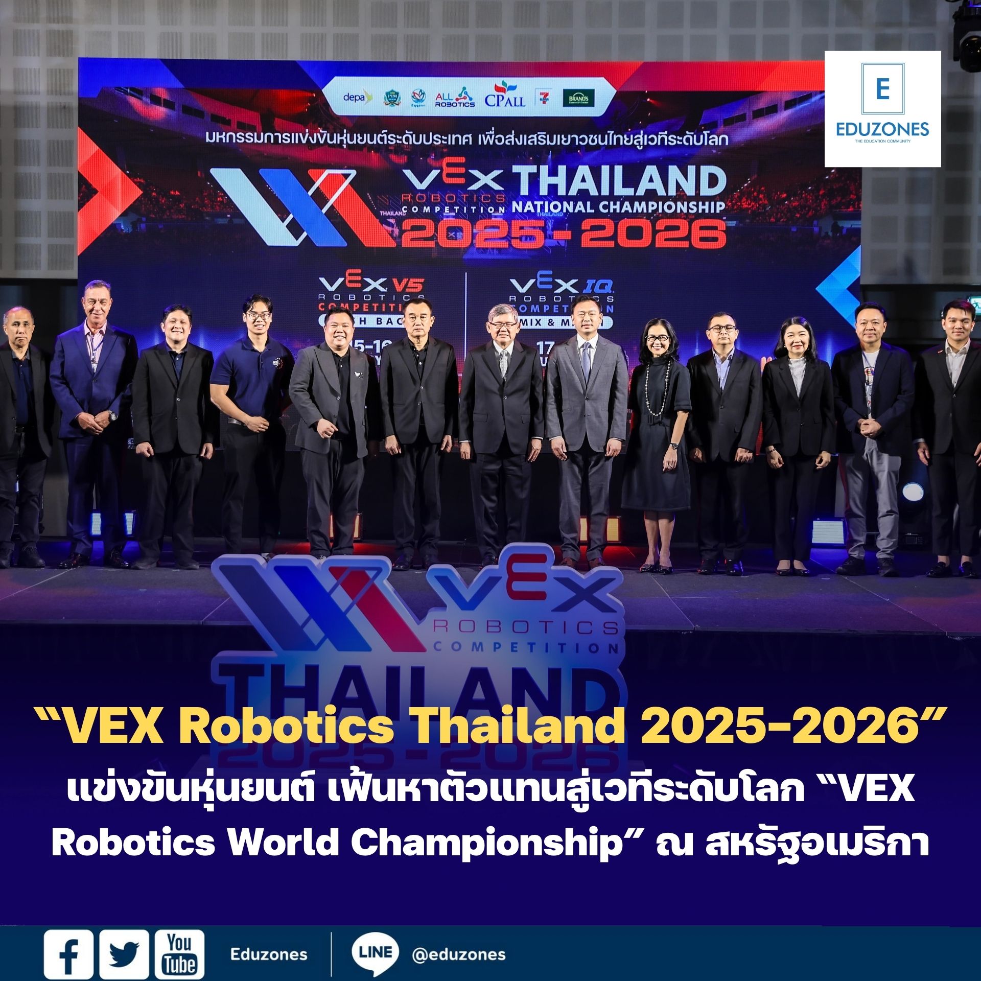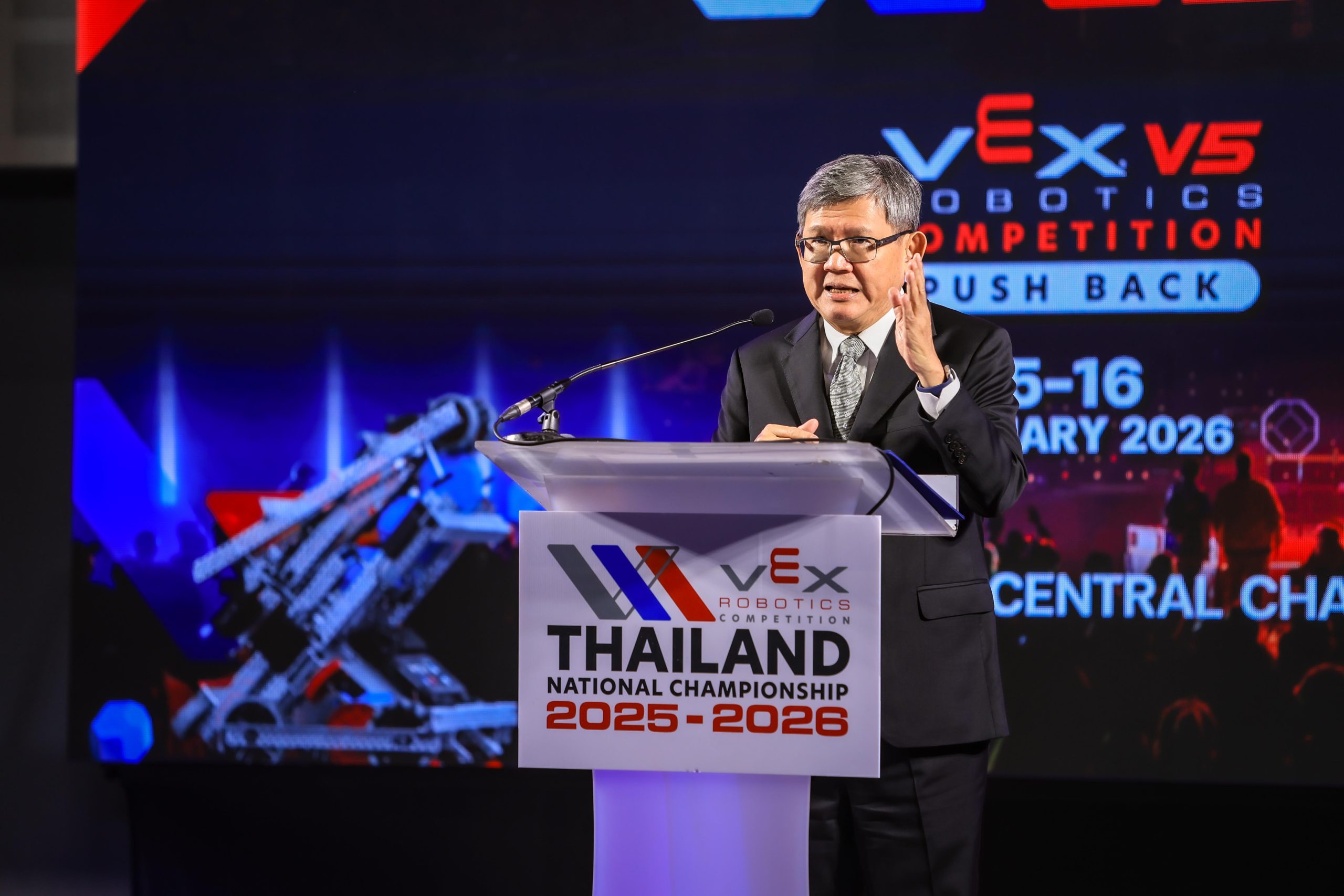 EZ Webmaster January 15, 2026 EZ Webmaster January 15, 2026 เปิดฉาก! แข่งขันหุ่นยนต์ ยิ่งใหญ่ระดับชาติ “VEX Robotics Thailand 2025–2026” รวมสุดยอดเยาวชนจากทุกภาค 126 ทีม ร่วมชิงแชมป์ประเทศไทย เฟ้นหาตัวแทนสู่เวทีระดับโลก “VEX Robotics World Championship” ณ สหรัฐอเมริกา เปิดฉาก! แข่งขันหุ่นยนต์ ยิ่งใหญ่ระดับชาติ “VEX Robotics Thailand 2025–2026” รวมสุดยอดเยาวชนจากทุกภาค 126 ทีม ร่วมชิงแชมป์ประเทศไทย เฟ้นหาตัวแทนสู่เวทีระดับโลก “VEX Robotics World Championship” ณ สหรัฐอเมริกา มหกรรมแข่งขันหุ่นยนต์ “VEX Robotics Competition Thailand National Championships 2025-2026” ( เว็กซ์ โรโบติกส์ คอมเพทิชั่น ไทยแลนด์ เนชันแนล แชมเปี้ยนชิพ 2025-2026) รอบชิงแชมป์ประเทศไทย ระหว่างวันที่ 15-18 ม.ค. 2569 เพื่อเฟ้นหาสุดยอดทีมเยาวชนไทย เข้าร่วมการแข่งขันหุ่นยนต์ รายการใหญ่สุดในโลก “VEX Robotics World Championship 2026” ซึ่งการแข่งขันรายการนี้ได้รับการการันตีจาก “กินเนสส์ เวิลด์ เรคคอร์ด” ให้เป็นทัวร์นาเมนต์แข่งขันหุ่นยนต์ที่ยิ่งใหญ่ที่สุดในโลก! เมื่อวันที่ 15 มกราคม 2569 ที่เซ็นทรัล แจ้งวัฒนะ ฮอลล์ ศูนย์การค้าเซ็นทรัล แจ้งวัฒนะ ได้มีพิธีเปิดการแข่งขัน “VEX Robotics Competition Thailand National Championships 2025-2026” มหกรรมการแข่งขันหุ่นยนต์ระดับประเทศ เพื่อส่งเสริมเยาวชนไทย สู่เวทีระดับโลก โดยมี ดร.สุวิทย์ เมษินทรีย์ อดีตรัฐมนตรีว่าการกระทรวงการอุดมศึกษา วิทยาศาสตร์ วิจัยและนวัตกรรม เป็นประธานในพิธี พร้อมด้วย ดร.ธีรศักดิ์ โชติกวณิชย์ ผู้ช่วยผู้จัดการทั่วไป ฝ่ายวิชาการ สถาบันการศึกษาวิทยาการหุ่นยนต์ ALL Robotics, อาจารย์พรวิทย์ พัชรินทร์ตนะกุล รองอธิการบดีอาวุโส สายวิชาการ สถาบันการจัดการปัญญาภิวัฒน์ (PIM), Quang Hung Vu, Regional Support Manager Robotics Education & Competition Foundation Vex Robotics และ นางสาวจตุรพร ธนาพรสังสุทธิ์ รองประธานบริหารฝ่ายการตลาดประเทศไทยและอินโดไชน่า บริษัท ซันโทรี่ เบเวอเรจ แอนด์ ฟู้ด (ประเทศไทย) จำกัด เข้าร่วมในครั้งนี้ ดร. สุวิทย์ เมษินทรีย์ อดีตรัฐมนตรีว่าการกระทรวงการอุดมศึกษา วิทยาศาสตร์ วิจัยและนวัตกรรม กล่าวว่า การแข่งขัน VEX Robotics Competition Thailand National Championship 2025–2026 ( เว็กซ์ โรโบติกส์ คอมเพทิชั่น ไทยแลนด์ เนชันแนล แชมเปี้ยนชิพ 2025-2026) เป็นเวทีสำคัญในการส่งเสริมศักยภาพเยาวชนไทยด้านหุ่นยนต์และเทคโนโลยี ไม่เพียงมุ่งเฟ้นหาทีมตัวแทนสู่เวทีระดับโลก แต่ยังช่วยหล่อหลอมทักษะการคิดเชิงวิศวกรรม การแก้ปัญหาอย่างเป็นระบบ และการทำงานเป็นทีม พร้อมย้ำว่า แม้เทคโนโลยีจะก้าวหน้าเพียงใด ทิศทางของโลกยังขึ้นอยู่กับเยาวชนที่มีทั้งความรู้ คุณธรรม และความรับผิดชอบต่อสังคม ซึ่งเวทีนี้ถือเป็นจุดเริ่มต้นสำคัญของการพัฒนาทรัพยากรมนุษย์ในอนาคต ด้าน ดร.ธีรศักดิ์ โชติกวณิชย์ ผู้ช่วยผู้จัดการทั่วไป ฝ่ายวิชาการ สถาบันการศ