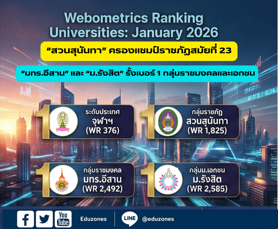 tui sakrapee January 26, 2026 tui sakrapee January 26, 2026 จุฬาฯ ยืนหนึ่งผลการจัดอันดับ Webometrics มกราคม 2569 “สวนสุนันทา” ครองแชมป์ราชภัฏสมัยที่ 23 ด้าน “มทร.อีสาน” และ “ม.รังสิต” รั้งเบอร์ 1 กลุ่มราชมงคลและเอกชนอย่างเหนียวแน่น จุฬาฯ ยืนหนึ่งผลการจัดอันดับ Webometrics มกราคม 2569 — “สวนสุนันทา” ครองแชมป์ราชภัฏสมัยที่ 23 ด้าน “มทร.อีสาน” และ “ม.รังสิต” รั้งเบอร์ 1 กลุ่มราชมงคลและเอกชนอย่างเหนียวแน่น ประกาศผลอย่างเป็นทางการแล้วสำหรับการจัดอันดับมหาวิทยาลัยโลก Webometrics Ranking of World Universities ประจำเดือนมกราคม 2569 ซึ่งจัดทำโดย Cybermetrics Lab ประเทศสเปน ผลปรากฏว่า จุฬาลงกรณ์มหาวิทยาลัย ยังคงรักษาตำแหน่งมหาวิทยาลัยอันดับ 1 ของประเทศไทยไว้ได้อย่างสง่างาม โดยขยับขึ้นมาอยู่อันดับที่ 376 ของโลก สะท้อนถึงความเป็นเลิศในการเผยแพร่ข้อมูลวิชาการและการเป็นมหาวิทยาลัยดิจิทัลระดับสากล ในกลุ่มมหาวิทยาลัยราชภัฏ มหาวิทยาลัยราชภัฏสวนสุนันทา สร้างประวัติศาสตร์หน้าใหม่ด้วยการครองอันดับ 1 ในกลุ่มต่อเนื่องเป็นสมัยที่ 23 โดยอยู่ในอันดับที่ 16 ของประเทศและ 1,825 ของโลก ตามมาด้วยมหาวิทยาลัยราชภัฏนครปฐม และมหาวิทยาลัยราชภัฏอุดรธานี ทางด้านกลุ่มมหาวิทยาลัยเทคโนโลยีราชมงคล มหาวิทยาลัยเทคโนโลยีราชมงคลอีสาน (มทร.อีสาน) ยังคงครองแชมป์อันดับ 1 ในกลุ่ม 9 ราชมงคลอย่างต่อเนื่อง โดยอยู่อันดับที่ 23 ของประเทศไทย และ 2,492 ของโลก ขณะที่ในซีกของสถาบันอุดมศึกษาเอกชน มหาวิทยาลัยรังสิต ยังคงได้รับความเชื่อมั่นสูงสุดในด้านเว็บไซต์และการมองเห็นทางดิจิทัล ครองอันดับ 1 ในกลุ่มมหาวิทยาลัยเอกชนของไทย การจัดอันดับในรอบนี้ใช้เกณฑ์ตัวชี้วัด 3 ด้านหลัก ได้แก่ Visibility (ผลกระทบของเนื้อหา) 50%, Excellence (ความเป็นเลิศทางวิจัย) 40% และ Openness (การเข้าถึงข้อมูลอย่างโปร่งใส) 10% ซึ่งเป็นเครื่องยืนยันว่ามหาวิทยาลัยไทยมีความตื่นตัวและมุ่งมั่นในการถ่ายทอดองค์ความรู้สู่สาธารณะผ่านแพลตฟอร์มดิจิทัลอย่างมีประสิทธิภาพ 1. สรุป 50 อันดับมหาวิทยาลัยในประเทศไทย (ภาพรวม) อ้างอิงอันดับโลก (World Rank – WR) ตามรายงานฉบับมกราคม 2569 อันดับไทย ชื่อมหาวิทยาลัย อันดับโลก (WR) หมายเหตุ 1 จุฬาลงกรณ์มหาวิทยาลัย 376 อันดับ 1 ของไทย 2 มหาวิทยาลัยมหิดล 472 กลุ่ม Top 500 ของโลก 3 มหาวิทยาลัยเชียงใหม่ 528 4 มหาวิทยาลัยเกษตรศาสตร์ 759 5 มหาวิทยาลัยขอนแก่น 765 6 มหาวิทยาลัยสงขลานครินทร์ 834 7 มหาวิทยาลัยธรรมศาสตร์ 958 8 มหาวิทยาลัยเทคโนโลยีพระจอมเกล้าธนบุรี 1,025 9 มหาวิทยาลัยเทคโนโลยีพระจอมเกล้าพระนครเหนือ 1,172 10 สถาบันเทคโนโลยีพระจอมเกล้าเจ้าคุณทหารลาดกระบัง 1,328 11 มหาวิทยาลัยนเรศวร 1,335 12 มหาวิทยาลัยเทคโนโลยีสุรนารี 1,392 13 สถาบันเทคโนโลยีแห