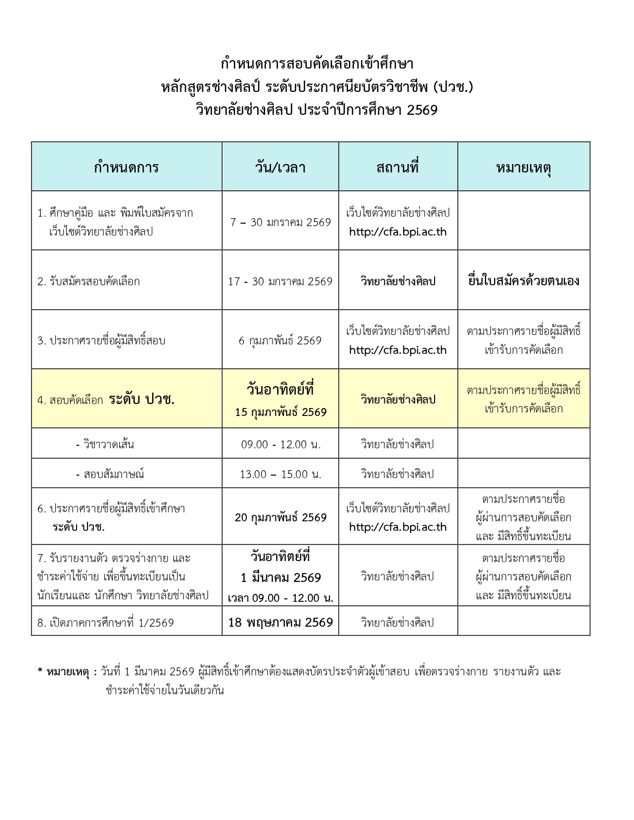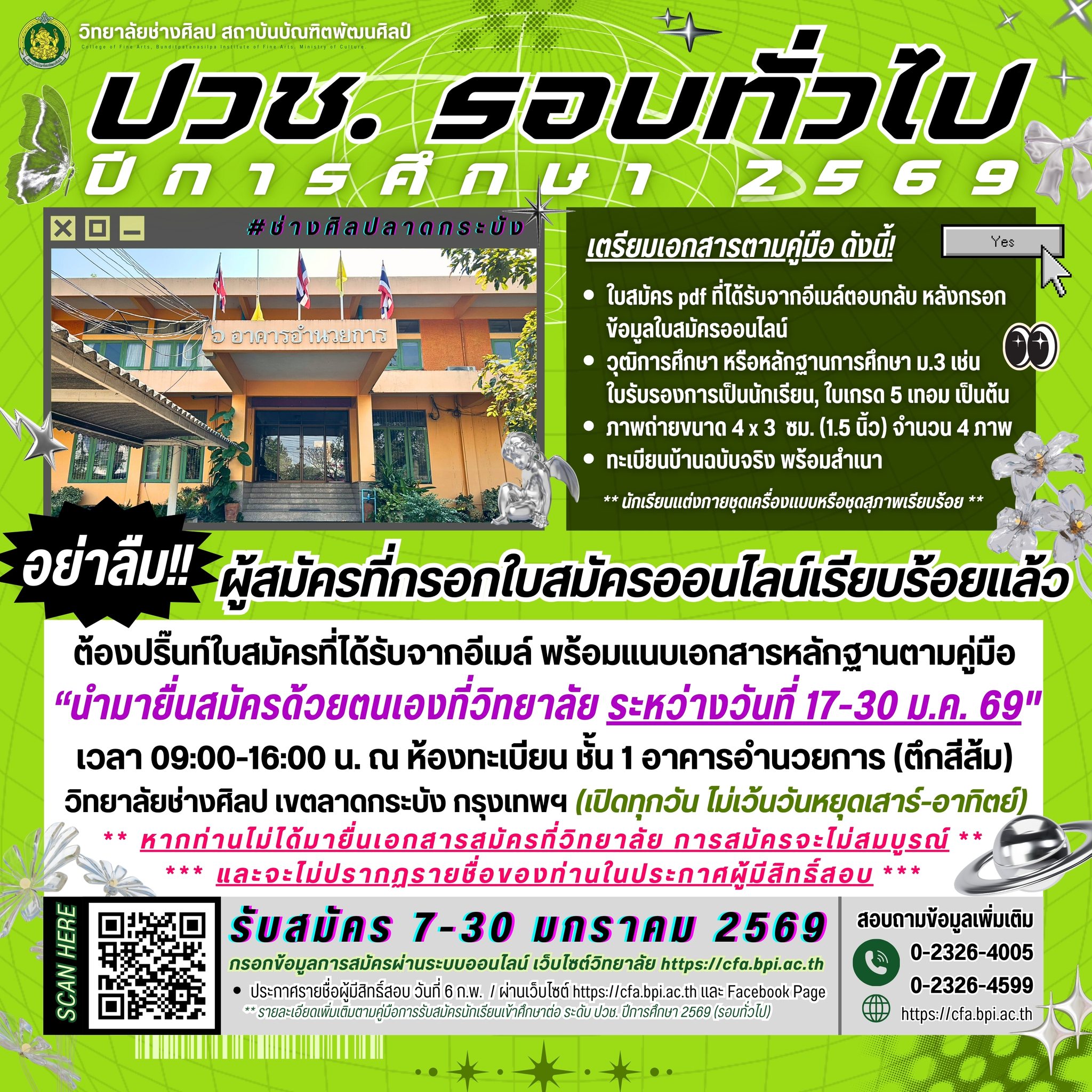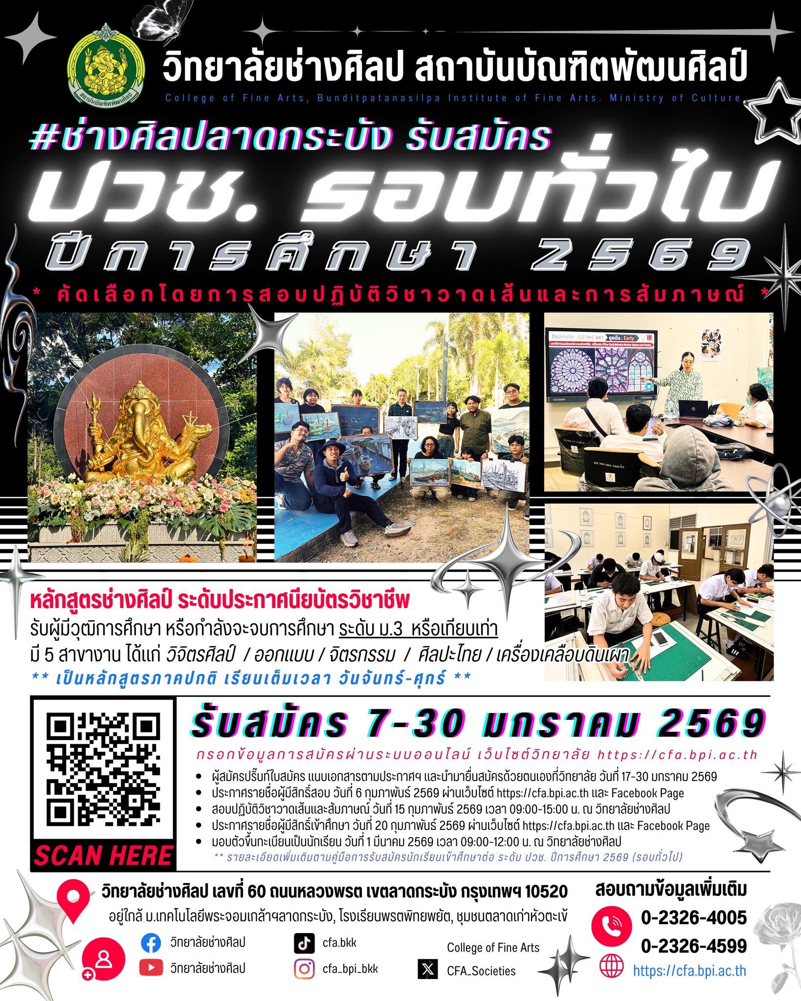 EZ Webmaster January 28, 2026 EZ Webmaster January 28, 2026 เสาร์-อาทิตย์ เปิดยื่นใบสมัครได้ทุกวัน กรอกใบสมัครสามารถมายื่นเอกสารสมัครที่วิทยาลัย ภายใน 30 ม.ค.นี้ เสาร์-อาทิตย์ เปิดยื่นใบสมัครได้ทุกวัน กรอกใบสมัครสามารถมายื่นเอกสารสมัครที่วิทยาลัย ภายใน 30 ม.ค.นี้ รับสมัครและยื่นเอกสารสมัครที่วิทยาลัย เปิดรับทุกวัน ปริ๊นท์ใบสมัคร pdf ที่ได้รับจากอีเมล์ พร้อมแนบเอกสารหลักฐานตามคู่มือ นำมายื่นสมัครด้วยด้วยตนเองที่วิทยาลัยช่างศิลป ได้ตั้งแต่วันที่ 17-30 มกราคม 2569 เวลา 09:00-16:00 น. ไม่เว้นวันหยุดเสาร์-อาทิตย์ สามารถมาได้ทุกวัน แผนที่ตำแหน่งที่ตั้งวิทยาลัย : https://maps.app.goo.gl/cSSv6JDc3z45LCeP7 ผู้สมัครทุกท่านต้องมายื่นเอกสารสมัครที่วิทยาลัยด้วยตนเอง ไม่สามารถให้ผู้อื่นมาแทนได้ หากท่านไม่ได้มายื่นเอกสารที่วิทยาลัยด้วยตนเอง การสมัครจะไม่สมบูรณ์ และไม่ปรากฏรายชื่อของท่านในประกาศผู้มีสิทธิ์สอบ -ผู้สมัครต้องเตรียมเอกสารตามคู่มือ ดังนี้- 1.) ใบสมัคร pdf ที่ได้รับจากอีเมล์ตอบกลับ หลังกรอกข้อมูลใบสมัครออนไลน์ 2.) วุฒิการศึกษา หรือหลักฐานการศึกษา ม.3 เช่น ใบรับรองการเป็นนักเรียน, ใบเกรด 5 เทอม เป็นต้น 3.) ภาพถ่ายขนาด 4 x 3 ซม. (1.5 นิ้ว) จำนวน 4 ภาพ 4.) ทะเบียนบ้านฉบับจริง พร้อมสำเนา นักเรียนแต่งกายชุดเครื่องแบบหรือชุดสุภาพเรียบร้อย ผู้สมัครโปรดศึกษาคู่มือการสมัครโดยละเอียด ประกาศรับสมัคร https://sites.google.com/cfa.bpi.ac.th/cfar1/main ศึกษาคู่มือการสมัคร https://sites.google.com/cfa.bpi.ac.th/cfar1/v?authuser=0 ลิงค์กรอกใบสมัครออนไลน์ https://docs.google.com/…/1FAIpQLSct28nDb2PzpX…/viewform กำหนดการรับสมัคร กรอกใบสมัครและปริ๊นท์ใบสมัคร วันที่ 7-30 มกราคม 2569 ยื่นเอกสารการสมัครด้วยตนเองที่วิทยาลัย วันที่ 17-30 มกราคม 2569 ประกาศรายชื่อผู้มีสิทธิ์สอบ วันที่ 6 กุมภาพันธ์ 2569 สอบคัดเลือก วันอาทิตย์ที่ 15 กุมภาพันธ์ 2569 ณ วิทยาลัยช่างศิลป 09:00-12:00 น. สอบปฏิบัติวิชาวาดเส้น 13:00-15:00 น. สอบสัมภาษณ์ ประกาศรายชื่อผู้สีสิทธิ์เข้าศึกษา วันที่ 20 กุมภาพันธ์ 2569 รายงานตัว ตรวจร่างกาย และชำระค่าใช้จ่ายขค่นทะเยียนเป็นนักเรียน วันที่ 1 มีนาคม 2569 เวลา 09:00-12:00 น. ณ วิทยาลัยช่างศิลป เปิดภาคเรียนที่ 1 ปีการศึกษา 2569 วันที่ 18 พฤษภาคม 2569 -รายละเอียดหลักสูตร- ระดับประกาศนียบัตรวิชาชีพ (ปวช.) รับผู้มีวุฒิการศึกษา หรือกำลังจะจบการศึกษา ระดับ ม.3 นักเรียนสามารถเลือกศึกษาต่อสาขางานที่สนใจได้เมื่อขึ้นชั้นปีที่ 2 มีทั้งหมด 5 สาขางาน ได้แก่ สาขางานวิจิตรศิลป์ / สาขางานจิตรกรรม / สาขางานศิลปะไทย / สาขางานออกแบบ / สาขางานเครื่องเคลือบดินเผา วิทยาลัยเปิดสอนเฉพาะหลักสูตรภาคปกติ เรียนเต็มเวลา วันจันทร์-ศุกร์ (ไม่มีภาคค่ำ-เสาร์อาทิตย์) ระดับ ปวช. ไม่มีค่าเทอม แต่จะมีค่า