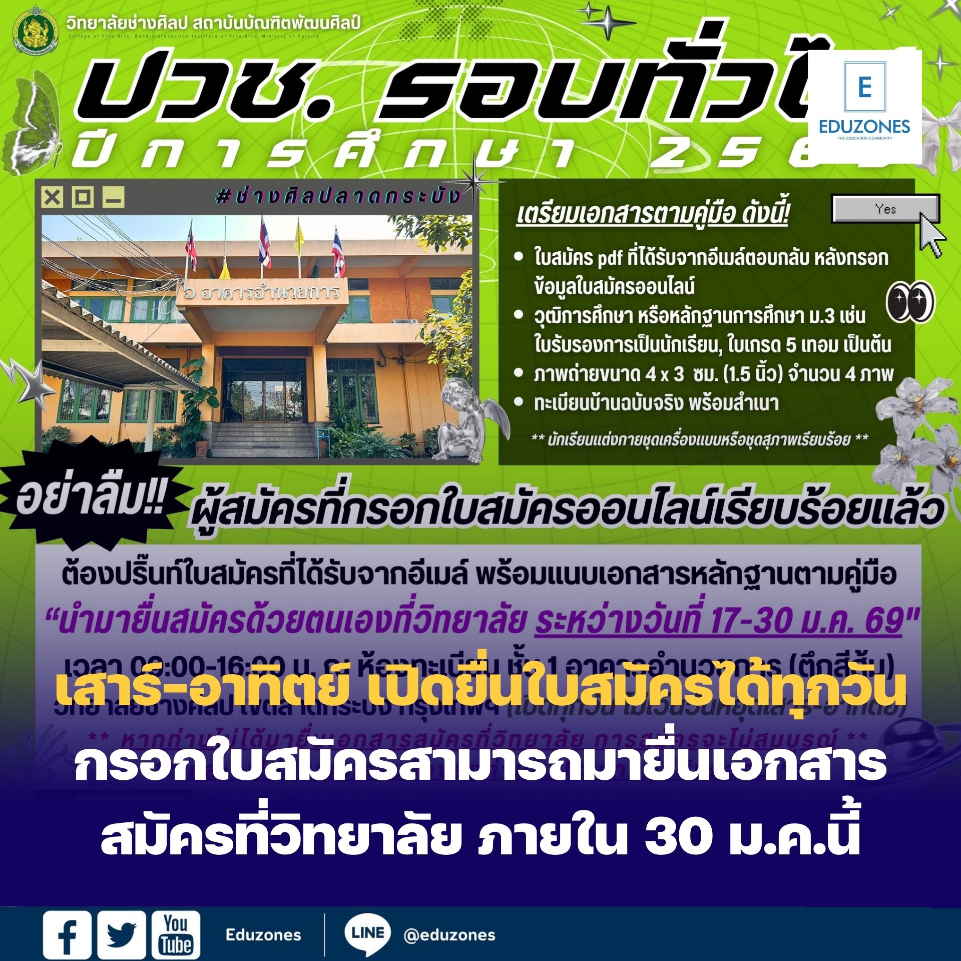 เสาร์-อาทิตย์ เปิดยื่นใบสมัครได้ทุกวัน กรอกใบสมัครสามารถมายื่นเอกสารสมัครที่วิทยาลัย ภายใน 30 ม.ค.นี้ EZ WebmasterJanuary 28, 2026 เสาร์-อาทิตย์ เปิดยื่นใบสมัครได้ทุกวัน กรอกใบสมัครสามารถมายื่นเอกสารสมัครที่วิทยาลัย ภายใน 30 ม.ค.นี้ รับสมัครและยื่นเอกสารสมัครที่วิทยาลัย เปิดรับทุกวัน ปริ๊นท์ใบสมัคร pdf ที่ได้รับจากอีเมล์ พร้อมแนบเอกสารหลักฐานตามคู่มือ นำมายื่นสมัครด้วยด้วยตนเองที่วิทยาลัยช่างศิลป ได้ตั้งแต่วันที่ 17-30 มกราคม 2569 เวลา… 77 ปี “มศว” มหาวิทยาลัยเพื่อสังคม ในมิติ L O V E S – Growth for All ผลักดันบุคลากร นิสิตสู่การเป็น Global Citizen ในทุกมิติของการเติบโต EZ WebmasterJanuary 28, 2026 77 ปี “มศว” มหาวิทยาลัยเพื่อสังคม ในมิติ L O V E S – Growth for All ผลักดันบุคลากร นิสิตสู่การเป็น Global Citizen… คณะอุตสาหกรรมเกษตรดิจิตอล มจพ. ปราจีนบุรี เปิดรับสมัครนักเรียน ศึกษาต่อหลักสูตรโรงเรียน-โรงงาน” ประจำปี 2569 รอบที่ 2 EZ WebmasterJanuary 28, 2026 คณะอุตสาหกรรมเกษตรดิจิตอล มจพ. ปราจีนบุรี เปิดรับสมัครนักเรียนศึกษาต่อหลักสูตรโรงเรียน-โรงงาน” ประจำปี 2569 รอบที่ 2 คณะอุตสาหกรรมเกษตรดิจิตอล มหาวิทยาลัยเทคโนโลยีพระจอมเกล้าพระนครเหนือ วิทยาเขตปราจีนบุรี รับสมัครนักเรียน ผู้สำเร็จการศึกษาระดับมัธยมศึกษาปีที่ 3 หรือเทียบเท่า เข้าศึกษาต่อ “หลักสูตรโรงเรียน-โรงงาน” ระดับปริญญาตรีต่อเนื่อง… เปิดรับสมัคร! กิจกรรม ดินแดนแห่งเสียงเพลง โด เร มี (The Land of Music Do, Re, Mi) EZ WebmasterJanuary 28, 2026 เปิดรับสมัคร! กิจกรรม ดินแดนแห่งเสียงเพลง โด เร มี (The Land of Music Do, Re, Mi) มาร่วมผจญภัยในโลกแห่งเสียงดนตรีไปกับเรา! กิจกรรมแสนสนุกที่จะพาน้องๆ ระดับประถมศึกษา เรียนรู้ทักษะพื้นฐานทางด้านดนตรีผ่านการฟัง การร้อง… นักศึกษา เสาร์-อาทิตย์ เปิดยื่นใบสมัครได้ทุกวัน กรอกใบสมัครสามารถมายื่นเอกสารสมัครที่วิทยาลัย ภายใน 30 ม.ค.นี้ EZ WebmasterJanuary 28, 2026 เสาร์-อาทิตย์ เปิดยื่นใบสมัครได้ทุกวัน กรอกใบสมัครสามารถมายื่นเอกสารสมัครที่วิทยาลัย ภายใน 30 ม.ค.นี้ รับสมัครและยื่นเอกสารสมัครที่วิทยาลัย เปิดรับทุกวัน ปริ๊นท์ใบสมัคร pdf ที่ได้รับจากอีเมล์ พร้อมแนบเอกสารหลักฐานตามคู่มือ นำมายื่นสมัครด้วยด้วยตนเองที่วิทยาลัยช่างศิลป ได้ตั้งแต่วันที่ 17-30 มกราคม 2569 เวลา… 77 ปี “มศว” มหาวิทยาลัยเพื่อสังคม ในมิติ L O V E S – Growth for All ผลักดันบุคลากร นิสิตสู่การเป็น Global Citizen ในทุกมิติของการเติบโต EZ WebmasterJanuary 28, 2026 77 ปี “มศว” มหาวิทยาลัยเพื่อสังคม ในมิติ L O V E S – Growth for All ผลักดันบุคลากร นิสิตสู่การเป็น Global Citizen… คณะอุตสาหกรรมเกษตรดิจิตอล มจพ. ปราจีนบุรี เปิดรับสมัครนักเรียน ศึกษาต่อหลักสูตรโรงเรียน-โรงงาน” ประจำปี 2569 รอบที่ 2 EZ WebmasterJanuary 28, 2026 คณะอุตสาหกรร