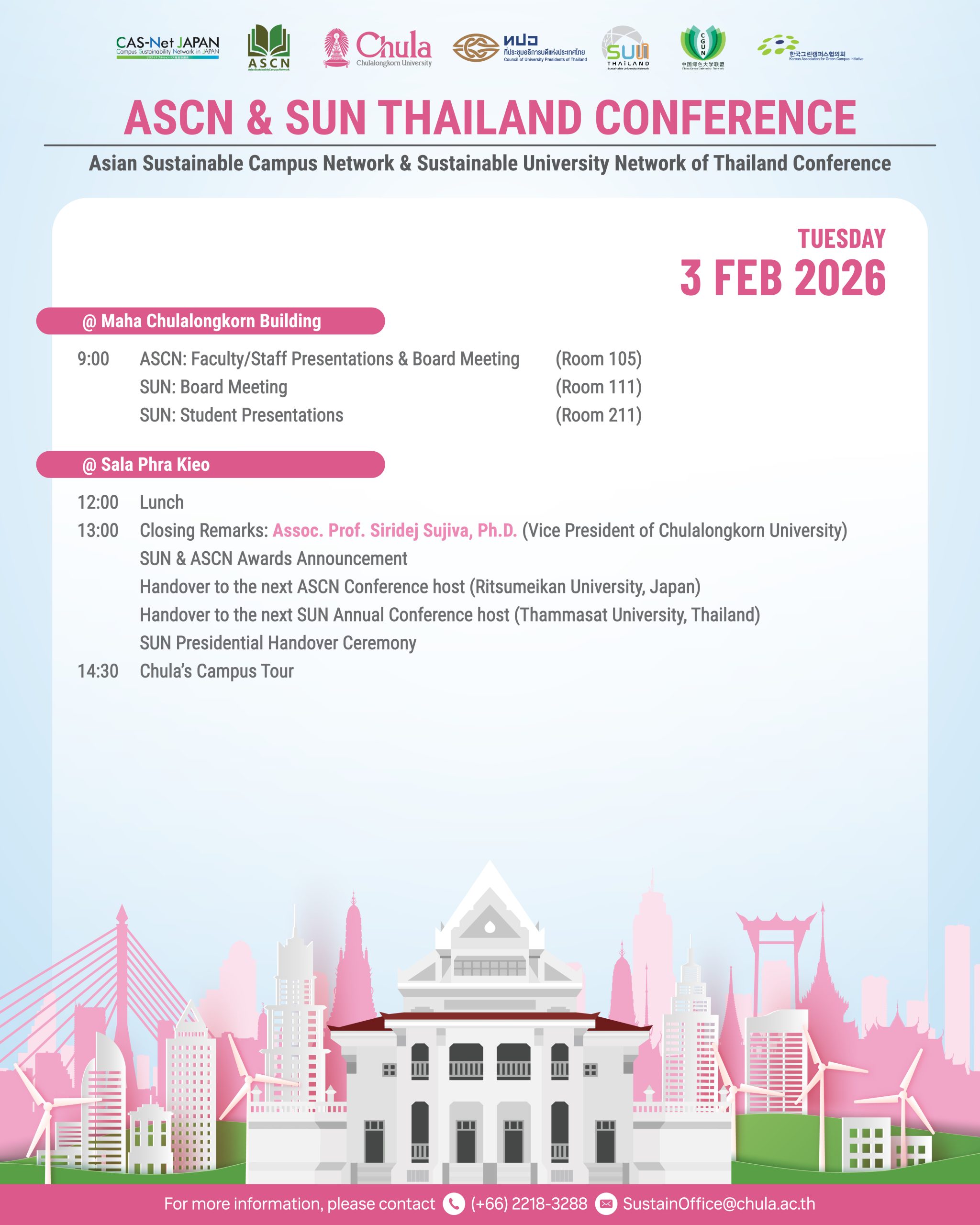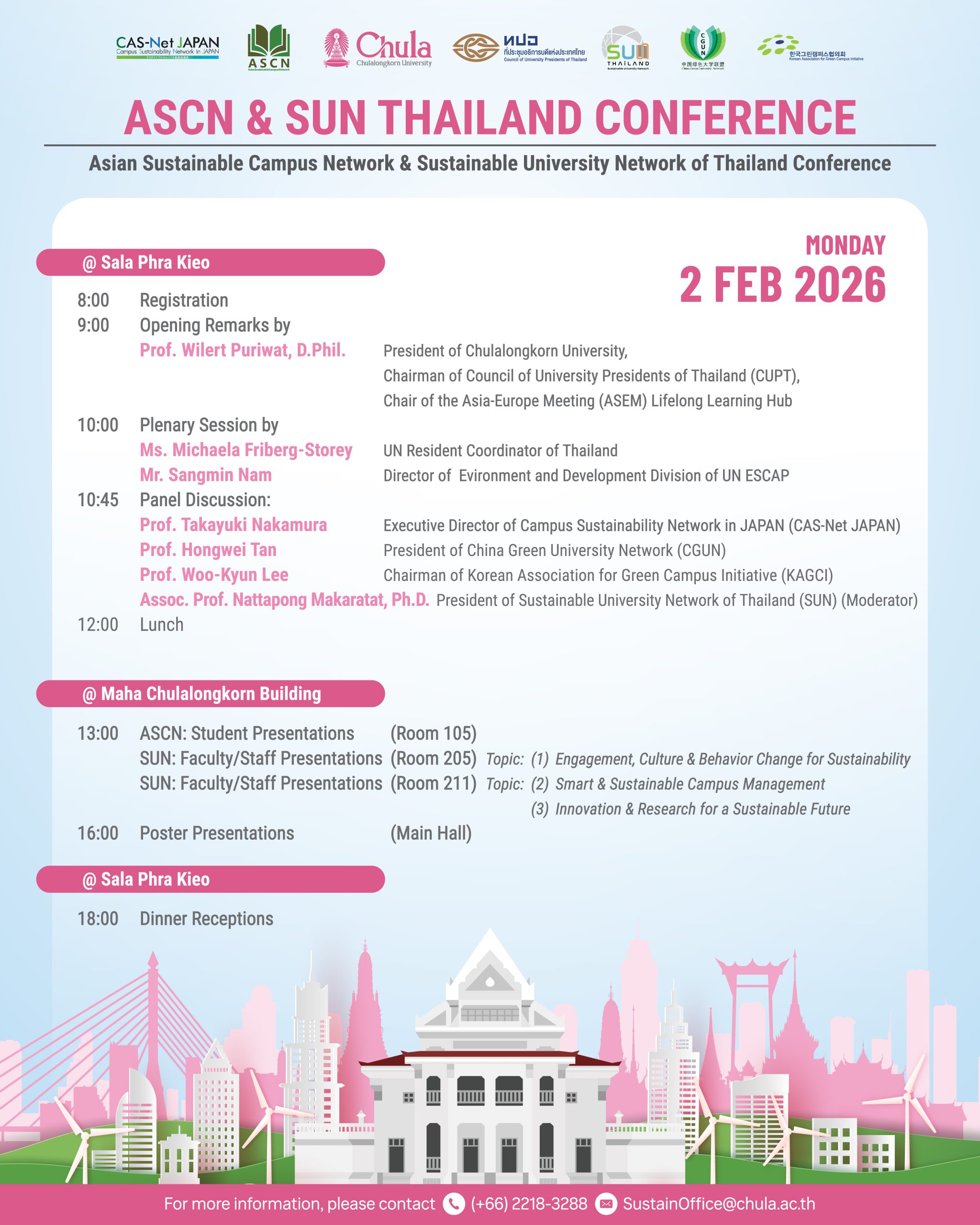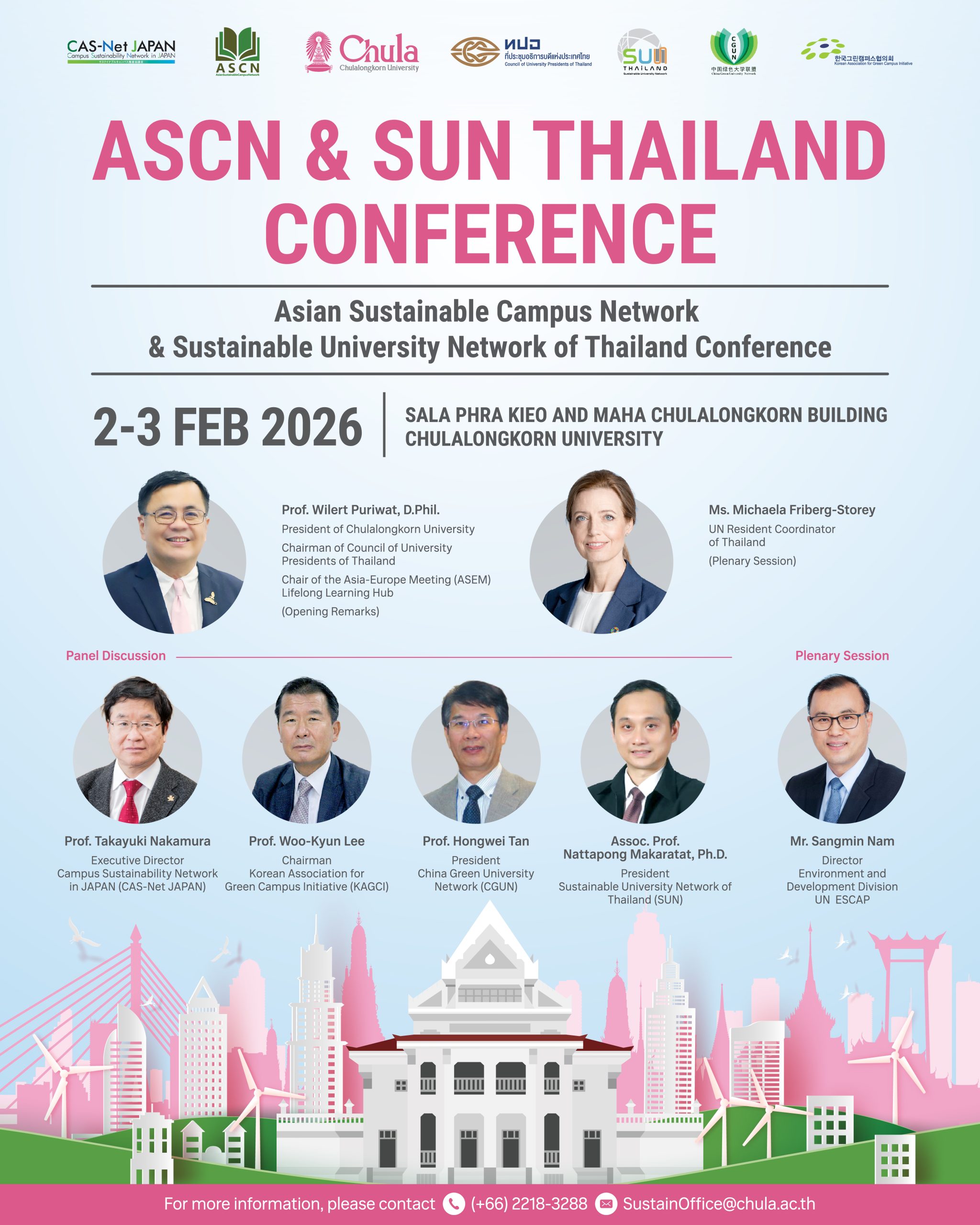 EZ Webmaster February 2, 2026 EZ Webmaster February 2, 2026 จุฬาฯ เจ้าภาพการประชุมวิชาการนานาชาติ Asian Sustainable Campus Network (ASCN) และการประชุมเครือข่ายมหาวิทยาลัยยั่งยืนแห่งประเทศไทย (SUN) ครั้งที่ 10 แลกเปลี่ยนความรู้ นวัตกรรม ส่งเสริมความร่วมมือวิชาการและงานวิจัยด้านความยั่งยืน จุฬาฯ เจ้าภาพการประชุมวิชาการนานาชาติ Asian Sustainable Campus Network (ASCN) และการประชุมเครือข่ายมหาวิทยาลัยยั่งยืนแห่งประเทศไทย (SUN) ครั้งที่ 10 แลกเปลี่ยนความรู้ นวัตกรรม ส่งเสริมความร่วมมือวิชาการและงานวิจัยด้านความยั่งยืน จุฬาลงกรณ์มหาวิทยาลัยได้รับเกียรติเป็นเจ้าภาพจัดการประชุมวิชาการระดับนานาชาติ Asian Sustainable Campus Network (ASCN Conference) ควบคู่กับการประชุมวิชาการประจำปี ครั้งที่ 10 ของเครือข่ายมหาวิทยาลัยยั่งยืนแห่งประเทศไทย (10th Sustainable University Network of Thailand: SUN Annual Conference) ระหว่างวันที่ 2–3 กุมภาพันธ์ 2569 ณ ศาลาพระเกี้ยว และอาคารมหาจุฬาลงกรณ์ ศาสตราจารย์ ดร.วิเลิศ ภูริวัชร อธิการบดีจุฬาลงกรณ์มหาวิทยาลัย ประธานที่ประชุมอธิการบดีแห่งประเทศไทย (ทปอ.) และประธาน Asia-Europe Meeting (ASEM) Life Long Learning Hub เป็นประธานกล่าวเปิดงานเมื่อวันจันทร์ที่ 2 กุมภาพันธ์ 2569 ณ ศาลาพระเกี้ยว จุฬาลงกรณ์มหาวิทยาลัย ศาสตราจารย์ ดร.วิเลิศ ภูริวัชร อธิการบดีจุฬาฯ เปิดเผยว่า การประชุมวิชาการนานาชาติ Asian Sustainable Campus Network (ASCN) และการประชุมเครือข่ายมหาวิทยาลัยยั่งยืนแห่งประเทศไทย (SUN) ครั้งที่ 10 ที่จุฬาฯ เป็นเจ้าภาพด้วยความร่วมมือของที่ประชุมอธิการบดีแห่งประเทศไทย (ทปอ.) เป็นการสร้างเครือข่ายการพัฒนาที่ยั่งยืนทั้งในระดับประเทศและนานาชาติ เป็นการผนึกความร่วมมือกันระหว่างมหาวิทยาลัยไทยกับมหาวิทยาลัยต่างประเทศ บทบาทของมหาวิทยาลัยในเรื่องของความยั่งยืนเป็นการมองไปไกลในระยะยาวจนถึงระดับนานาชาติและมองในเชิงลึก ผลของการประชุมวิชาการในครั้งนี้จะนำไปสู่แผนปฏิบัติการจริง ผู้เข้าร่วมการประชุมจะได้แลกเปลี่ยนความรู้ระหว่างกันเพื่อให้โลกของเราเติบโตอย่างยั่งยืน อธิการบดีจุฬาฯ กล่าวว่าปัจจุบันการศึกษาของประเทศไทยมีการเปลี่ยนแปลงรูปแบบการเรียนการสอนจากเดิมที่มีการเรียนในห้องเรียนซึ่งเป็นการเรียนแบบท่องจำ เป็นการเรียนรู้นอกห้องเรียนควบคู่ไปด้วย ซึ่งการเรียนดังกล่าวจะต้องสร้างผลกระทบต่อโลกและสังคม ตลอดจนสร้างนิสิตนักศึกษาให้เป็นพลเมืองโลก (Global Citizen) แผนปฏิบัติการจากการประชุมวิชาการครั้งนี้จะเริ่มตั้งแต่นโยบายในด้านนานาชาติ จนถึงผู้ปฏิบัติการและนิสิต มหาวิทยาลัยต้องการให้ความยั่งยืนเติบโตรอบทิศมีนิสิตนักศึกษาเป็นศูนย์กลางในการพัฒนาความยั่งยืน ในโอกาสนี้มีการบรรยาย (Plenary Session) โดย Ms. 