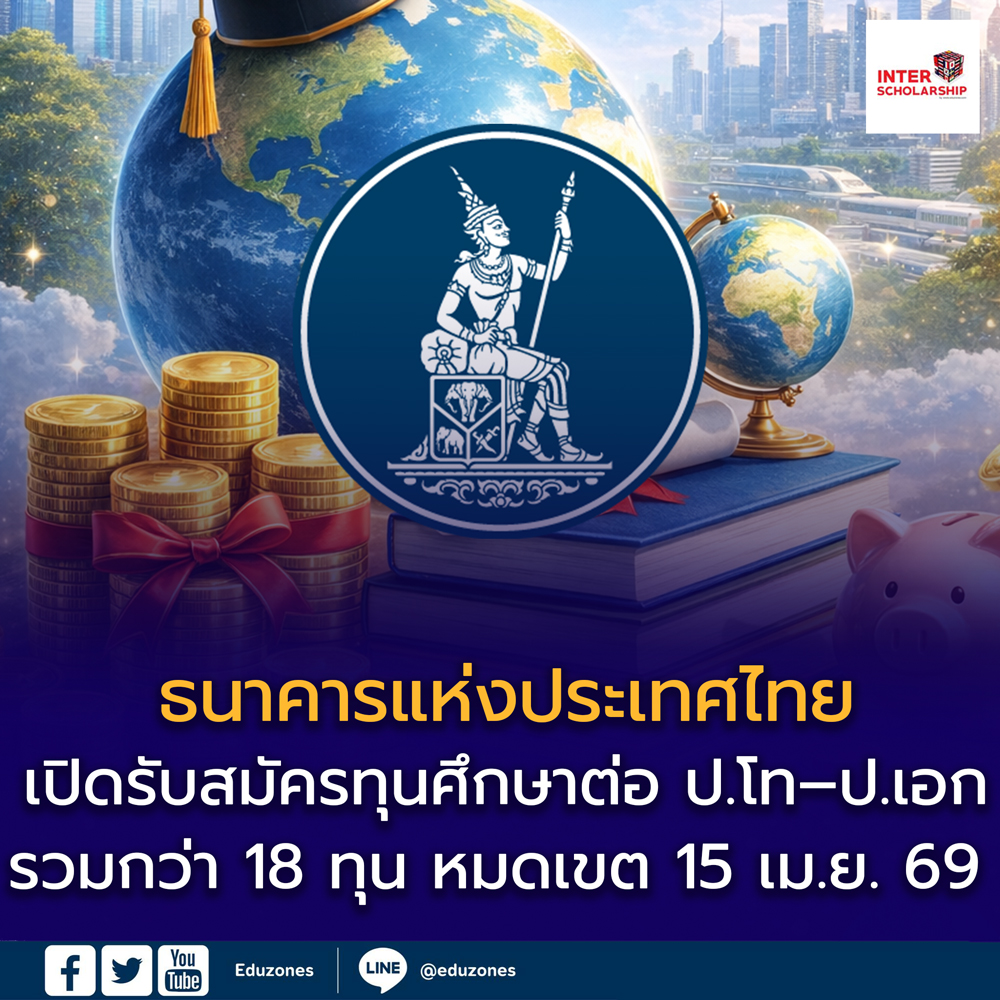 EZ Webmaster February 5, 2026 EZ Webmaster February 5, 2026 ธนาคารแห่งประเทศไทย เปิดรับสมัครทุนศึกษาต่อ ป.โท–ป.เอก ปี 2569 ธนาคารแห่งประเทศไทย เปิดรับสมัครทุนศึกษาต่อ ป.โท–ป.เอก ปี 2569 รวมกว่า 18 ทุน ครอบคลุมสายการเงิน เทคโนโลยี และกฎหมาย สมัครถึง 15 เมษายน 2569 ธนาคารแห่งประเทศไทย (ธปท.)เปิดรับสมัครทุนการศึกษาเพื่อศึกษาต่อในระดับ ปริญญาโทและปริญญาเอกประจำปี 2569 สำหรับ บุคคลทั่วไปและพนักงาน ธปท.โดยเปิดโอกาสให้เข้าศึกษาในสถาบันชั้นนำทั้ง ในประเทศและต่างประเทศรวมจำนวน มากกว่า 18 ทุน ทุนการศึกษาของ ธปท. ในปีนี้ครอบคลุมหลากหลายสาขาที่สอดคล้องกับการเปลี่ยนแปลงของโลกยุคใหม่ทั้งด้าน เศรษฐศาสตร์ การเงิน เทคโนโลยี AI ข้อมูล และกฎหมายถือเป็นอีกหนึ่งโอกาสสำคัญสำหรับผู้ที่ต้องการพัฒนาศักยภาพสู่การเป็นผู้เชี่ยวชาญระดับสากล 📌 ประเภททุนการศึกษาที่เปิดรับ (4 ประเภทหลัก) 🔹 1. ทุนระดับพรีเมียม ทุน ดร.ป๋วย อึ๊งภากรณ์ (Dr. Puey Ungphakorn Centenary Scholarship) ทุนการศึกษาระดับสูงสุดของ ธปท.เพื่อศึกษาต่อ ณ The London School of Economics and Political Science (LSE)ประเทศอังกฤษ ระดับ: ปริญญาโทขึ้นไป จำนวน: 1 ทุน สาขาที่เปิดรับ: Econometrics Economics Finance Data Science และสาขาที่เกี่ยวข้อง 🔹 2. ทุนแข่งขัน ระดับปริญญาเอก (ต่างประเทศ) มุ่งพัฒนาผู้เชี่ยวชาญด้านเศรษฐศาสตร์ในระดับนานาชาติ ระดับ: ปริญญาเอก สาขา: Economics จำนวน: รวมอยู่ในโควตาทุนแข่งขัน ไม่เกิน 15 ทุน 🔹 3. ทุนแข่งขัน ระดับปริญญาโท (ในและต่างประเทศ) เปิดกว้างสำหรับหลากหลายสาขาที่ตอบโจทย์โลกอนาคตทั้งสายเศรษฐกิจ เทคโนโลยี และการบริหาร ระดับ: ปริญญาโท สาขาที่เปิดรับ: Economics Finance & Banking AI / Machine Learning Computer Science Computer Engineering Cyber Security Law Human Resources (HR) จำนวน: รวมอยู่ในโควตาทุนแข่งขัน ไม่เกิน 15 ทุน 🔹 4. ทุนต่อยอด (Top-up Scholarship) สำหรับผู้ที่ได้รับการตอบรับจากมหาวิทยาลัยแล้วหรือกำลังศึกษาอยู่ในระดับปริญญาเอก ณ ต่างประเทศ ระดับ: ปริญญาเอก สาขา: Economics จำนวน: 2 ทุน 🗓️ กำหนดการรับสมัคร เปิดรับสมัคร: ตั้งแต่วันนี้ ปิดรับสมัคร: วันที่ 15 เมษายน 2569 📝 วิธีสมัครและช่องทางข้อมูล สมัครและศึกษารายละเอียดฉบับเต็ม (Official):👉 https://www.bot.or.th/th/about-us/recruitment/scholarship.html(เลือกเมนู “ทุนการศึกษา” > “สมัคร Online”) สอบถามข้อมูลเพิ่มเติม:📞 งานทุนการศึกษา ธปท. โทร. 0-2283-6754📧 Email: Scholarship-HRD@bot.or.th 🔎 ข้อแนะนำจาก Eduzones ทุนการศึกษาของ ธปท. เป็นทุนที่มีการแข่งขันสูงผู้สนใจควรเตรียม✔ แผนการศึกษาและเป้าหมายอาชีพให้ชัดเจน✔ เอกสารประกอบการสมัครให้ครบถ้วน✔ ความพร้อมด้านภาษาและวิชาการ เพื่อเพิ่มโอกาสในการได้รับคัดเลือก
