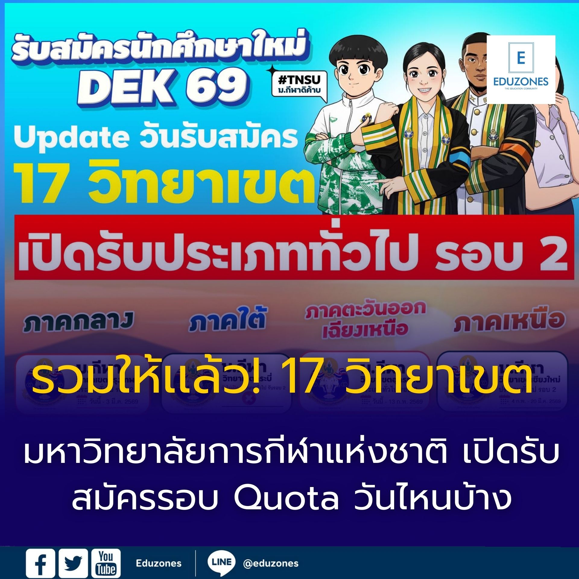 EZ Webmaster February 9, 2026 EZ Webmaster February 9, 2026 รวมให้เเล้ว! 17 วิทยาเขต มหาวิทยาลัยการกีฬาแห่งชาติ เปิดรับสมัครรอบ Quota วันไหนบ้าง รวมให้เเล้ว! 17 วิทยาเขต มหาวิทยาลัยการกีฬาแห่งชาติ เปิดรับสมัครรอบ Quota วันไหนบ้าง เพราะพรสวรรค์ต้องการการเจียระไน และความมุ่งมั่นต้องการสนามที่ใช่! หากคุณคือคนที่มีหัวใจรักกีฬา ไม่ว่าจะเป็นนักกรีฑาลมกรด นักสู้บนสังเวียน หรือผู้ที่หลงใหลในวิทยาศาสตร์การกีฬา มหาวิทยาลัยการกีฬาแห่งชาติพร้อมเปิดประตูรับสมัครรอบ Quota เพื่อเฟ้นหาช้างเผือกจากทั่วประเทศ เข้ามาพัฒนาทักษะสู่ระดับสากล พร้อมโอกาสทางการศึกษาที่ตอบโจทย์ไลฟ์สไตล์คนรักกีฬาอย่างแท้จริง ภาคกลาง มหาวิทยาลัยการกีฬาแห่งชาติ วิทยาเขตกรุงเทพ ตั้งแต่วันนี้ – 3 มีนาคม 2569 เว็บไซต์มหาวิทยาลัย : ” คลิก “ เเฟนเพจ facebook : ” คลิก “ มหาวิทยาลัยการกีฬาแห่งชาติ วิทยาเขตชลบุรี ตั้งแต่วันนี้ – 24 กุมภาพันธ์ 2569 เว็บไซต์มหาวิทยาลัย : ” คลิก “ เเฟนเพจ facebook : ” คลิก “ มหาวิทยาลัยการกีฬาแห่งชาติ วิทยาเขตอ่างทอง ตั้งแต่วันนี้ – 27 มีนาคม 2569 เว็บไซต์มหาวิทยาลัย : ” คลิก “ เเฟนเพจ facebook : ” คลิก “ มหาวิทยาลัยการกีฬาแห่งชาติ วิทยาเขตสุพรรณบุรี ตั้งแต่วันนี้ – 13 มีนาคม 2569 เว็บไซต์มหาวิทยาลัย : ” คลิก “ เเฟนเพจ facebook : ” คลิก “ มหาวิทยาลัยการกีฬาแห่งชาติ วิทยาเขตสมุทรสาคร ตั้งแต่วันนี้ – 21 มีนาคม 2569 เว็บไซต์มหาวิทยาลัย : ” คลิก “ เเฟนเพจ facebook : ” คลิก “ ภาคใต้ มหาวิทยาลัยการกีฬาแห่งชาติ วิทยาเขตชุมพร ตั้งแต่วันนี้ – 5 มีนาคม 2569 เว็บไซต์มหาวิทยาลัย : ” คลิก “ เเฟนเพจ facebook : ” คลิก “ มหาวิทยาลัยการกีฬาแห่งชาติ วิทยาเขตยะลา ตั้งแต่วันนี้ – 27 มีนาคม 2569 เว็บไซต์มหาวิทยาลัย : ” คลิก “ เเฟนเพจ facebook : ” คลิก “ มหาวิทยาลัยการกีฬาแห่งชาติ วิทยาเขตตรัง ตั้งแต่วันนี้ – 20 มีนาคม 2569 เว็บไซต์มหาวิทยาลัย : ” คลิก “ เเฟนเพจ facebook : ” คลิก “ ภาคเหนือ มหาวิทยาลัยการกีฬาแห่งชาติ วิทยาเขตเชียงใหม่ ตั้งแต่วันนี้ – 20 มีนาคม 2569 เว็บไซต์มหาวิทยาลัย : ” คลิก “ เเฟนเพจ facebook : ” คลิก “ มหาวิทยาลัยการกีฬาแห่งชาติ วิทยาเขตลำปาง ตั้งแต่วันนี้ – 18 กุมภาพันธ์ 2569 เว็บไซต์มหาวิทยาลัย : ” คลิก “ เเฟนเพจ facebook : ” คลิก “ ภาคตะวันออกเฉียงเหนือ มหาวิทยาลัยการกีฬาแห่งชาติ วิทยาเขตอุดรธานี ตั้งแต่วันนี้ – 13 กุมภาพันธ์ 2569 เว็บไซต์มหาวิทยาลัย : ” คลิก “ เเฟนเพจ facebook : ” คลิก “ มหาวิทยาลัยการกีฬาแห่งชาติ วิทยาเขตศรีสะเกษ ตั้งแต่วันนี้ – 1 มีนาคม 2569 เว็บไซต์มหาวิทยาลัย : ” คลิก “ เเฟนเพจ facebook : ” คลิก “ มหาวิทยาลัยการกีฬาแห่งชาติ วิทยาเขตชัยภูมิ ตั้งแต่วันนี้ – 11 กุมภาพันธ์ 2569 เว็บไซต์มหาวิทยาลัย : ” คลิก “ เเฟนเพจ faceboo