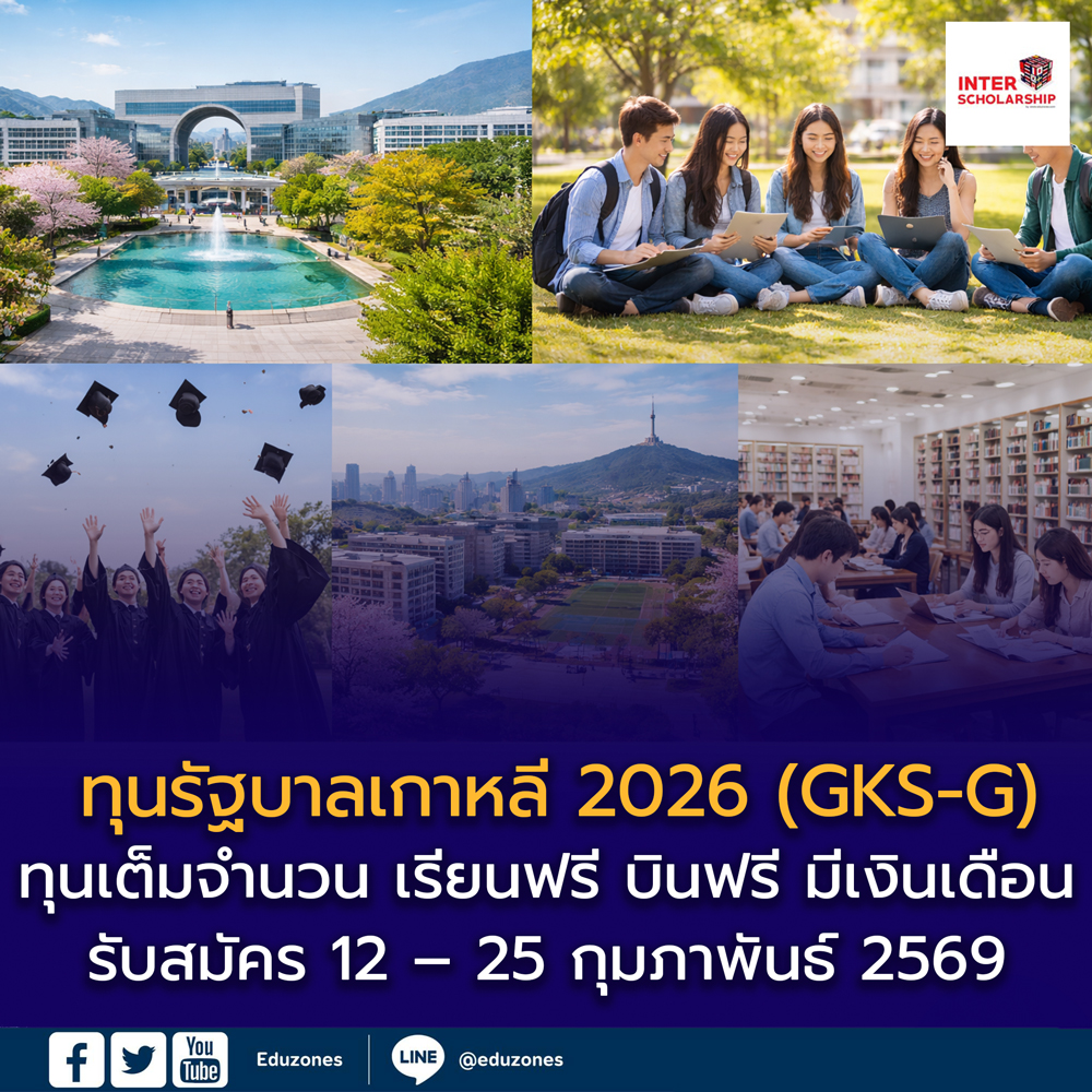 EZ Webmaster February 16, 2026 EZ Webmaster February 16, 2026 ทุนรัฐบาลเกาหลี 2026 (GKS-G) เปิดรับสมัครแล้ว! เรียนฟรีเต็มจำนวน ป.โท–เอก–วิจัย พร้อมเงินสนับสนุนรายเดือน ทุนรัฐบาลเกาหลี 2026 (GKS-G) เปิดรับสมัครแล้ว! เรียนฟรีเต็มจำนวน ป.โท–เอก–วิจัย พร้อมเงินสนับสนุนรายเดือน รัฐบาลสาธารณรัฐเกาหลี โดยสถาบันการศึกษานานาชาติแห่งชาติ (National Institute for International Education: NIIED) ประกาศเปิดรับสมัคร ทุนรัฐบาลเกาหลี ประจำปี 2569 (2026 Global Korea Scholarship – Graduate Degree: GKS-G) อย่างเป็นทางการ มอบโอกาสให้นักศึกษาไทยที่มีศักยภาพเข้าศึกษาต่อระดับปริญญาโท ปริญญาเอก และหลักสูตรวิจัย ณ สาธารณรัฐเกาหลี ทุนดังกล่าวเป็น ทุนให้เปล่าแบบเต็มจำนวน (Full Grant) ครอบคลุมค่าใช้จ่ายรอบด้านตลอดหลักสูตร พร้อมเปิดรับสมัครรอบสถานทูตฯ ผ่านระบบออนไลน์ ระหว่างวันที่ 12 – 25 กุมภาพันธ์ 2569 สิทธิประโยชน์ทุน GKS-G 2026 (ข้อมูลทางการ) ผู้ที่ผ่านการคัดเลือกจะได้รับการสนับสนุนดังนี้ 🎓 ค่าเล่าเรียน: ฟรี 100% ตลอดหลักสูตร ✈️ ตั๋วเครื่องบิน: ไป-กลับ ชั้นประหยัด 🇰🇷 เรียนภาษาเกาหลี: ฟรี 1 ปี (สำหรับผู้ที่ยังไม่มีผล TOPIK ระดับ 5-6) 💰 เงินสนับสนุนรายเดือน (Monthly Stipend): ป.โท / ป.เอก (รวมช่วงเรียนภาษา) เดือนละ 1,000,000 วอน (ประมาณ 26,000 – 27,000 บาท*) หลักสูตรวิจัย (Research Program) เดือนละ 1,500,000 วอน (ประมาณ 39,000 – 40,000 บาท*) ผู้ที่มีผลสอบ TOPIK ระดับ 5 หรือ 6 จะได้รับเงินเพิ่มพิเศษอีกเดือนละ 100,000 วอน 🏥 สวัสดิการอื่น ๆ: ประกันสุขภาพ ค่าพิมพ์วิทยานิพนธ์ (ตามวงเงินที่กำหนด) เงินสนับสนุนเมื่อสำเร็จการศึกษา *หมายเหตุ: อัตราแลกเปลี่ยนเป็นการประมาณการ อาจเปลี่ยนแปลงตามค่าเงิน โควตาสำหรับประเทศไทย ปีการศึกษา 2026 ประเทศไทยได้รับจัดสรรรวม 34 ทุน (ไม่รวมโควตากลางระดับโลก) แบ่งเป็น 2 แทร็กหลัก ดังนี้ 1️⃣ Embassy Track (สมัครผ่านสถานทูตเกาหลีฯ) รวม 17 ทุน ตัวจริง 16 ทุน สำรอง 1 ทุน ผู้สมัครเลือกมหาวิทยาลัยได้ 3 แห่ง (ต้องมี Type B อย่างน้อย 1 แห่ง) เปิดรับสมัคร: 12 – 25 กุมภาพันธ์ 2569 2️⃣ University Track (สมัครตรงกับมหาวิทยาลัย) รวม 17 ทุน General: 6 ทุน (สมัคร ม. Type A หรือ B) R-GKS: 11 ทุน (สมัครเฉพาะ ม. Type B) กำหนดการขึ้นอยู่กับแต่ละมหาวิทยาลัย (ส่วนใหญ่ปิดรับช่วง มีนาคม – ต้นเมษายน 2569) 📌 นอกจากนี้ ยังมีโควตากลางระดับโลก ได้แก่ R&D: 403 ทุนทั่วโลก Global Network: 80 ทุนทั่วโลก คุณสมบัติผู้สมัคร (เบื้องต้น) 🇹🇭 สัญชาติไทย (บิดาและมารดาต้องไม่ถือสัญชาติเกาหลี) 🎂 อายุไม่เกิน 40 ปี (เกิดหลัง 1 ก.ย. 1986) อาจารย์มหาวิทยาลัยสมัครได้ถึง 45 ปี (เกิดหลัง 1 ก.ย. 1981) 🎓 คุณวุฒิการศึกษา สมัคร ป.โท: ต้องจบปริญญาตรี สมัคร ป.เอก: ต้องจบปริญญาโท 📊 GPA ไม่ต่ำกว่า 2.64 หรือ 80% จากสถาบันล่าสุด ❌ ผู้จบการศึกษาจากเกาหลี หรือเคยได้รับทุน GKS มาก่อน (ยกเว้นบางกรณี) ไม่สามารถสมัครได้ ขั้นตอนสม