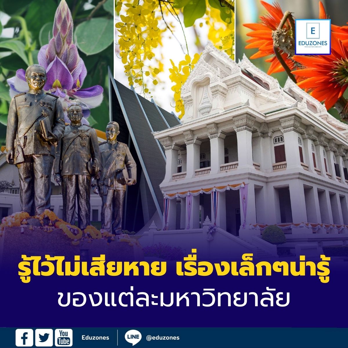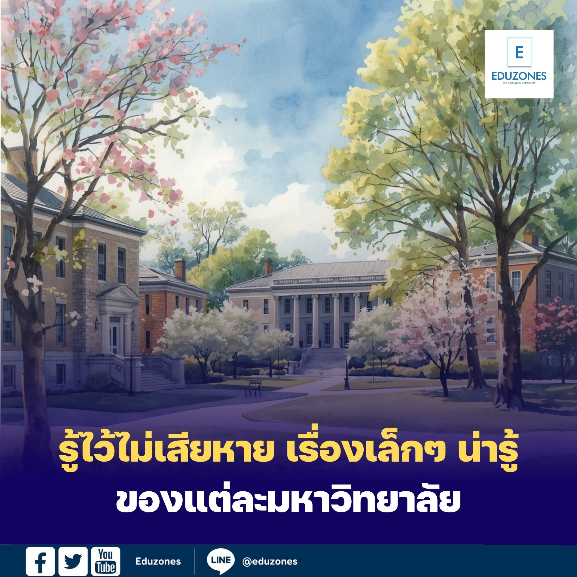 EZ Webmaster February 16, 2026 EZ Webmaster February 16, 2026 รู้ไว้ไม่เสียหาย เรื่องเล็กๆ น่ารู้ของแต่ละมหาวิทยาลัย รู้ไว้ไม่เสียหาย เรื่องเล็กๆ น่ารู้ของแต่ละมหาวิทยาลัย มหาวิทยาลัยแต่ละแห่งไม่ได้มีแค่ชื่อเสียงหรือคณะเด่นเท่านั้น แต่ยังมีเรื่องเล็ก ๆ น้อย ๆ ที่หลายคนอาจมองข้าม ทั้งวัฒนธรรมการเรียน การใช้ชีวิตในรั้วมหาวิทยาลัย สิ่งอำนวยความสะดวก ไปจนถึงบรรยากาศรอบ ๆ ที่ส่งผลต่อชีวิตนักศึกษาโดยตรง เรื่องเหล่านี้แม้จะดูเล็กน้อย แต่รู้ไว้ก่อนตัดสินใจเลือกเรียน ก็ช่วยให้เตรียมตัวและปรับตัวได้ง่ายขึ้นไม่น้อย จุฬาลงกรณ์มหาวิทยาลัย ดอกไม้และต้นไม้ประจำจุฬาลงกรณ์มหาวิทยาลัย คือ : “ต้นจามจุรี” (Rain Tree) หรือที่เรียกกันว่าต้นก้ามปู ความเชื่อ : มีความเชื่อว่าต้นจามจุรีเป็นไม้ให้ร่มเงาและเป็นมงคล สีประจำมหาวิทยาลัย : สีชมพู (มีโค้ดสีทางราชการคือ #DE5C8E) ที่มา: พระบรมราชสมภพวันอังคารของรัชกาลที่ 5 ผู้พระราชทานกำเนิดมหาวิทยาลัย เพลงประจำจุฬาลงกรณ์มหาวิทยาลัย : เพลงมหาจุฬาลงกรณ์ น้ำใจน้องพี่สีชมพู ทุกคนไม่รู้ลืมบูชา พระคุณของแหล่งเรียนมา จุฬาลงกรณ์ ขอทูนขอเทิดพระนามไท พระคุณแนบไว้นิรันดร ขอองค์พระเอื้ออาทร หลั่งพรคุ้มครอง นิสิตพร้อมหน้า สัญญาประคอง ความดีทุกอย่างต่างปอง ผยองพระเกียรติเกริกไกร ขอตราพระเกี้ยวยั้งยืนยง นิสิตประสงค์เป็นธงชัย ถาวรยศอยู่ บุคคลสำคัญของจุฬาลงกรณ์มหาวิทยาลัย : ผู้สถาปนา/ผู้พระราชทานกำเนิด: พระบาทสมเด็จพระจุลจอมเกล้าเจ้าอยู่หัว (รัชกาลที่ 5) และพระบาทสมเด็จพระมงกุฎเกล้าเจ้าอยู่หัว (รัชกาลที่ 6) คำขวัญหรือคติพจน์ประจำมหาวิทยาลัย : คติพจน์ทางการ: ความรู้คู่คุณธรรม คำขวัญ/ปรัชญา: เกียรติภูมิจุฬาฯ คือเกียรติแห่งการรับใช้ประชาชน คติพจน์ 5 (จากแนวพระราชดำริ): สามัคคี (Unity), ประเพณี (Tradition), อาวุโส (Seniority), ระเบียบ (Order), น้ำใจ (Spirit) ปีที่ก่อตั้งมหาวิทยาลัย : ก่อตั้งขึ้นเมื่อวันที่ 26 มีนาคม พ.ศ 2459 จุฬาลงกรณ์มหาวิทยาลัย ตั้งอยู่ที่ : เลขที่ 254 ถนนพญาไท แขวงวังใหม่ เขตปทุมวัน กรุงเทพมหานคร 10330 มหาวิทยาลัยเกษตรศาสตร์ ดอกไม้และต้นไม้ประจำมหาวิทยาลัยเกษตรศาสตร์ คือ : ต้นนนทรี (Peltophorum pterocarpum) เป็นไม้ยืนต้นในตระกูล Leguminosae มีอายุยาวนาน ใบเขียว ตลอดปี สีประจำมหาวิทยาลัย : สีเขียวใบไม้ เพลงประจำมหาวิทยาลัยเกษตรศาสตร์ : เพลงเกษตรศาสตร์ (หญิง) เขียวธงขจี ก่อเกิดไมตรี สามัคคีมั่น สถานเรียนเกษตรนั้น เราผูกพันบูชา(ชาย) เขียวนาป่าไพร แผ่นดินถิ่นไทย ไพบูลย์หนักหนา เพราะไทยผลิตค้า ทุกแหล่งฟ้าหล้าอิ่มเอม(หญิง) แม้เหนื่อยกายใจสำราญ เสร็จกิจการงาน เกษตรเกษม(ชาย) ล้วนปรีเปรม น