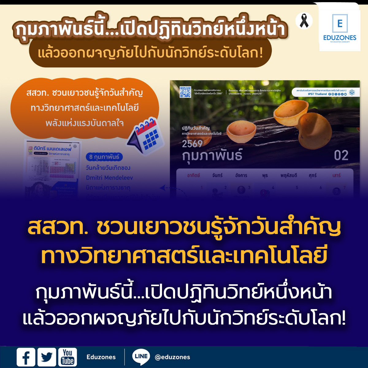 EZ Webmaster February 18, 2026 EZ Webmaster February 18, 2026 กุมภาพันธ์นี้…เปิดปฏิทินวิทย์หนึ่งหน้า แล้วออกผจญภัยไปกับนักวิทย์ระดับโลก! สสวท. ชวนเยาวชนรู้จักวันสำคัญทางวิทยาศาสตร์และเทคโนโลยี พลังแห่งแรงบันดาลใจ “ทำไมท้องฟ้าถึงเป็นสีฟ้า?” หรือ “ใครกันนะที่ทำให้หลอดไฟสว่างขึ้นได้?” คำถามเล็ก ๆ เหล่านี้คือจุดเริ่มต้นของการค้นพบที่ยิ่งใหญ่ เพราะวิทยาศาสตร์ไม่ได้อยู่แค่ในห้องทดลองหรือในตำราเล่มหนาเท่านั้น แต่คือการผจญภัยที่เริ่มจากความสงสัย ความอยากรู้ และความกล้าที่จะฝัน เดือนกุมภาพันธ์นี้ สถาบันส่งเสริมการสอนวิทยาศาสตร์และเทคโนโลยี (สสวท.) ขอชวนเยาวชน คุณครู และทุกคนร่วมเปิดโลกผ่าน “ปฏิทินวันสำคัญทางวิทยาศาสตร์และเทคโนโลยี ประจำปี 2569” เพียงเดือนเดียวก็อัดแน่นด้วยเรื่องราวของนักคิด นักประดิษฐ์ และวันที่ทั้งโลกพร้อมใจกันให้ความสำคัญกับวิทยาศาสตร์อย่างน่าทึ่งและน่าตื่นเต้น ก้าวเข้าสู่ต้นเดือนด้วยพลังแห่งการสร้างสรรค์ในวันที่ 2 กุมภาพันธ์ วันนักประดิษฐ์ ชวนทุกคนปลดปล่อยไอเดียใหม่ ๆ พร้อมย้อนรอยพระอัจฉริยภาพของรัชกาลที่ ๙ จากกังหันน้ำชัยพัฒนา ก่อนจะต่อด้วยวันที่ 3 กุมภาพันธ์ ที่เรารู้จัก Wilhelm Ludvig Johannsen ผู้มอบคำว่า “ยีน” ให้โลกได้เข้าใจความลับของร่างกาย และวันที่ 4 กุมภาพันธ์ วันมะเร็งโลก ที่สะท้อนพลังของวิทยาศาสตร์การแพทย์ในการส่งต่อความหวังให้มนุษยชาติ จากนั้นวันที่ 7 กุมภาพันธ์ รู้จักกับ Ulf von Euler ผู้ไขปริศนาฮอร์โมน Prostaglandin และวันที่ 8 กุมภาพันธ์ คือวันเกิดของ Dmitri Mendeleev บิดาแห่งตารางธาตุ ผู้จัดระเบียบจักรวาลให้เคมีเข้าใจง่ายขึ้น เมื่อเข้าสู่สัปดาห์ต่อมา ความสงสัยจะพาเราเดินทางไกลจากขั้วโลกสู่แสงสว่างของโลก โดยในวันที่ 9 กุมภาพันธ์ คือวันของ Erich Dagobert von Drygalski ผู้นำการสำรวจแอนตาร์กติกา ขณะที่วันที่ 11 กุมภาพันธ์ เป็นวันสำคัญสองเรื่องพร้อมกัน ทั้งวันเกิดของ Thomas Edison นักประดิษฐ์ผู้พิสูจน์ว่าความล้มเหลวคือทางผ่านสู่ความสำเร็จ และวันสตรีและเด็กหญิงในวิทยาศาสตร์สากล ที่ประกาศให้โลกรู้ว่าวิทยาศาสตร์เป็นของทุกคน แม้แต่เด็กผู้หญิงตัวเล็ก ๆ ก็สามารถเปลี่ยนโลกได้ ต่อด้วยวันที่ 12 กุมภาพันธ์ วันดาร์วิน (Darwin Day) ที่ชวนย้อนมองทฤษฎีวิวัฒนาการ ของ Charles Darwin และวันที่ 13 กุมภาพันธ์ วันวิทยุโลก ที่เฉลิมฉลองคลื่นเสียงซึ่งเชื่อมโยงผู้คนเข้าหากันแม้อยู่ไกล กลางเดือนที่หลายคนพูดถึงความรัก กุมภาพันธ์ก็ยังเต็มไปด้วยความมหัศจรรย์ของจักรวาล เพราะวันที่ 14 กุมภาพันธ์ เป็นวันวาเลนไทน์ ที่ขอเชิญชวนส่งความรักให้แก่กัน จากนั้นวันที่ 15 กุมภาพันธ์ คือวันของ Galileo Galilei ผ