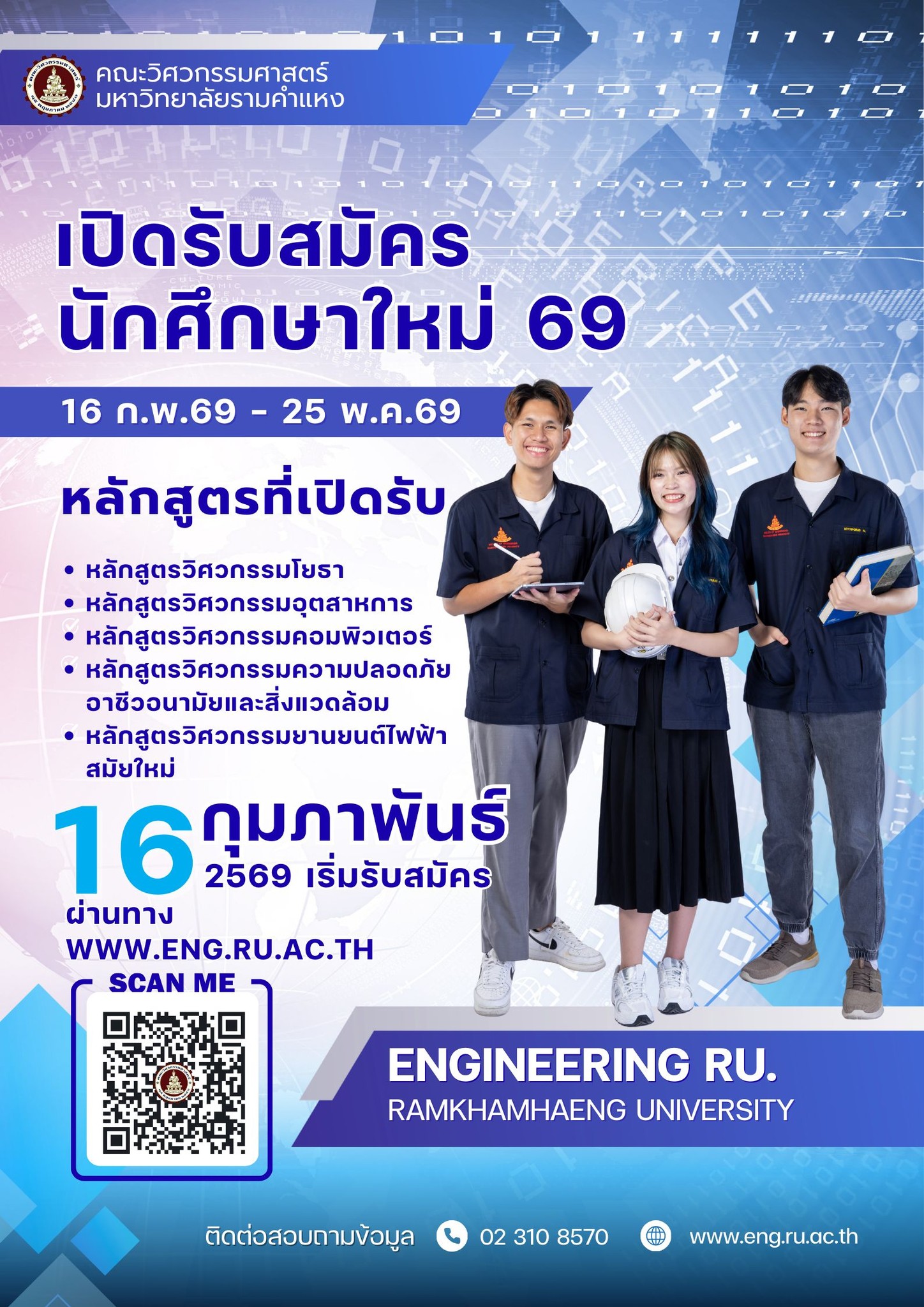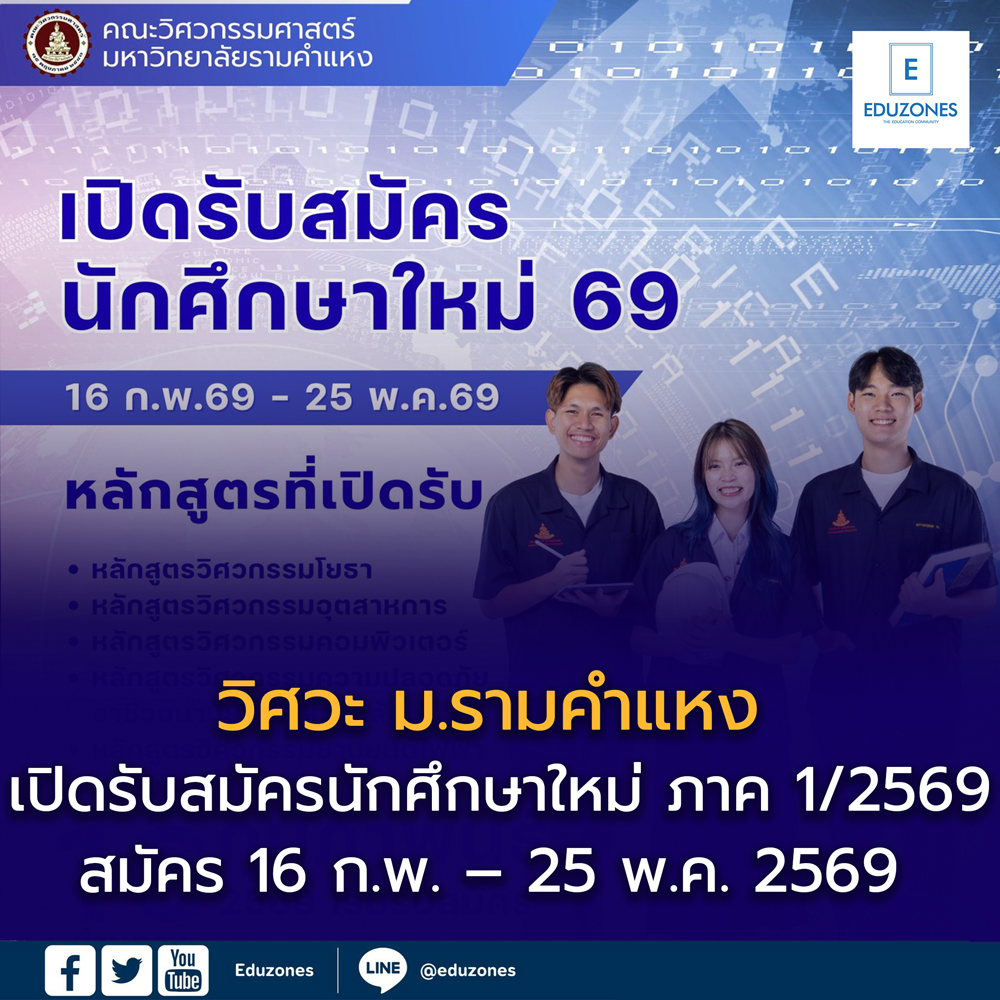 EZ Webmaster February 19, 2026 EZ Webmaster February 19, 2026 คณะวิศวกรรมศาสตร์ ม.รามคำแหง เปิดรับสมัครนักศึกษาใหม่ ภาค 1/2569 🚀 คณะวิศวกรรมศาสตร์ ม.รามคำแหง เปิดรับสมัครนักศึกษาใหม่ ภาค 1/2569 สร้างอนาคตสายวิศวกรรมยุคใหม่ เรียนจริง ปฏิบัติจริง โอกาสงานสูง คณะวิศวกรรมศาสตร์ มหาวิทยาลัยรามคำแหง ประกาศเปิดรับสมัครนักศึกษาใหม่ ระดับปริญญาตรี ภาคการศึกษาที่ 1 ปีการศึกษา 2569 สำหรับผู้ที่สนใจศึกษาต่อด้านวิศวกรรมศาสตร์และต้องการพัฒนาทักษะวิชาชีพเพื่อก้าวสู่สายงานที่มั่นคงในอนาคต 📅 เปิดรับสมัครตั้งแต่วันที่ 16 กุมภาพันธ์ – 25 พฤษภาคม 2569📝 สมัครผ่านระบบออนไลน์เท่านั้น🌐 เว็บไซต์คณะ: www.eng.ru.ac.th 🎯 สาขาวิชาที่เปิดรับสมัคร 🔹 วิศวกรรมโยธา มุ่งผลิตวิศวกรที่มีความเชี่ยวชาญด้านการออกแบบและควบคุมงานก่อสร้าง ทั้งอาคาร ถนน สะพาน และโครงสร้างพื้นฐาน รองรับการพัฒนาเมืองและโครงการขนาดใหญ่ในอนาคต 🔹 วิศวกรรมอุตสาหกรรม พัฒนาทักษะการวิเคราะห์และบริหารจัดการระบบการผลิต เพิ่มประสิทธิภาพองค์กร ลดต้นทุน และเพิ่มศักยภาพการแข่งขัน เหมาะกับอุตสาหกรรมยุคดิจิทัล 🔹 วิศวกรรมคอมพิวเตอร์ เรียนรู้ทั้งฮาร์ดแวร์และซอฟต์แวร์ การพัฒนาโปรแกรม ระบบเครือข่าย IoT และเทคโนโลยีอัจฉริยะ รองรับการเติบโตของ AI และโลกดิจิทัล 🔹 วิศวกรรมความปลอดภัย อาชีวอนามัย และสิ่งแวดล้อม ผลิตผู้เชี่ยวชาญด้านความปลอดภัยในการทำงาน การดูแลสุขภาพแรงงาน และการจัดการสิ่งแวดล้อม เพื่อการพัฒนาอย่างยั่งยืน 🔹 วิศวกรรมยานยนต์ไฟฟ้าสมัยใหม่ ตอบโจทย์อุตสาหกรรม EV เรียนรู้เทคโนโลยีรถยนต์ไฟฟ้า ระบบแบตเตอรี่ มอเตอร์ และพลังงานสะอาด เตรียมพร้อมสู่อนาคตยานยนต์พลังงานใหม่ ✨ จุดเด่นของคณะวิศวกรรมศาสตร์ ม.รามคำแหง เรียนจริง ปฏิบัติจริง พร้อมทักษะวิชาชีพ โอกาสงานสูงในหลากหลายอุตสาหกรรม เปิดโอกาสให้ทุกคนเข้าถึงการศึกษาอย่างเท่าเทียม เสริมทักษะ สร้างอาชีพ เพิ่มรายได้ในอนาคต ผู้สนใจสามารถศึกษารายละเอียดหลักสูตร คุณสมบัติผู้สมัคร และขั้นตอนการสมัครได้ที่เว็บไซต์คณะ หรือสอบถามเพิ่มเติมได้ที่ 📞 โทร. 02-310-8570 โอกาสดีสำหรับผู้ที่อยากก้าวเข้าสู่สายวิศวกรรมยุคใหม่ เริ่มต้นอนาคตของคุณได้ตั้งแต่วันนี้ ✨