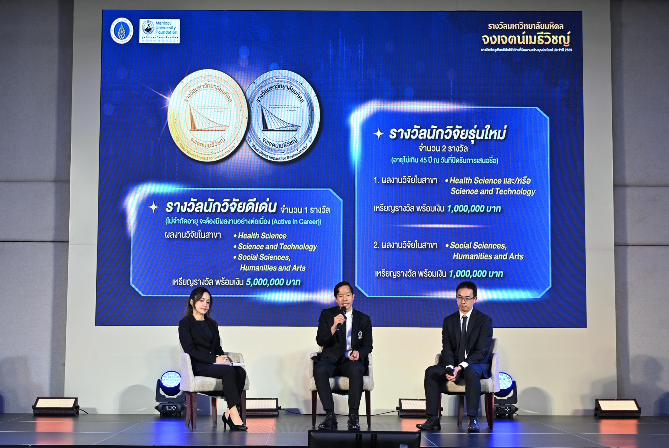 กรุงเทพฯ 24 กุมภาพันธ์ 2569 – มหาวิทยาลัยมหิดล ตอกย้ำบทบาทผู้นำด้านการวิจัยและพัฒนานวัตกรรมที่มุ่งสร้างผลลัพธ์ที่จับต้องได้ เดินหน้าจัดงาน รางวัลมหาวิทยาลัยมหิดล จงเจตน์เมธีวิชญ์” ประจำปี 2569 ต่อเนื่องเป็นปีที่ 2 เพื่อยกย่องนักวิจัยไทยที่มีผลงานโดดเด่นและสร้างผลกระทบเชิงบวกต่อประเทศ ภายใต้แนวคิด “Real World Impact for Sustainability” โดยครอบคลุม 3 สาขาหลัก ได้แก่ วิทยาศาสตร์สุขภาพ วิทยาศาสตร์และเทคโนโลยี และสังคมศาสตร์ มนุษยศาสตร์และศิลปศาสตร์ โดยมอบเงินรางวัลสูงสุด 7 ล้านบาท