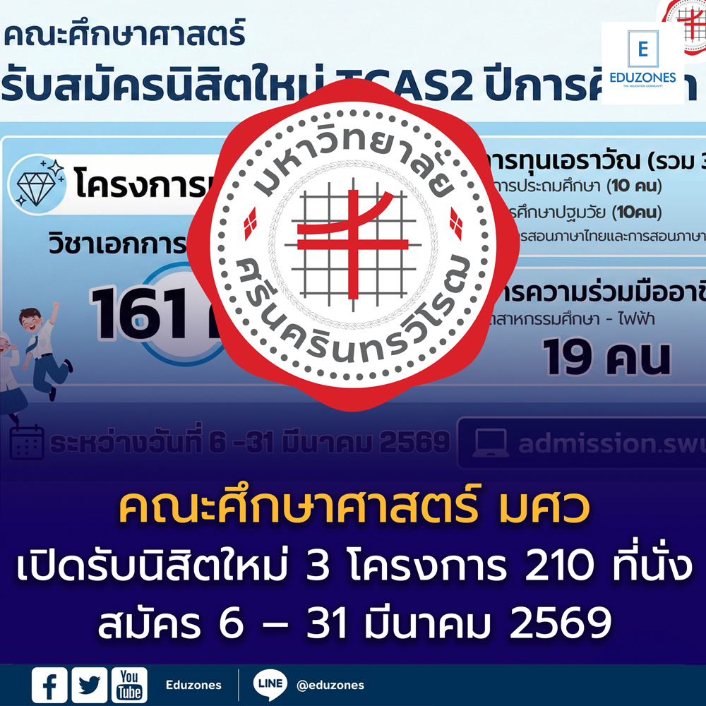 คณะศึกษาศาสตร์ มหาวิทยาลัยศรีนครินทรวิโรฒ (มศว) เปิดรับสมัครนิสิตใหม่ รอบ TCAS2 ปีการศึกษา 2569 ผ่าน 3 โครงการหลัก รวมจำนวนรับทั้งสิ้น 210 ที่นั่ง